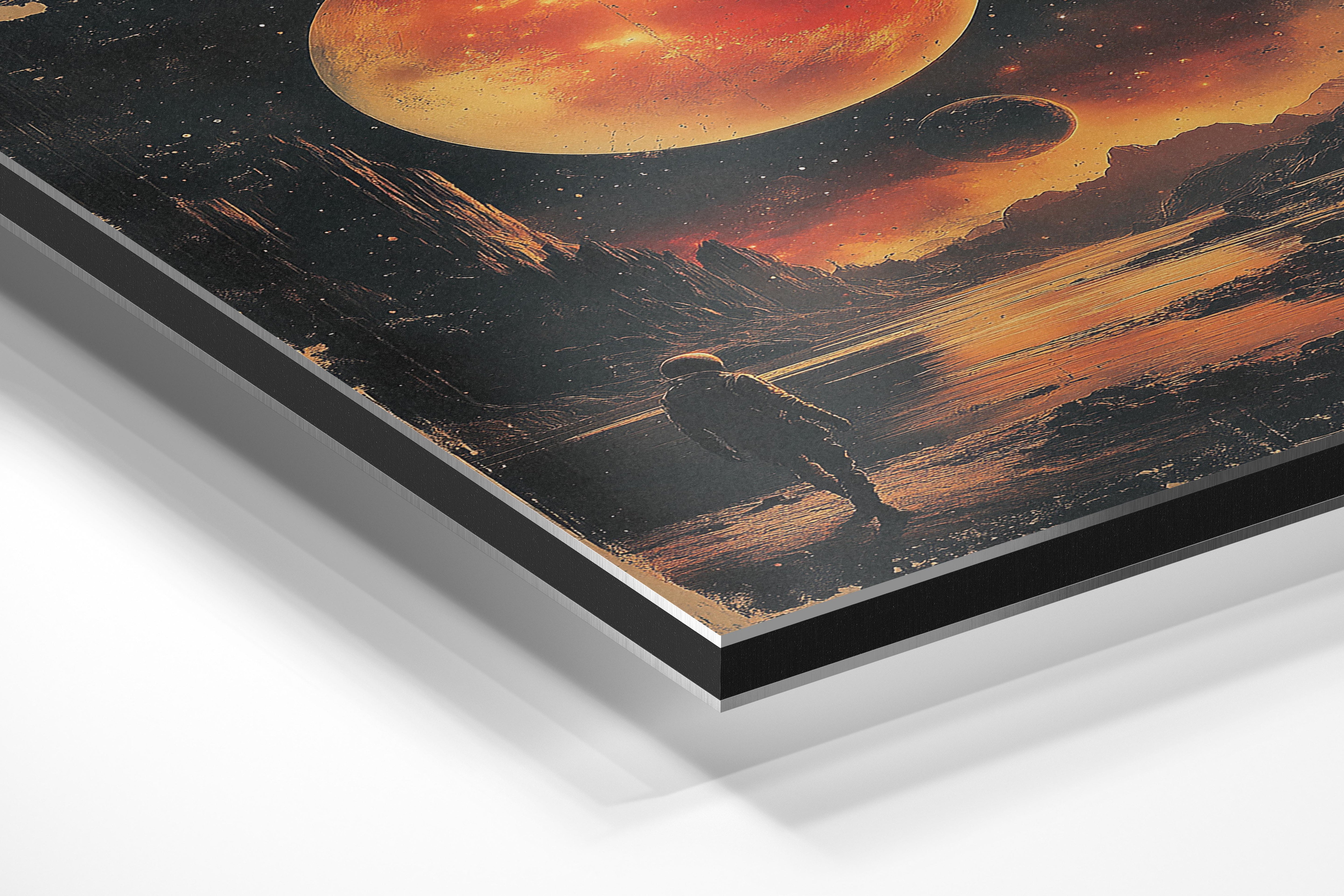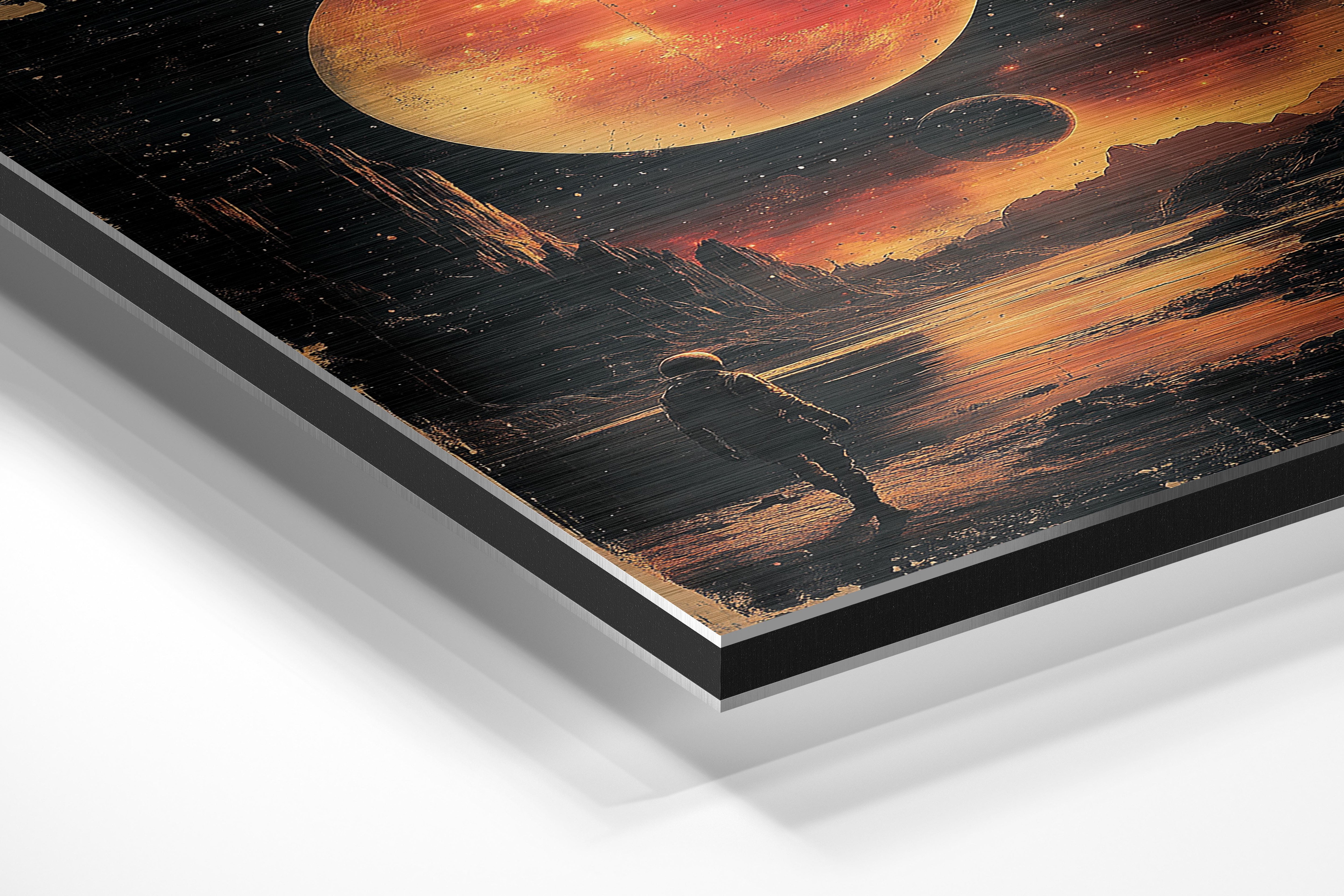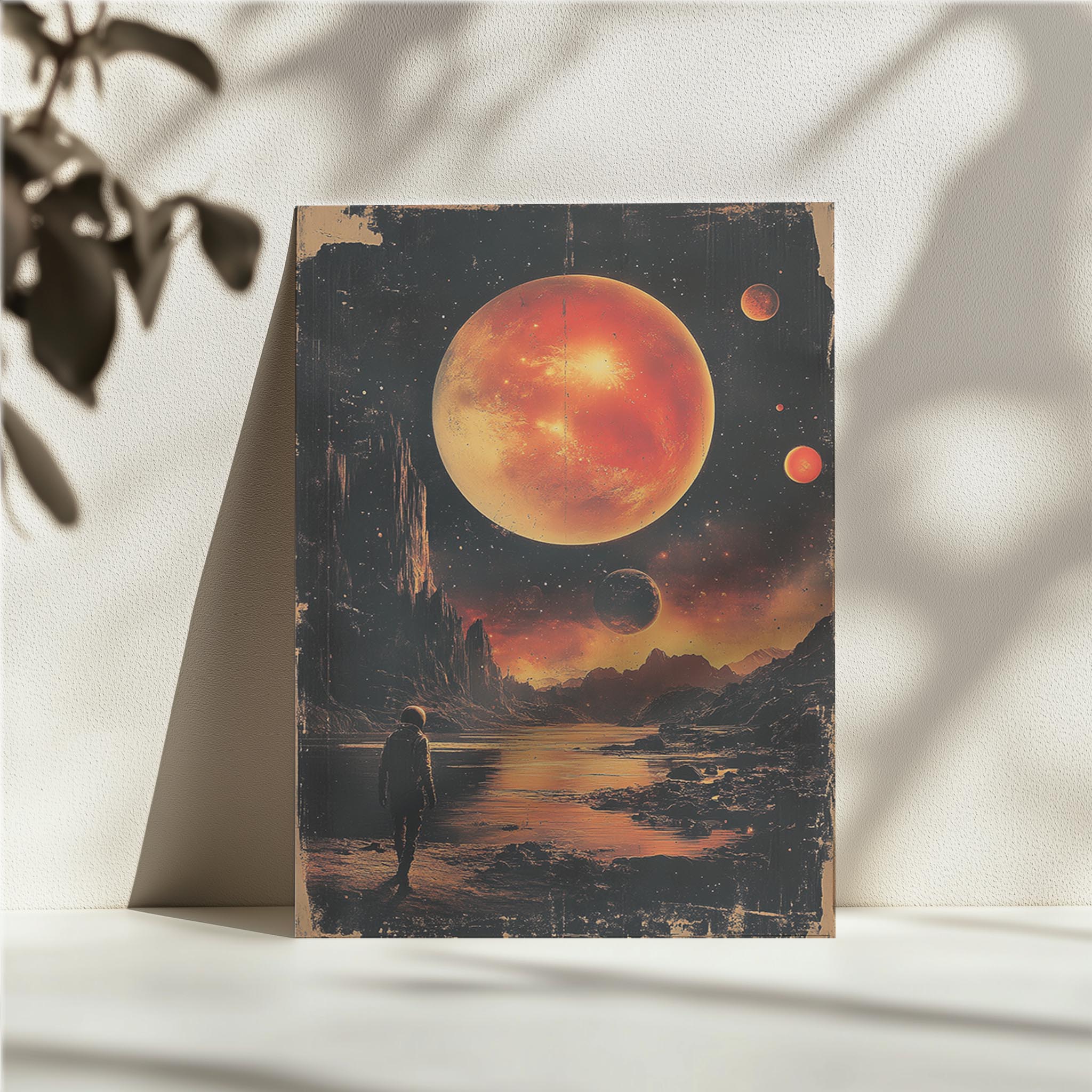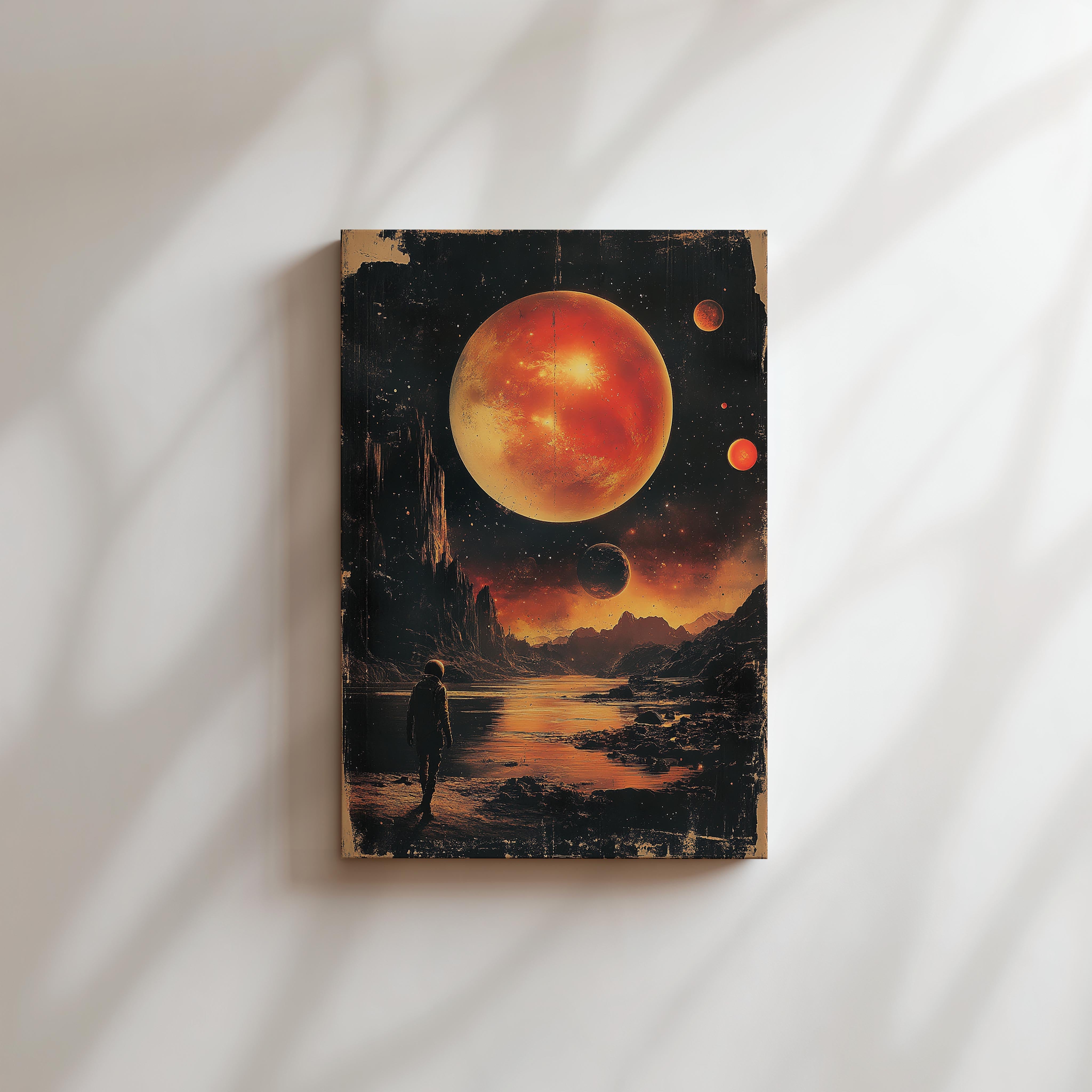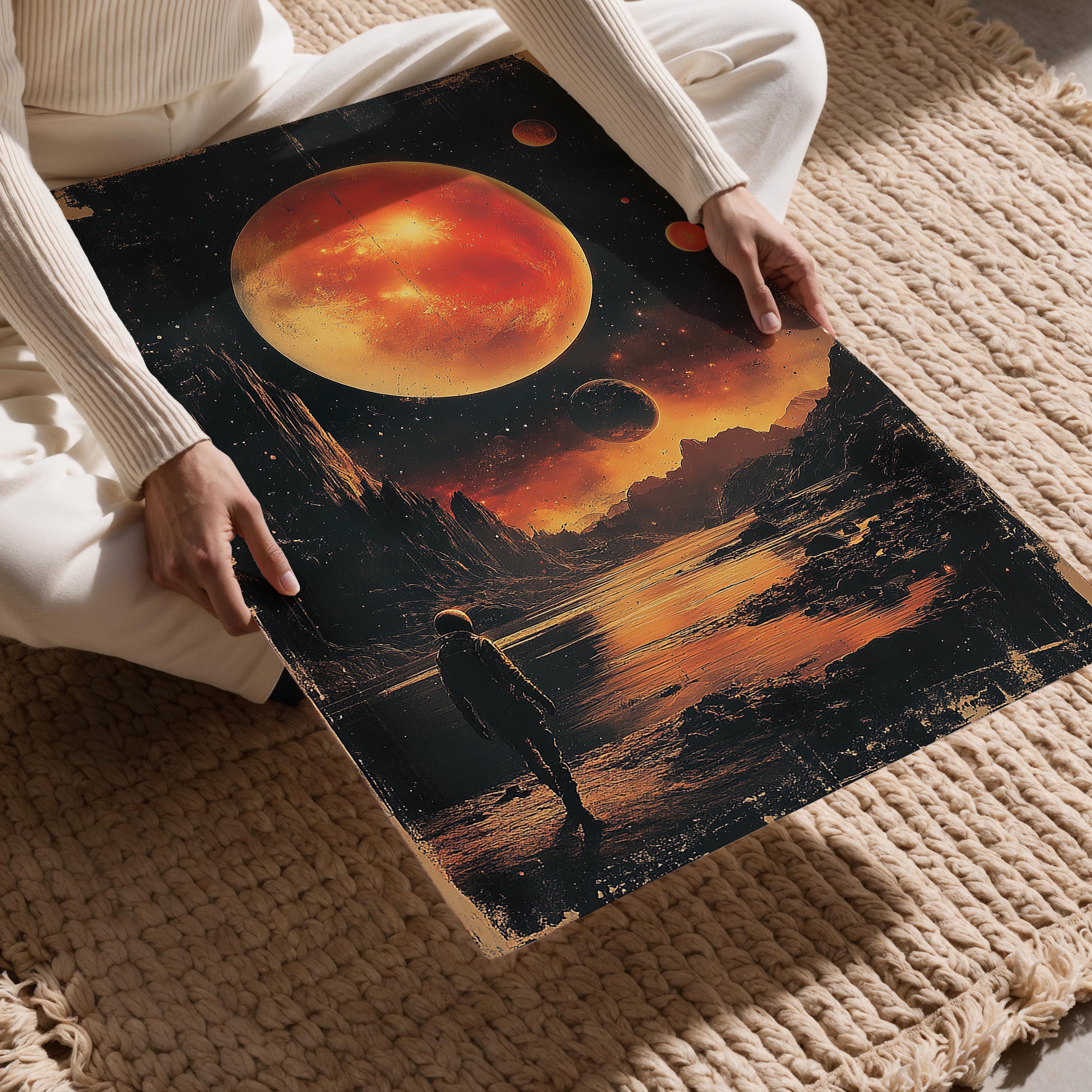 A stunning composition of an astronaut gazing at a fiery red planetary system. The rugged terrain and glowing celestial bodies evoke a sense of exploration and wonder. Perfect for science fiction enthusiasts or as a statement piece in modern homes, this artwork inspires thoughts of discovery and adventure. It fits well in offices, libraries, or galleries, offering a cinematic glimpse into humanity's quest to explore the unknown.