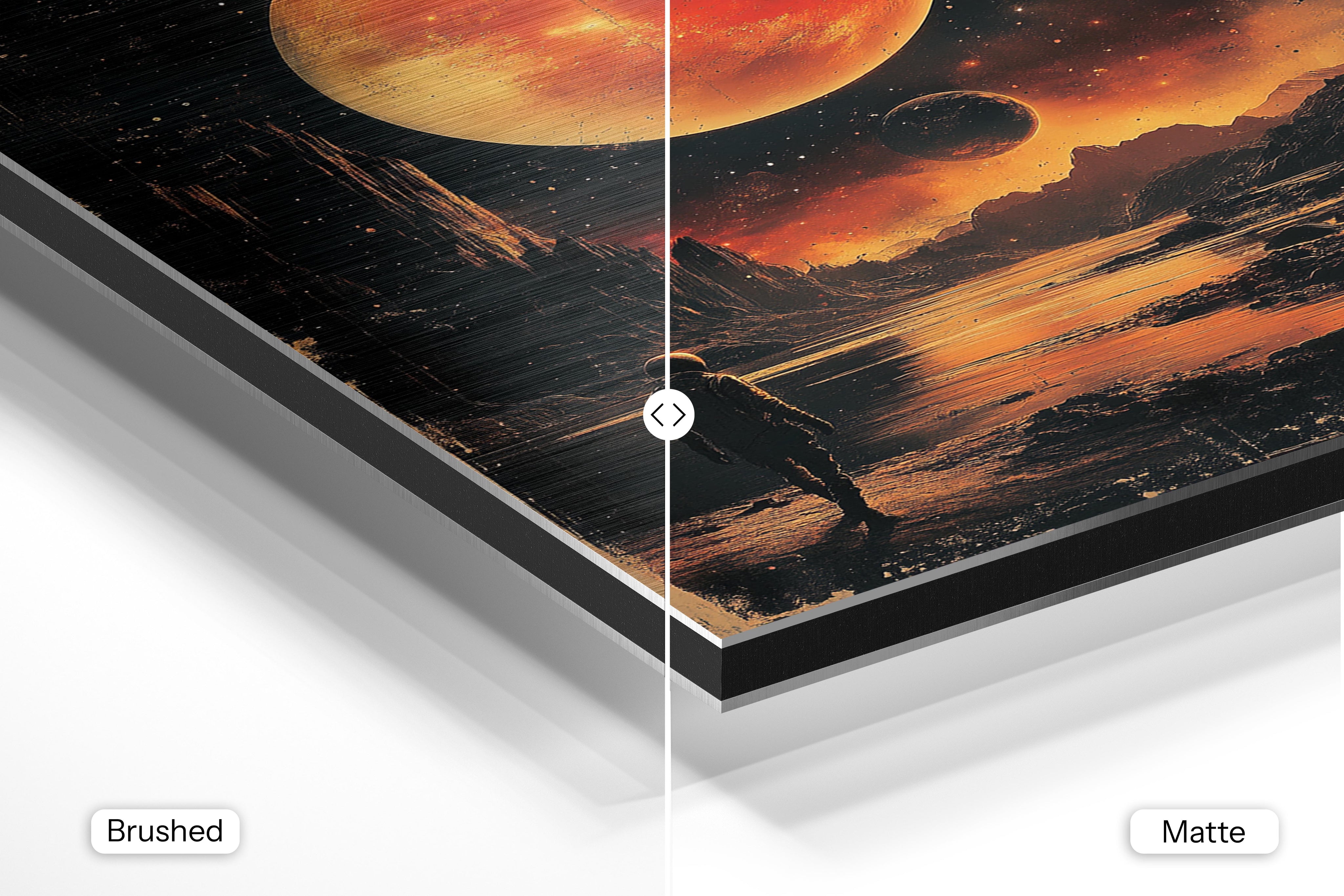 - Brushed Aluminum, on the other hand, features a raw metallic texture with visible brush strokes. Whites and highlights in your image let the silver surface show through, adding a dramatic, shimmering effect. Ideal for black-and-white images, minimalist designs, or abstract art, it creates a bold, industrial vibe with a modern edge.