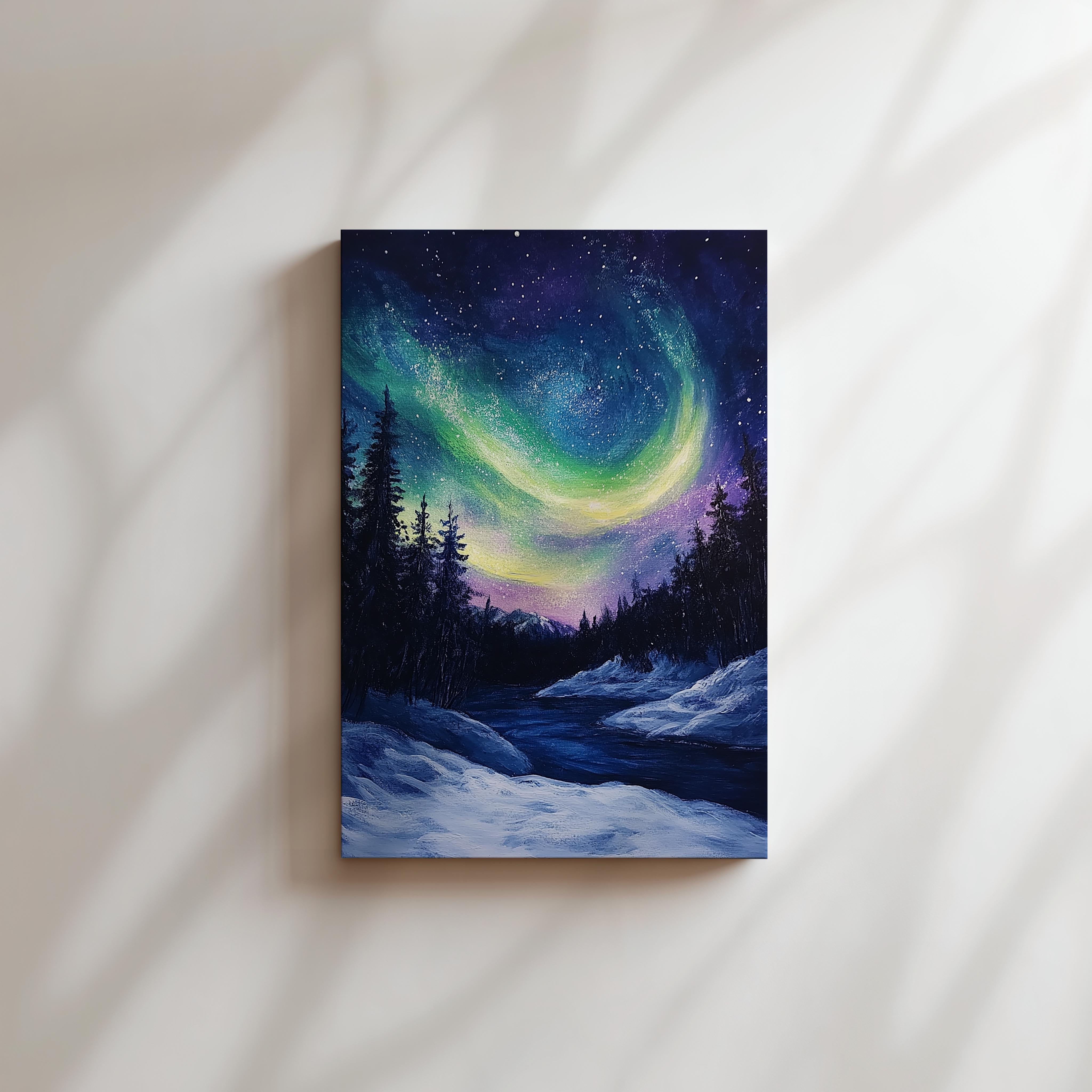 A breathtaking view of the aurora borealis illuminating a snowy forest night. The green and purple hues dance across the starry sky, creating a captivating spectacle of natural beauty. This image captures the pristine stillness of winter while highlighting the ethereal glow of the Northern Lights. Perfect for inspiring awe and connecting with the grandeur of nature's wonders. An ideal representation of the Arctic's serene, otherworldly charm that appeals to travelers and dreamers alike.