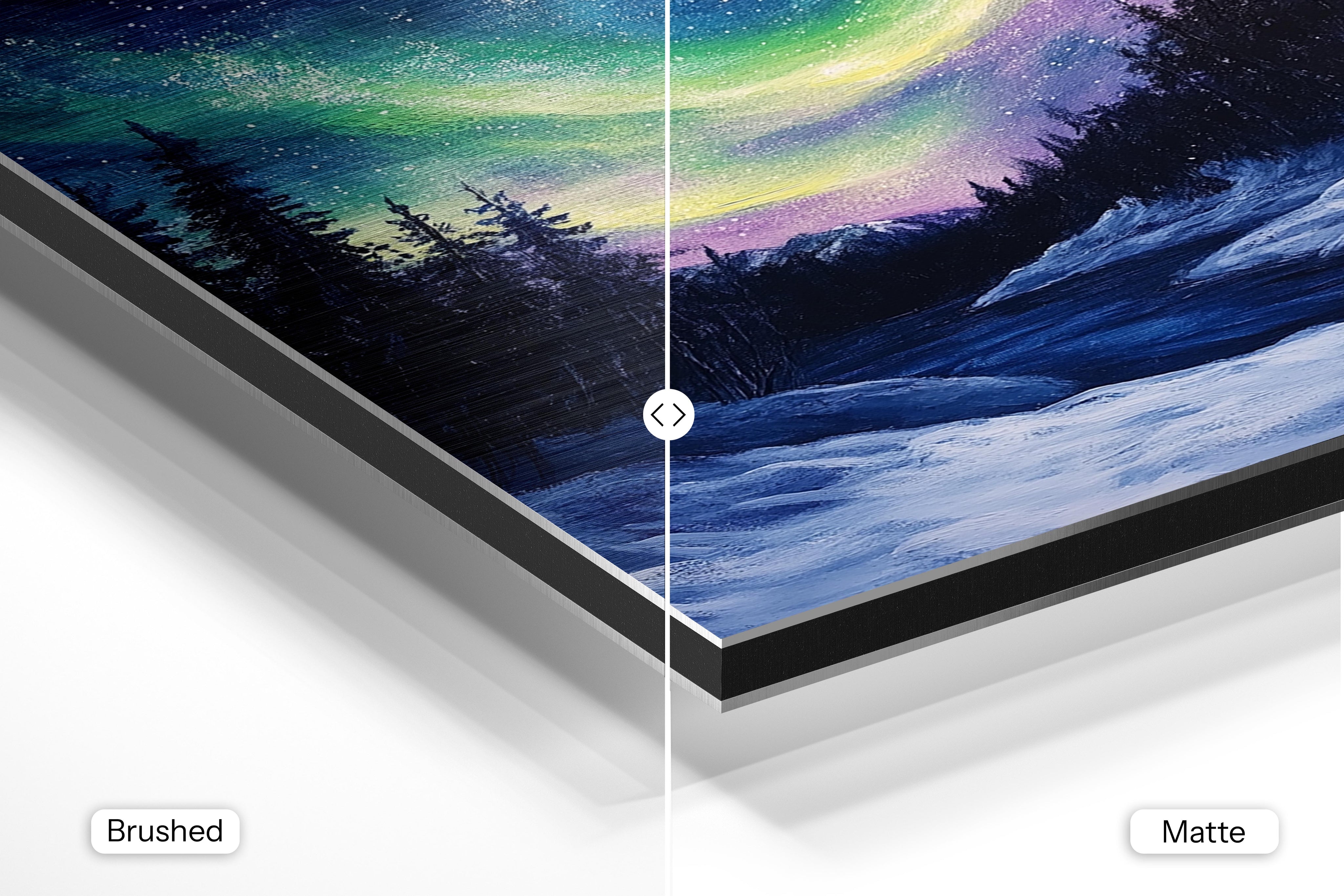- Brushed Aluminum, on the other hand, features a raw metallic texture with visible brush strokes. Whites and highlights in your image let the silver surface show through, adding a dramatic, shimmering effect. Ideal for black-and-white images, minimalist designs, or abstract art, it creates a bold, industrial vibe with a modern edge.