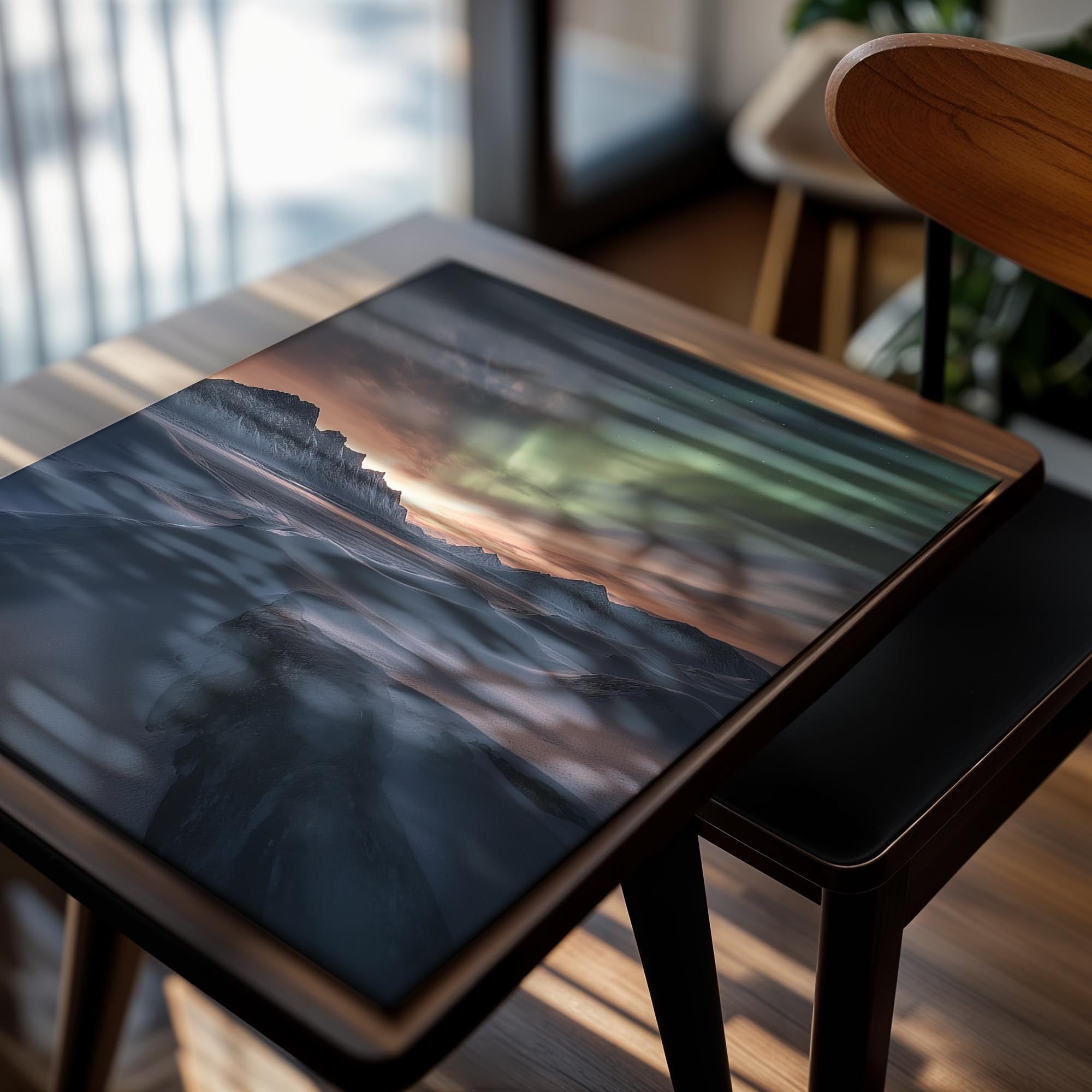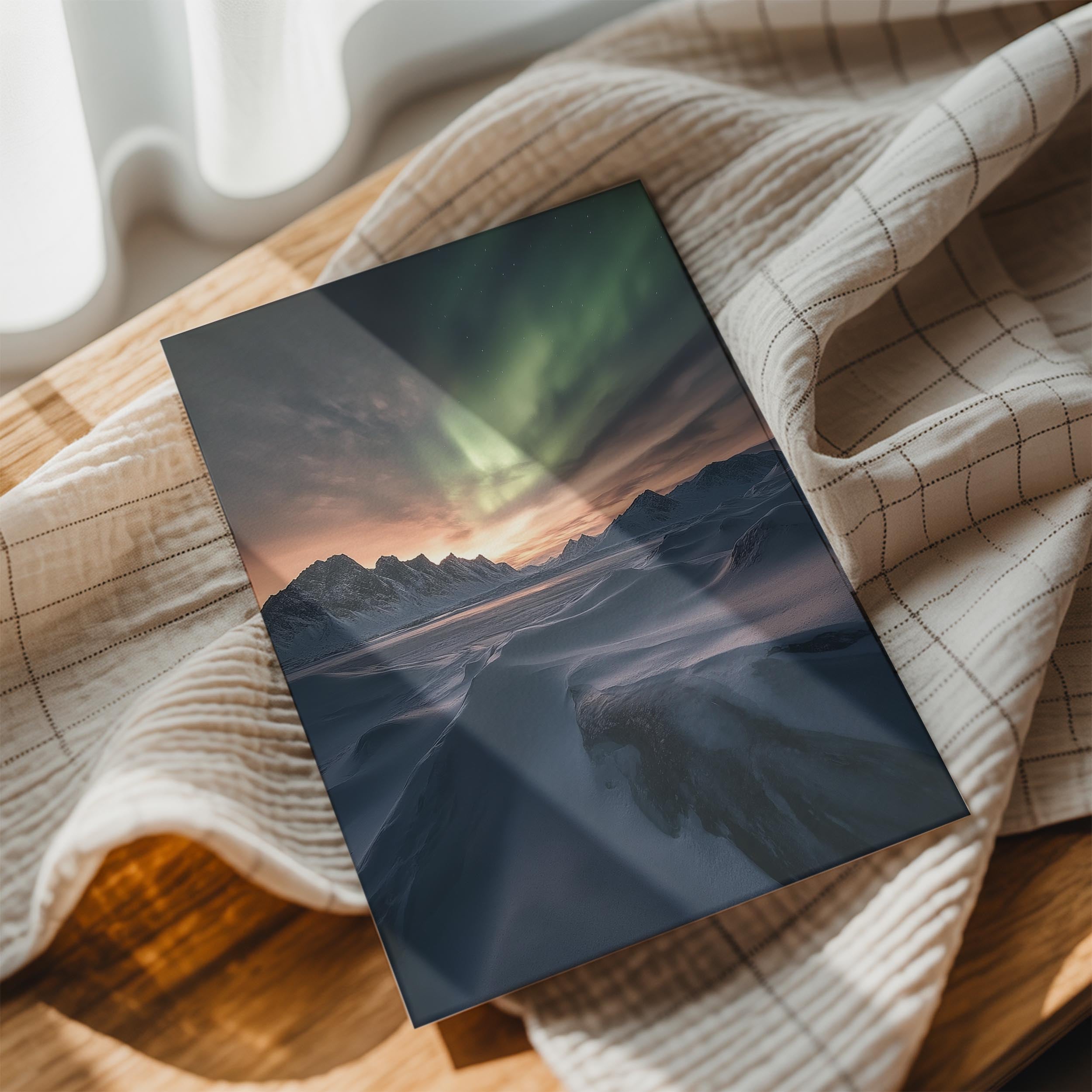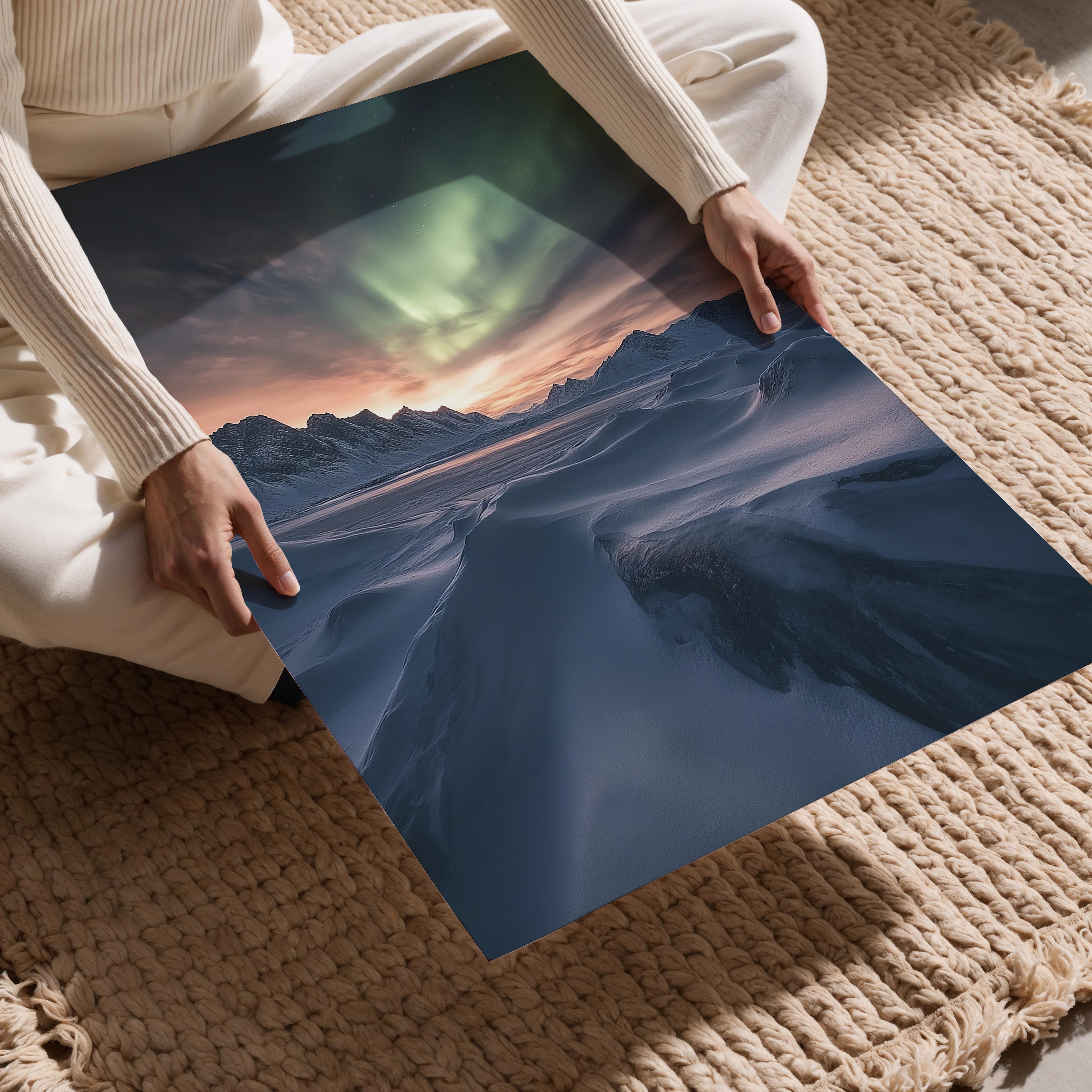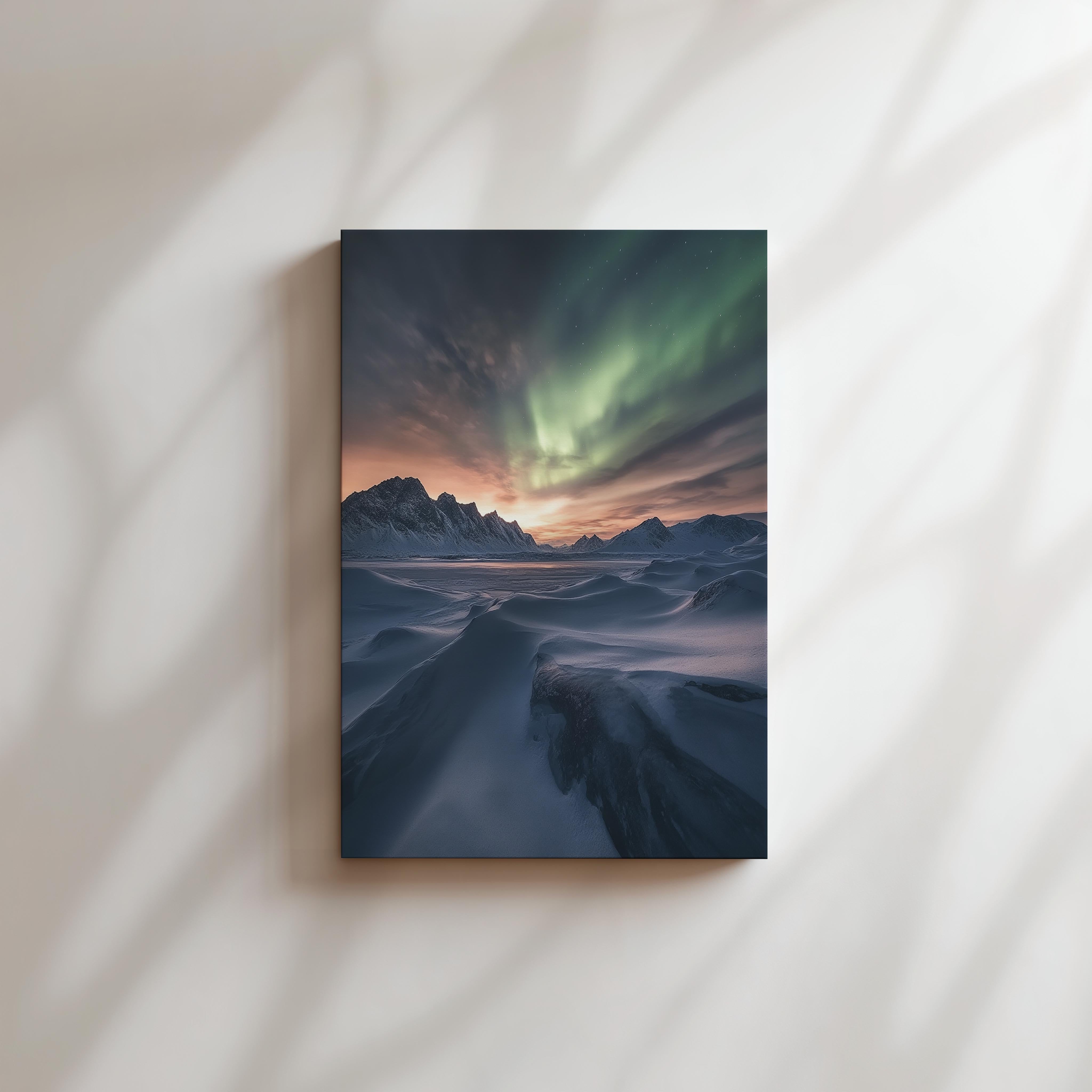 An enchanting vision of the northern lights dancing over a vast, untouched winter landscape. The snow-covered dunes create a surreal and almost otherworldly foreground, leading toward a dramatic mountain range in the distance. The sky glows with the mesmerizing greens of the aurora borealis, blending seamlessly with the soft oranges and purples of the fading twilight. This artwork captures the magic of winter nights in the Arctic, making it a perfect piece for those who appreciate natural wonders, celestial beauty, and vast, open spaces. Ideal for minimalist, modern, or Scandinavian-inspired interiors, adding both serenity and a sense of adventure to any room.