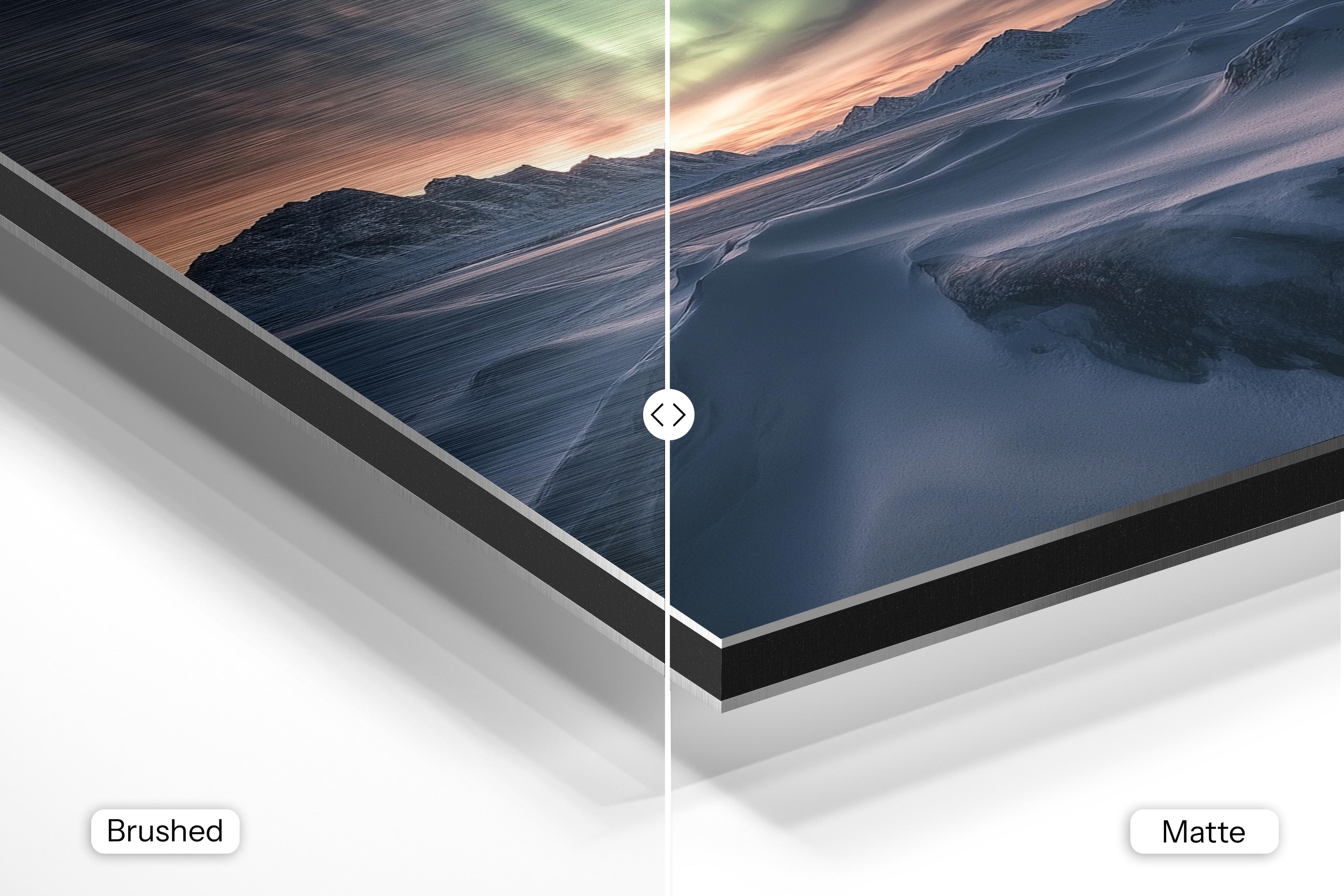 - Brushed Aluminum, on the other hand, features a raw metallic texture with visible brush strokes. Whites and highlights in your image let the silver surface show through, adding a dramatic, shimmering effect. Ideal for black-and-white images, minimalist designs, or abstract art, it creates a bold, industrial vibe with a modern edge.