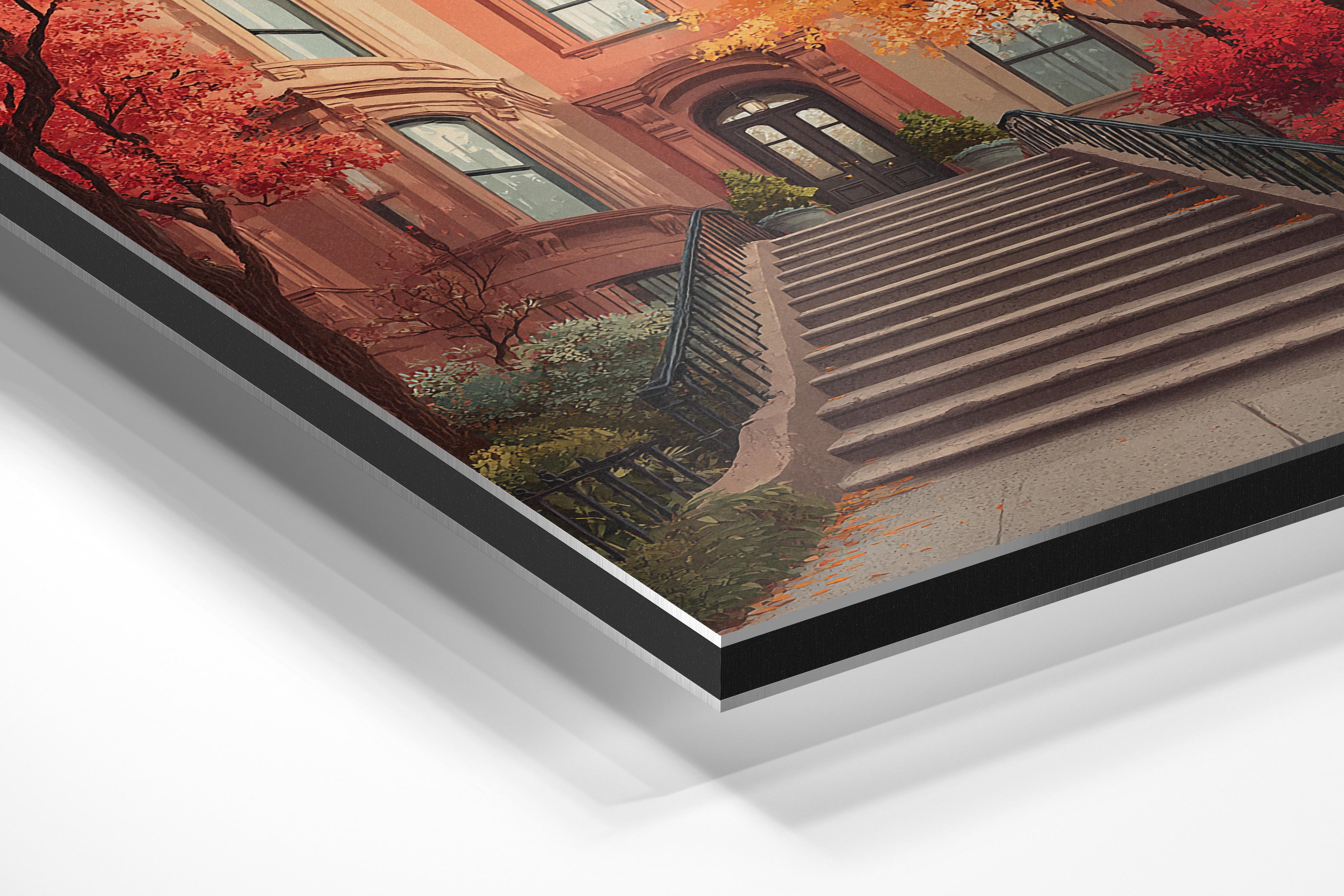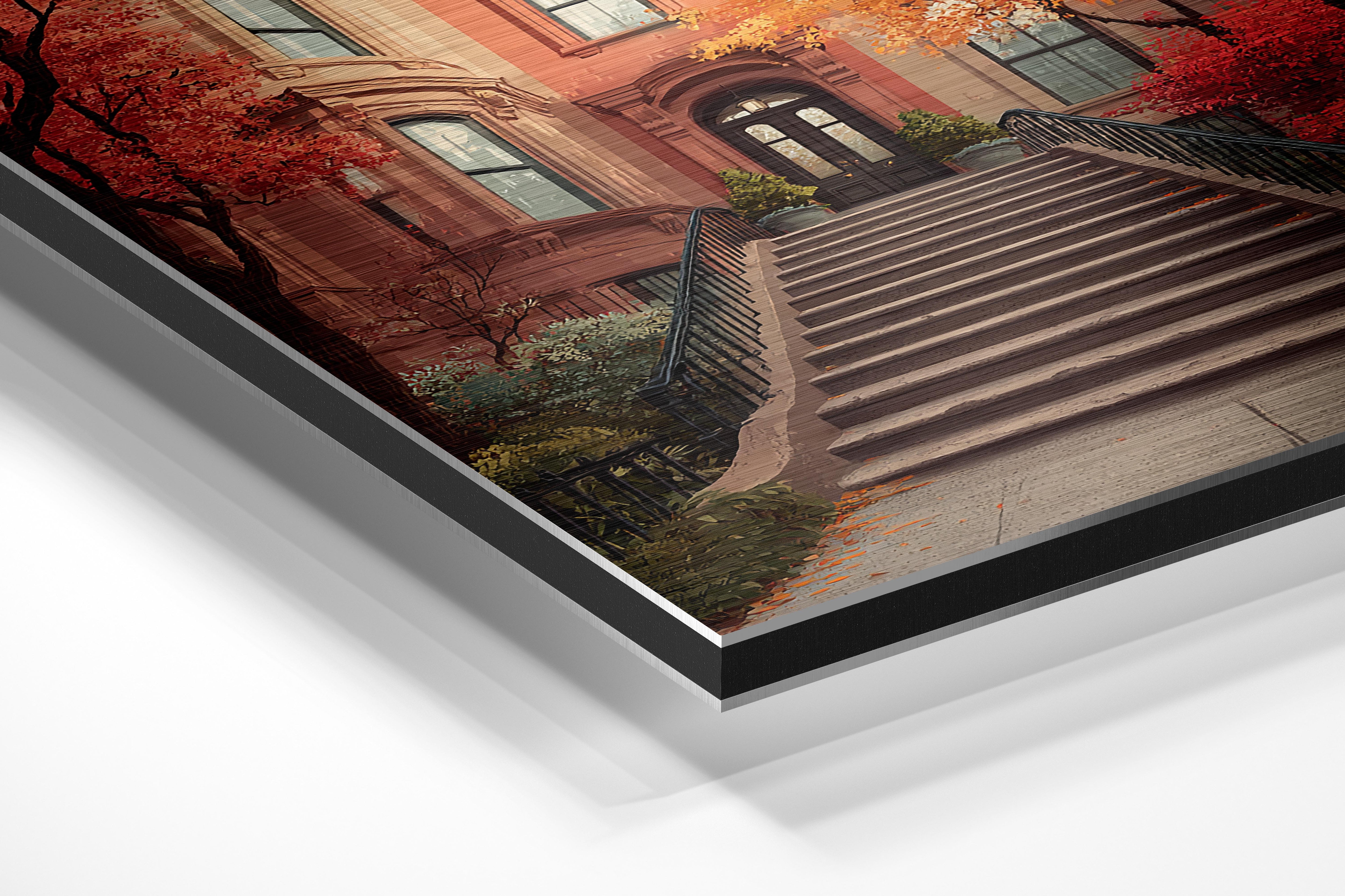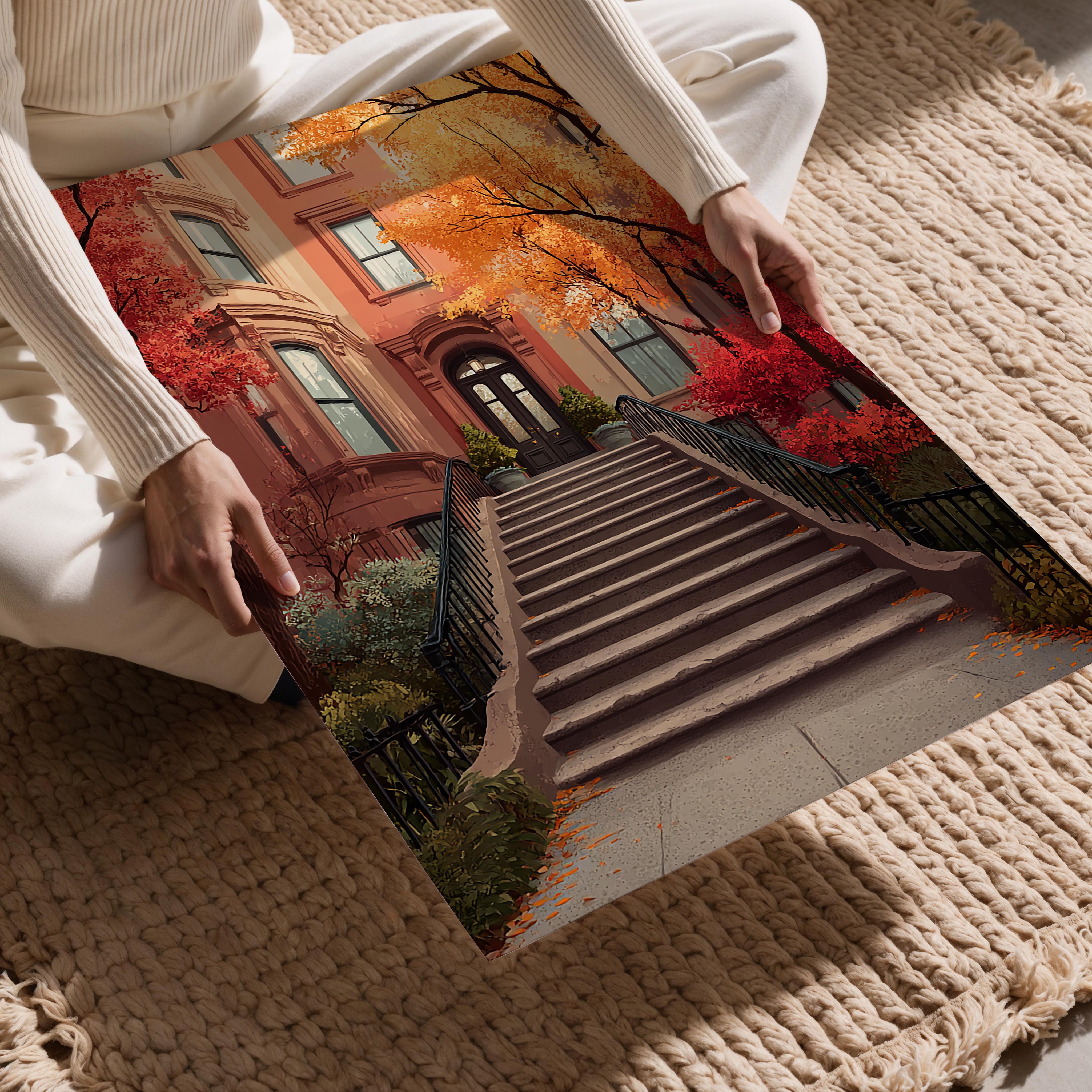 An elegant brownstone entrance is framed by fiery autumn trees in red, orange, and yellow hues. The wide stone staircase leads the eye to a stately black door, suggesting classic urban sophistication with a seasonal touch. This scene is brimming with charm, character, and nostalgic warmth, making it ideal for hallway art, real estate offices, or fall-themed seasonal decor. The contrast between architectural details and vivid natural colors makes it both grounded and lively.