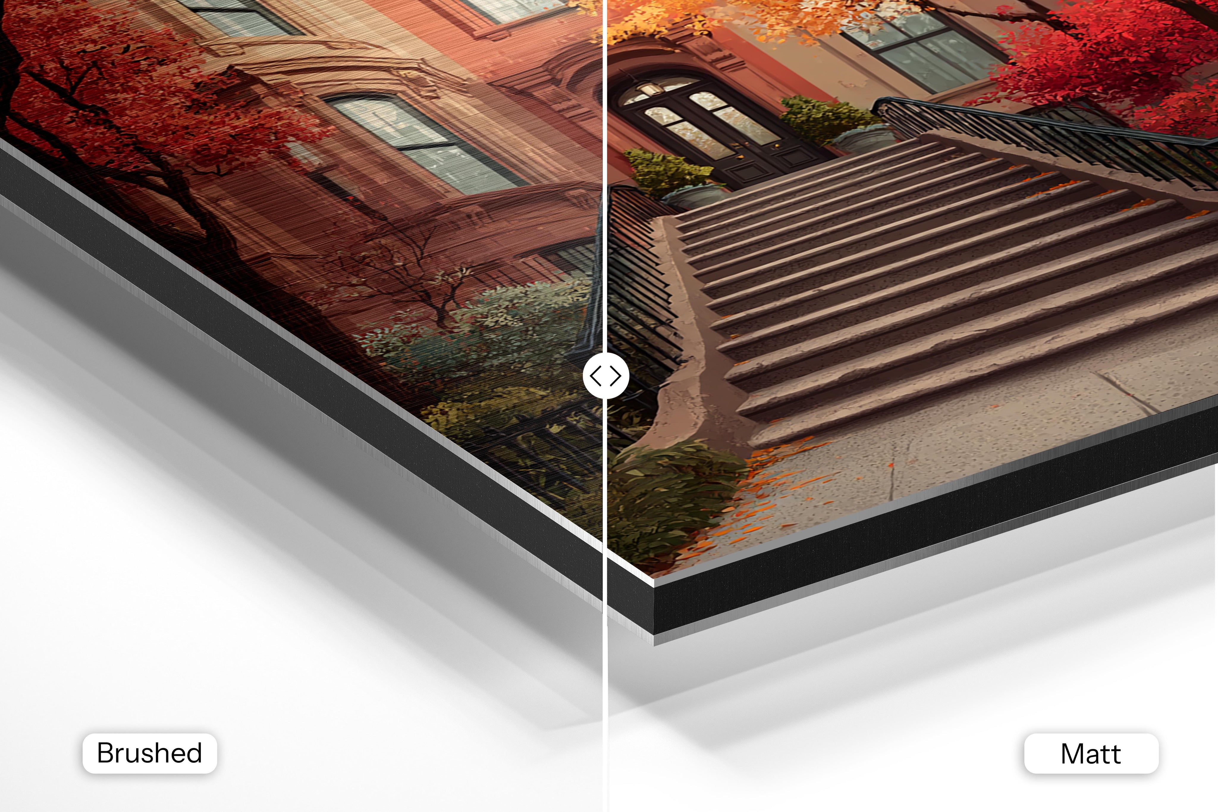 - Brushed Aluminum, on the other hand, features a raw metallic texture with visible brush strokes. Whites and highlights in your image let the silver surface show through, adding a dramatic, shimmering effect. Ideal for black-and-white images, minimalist designs, or abstract art, it creates a bold, industrial vibe with a modern edge.