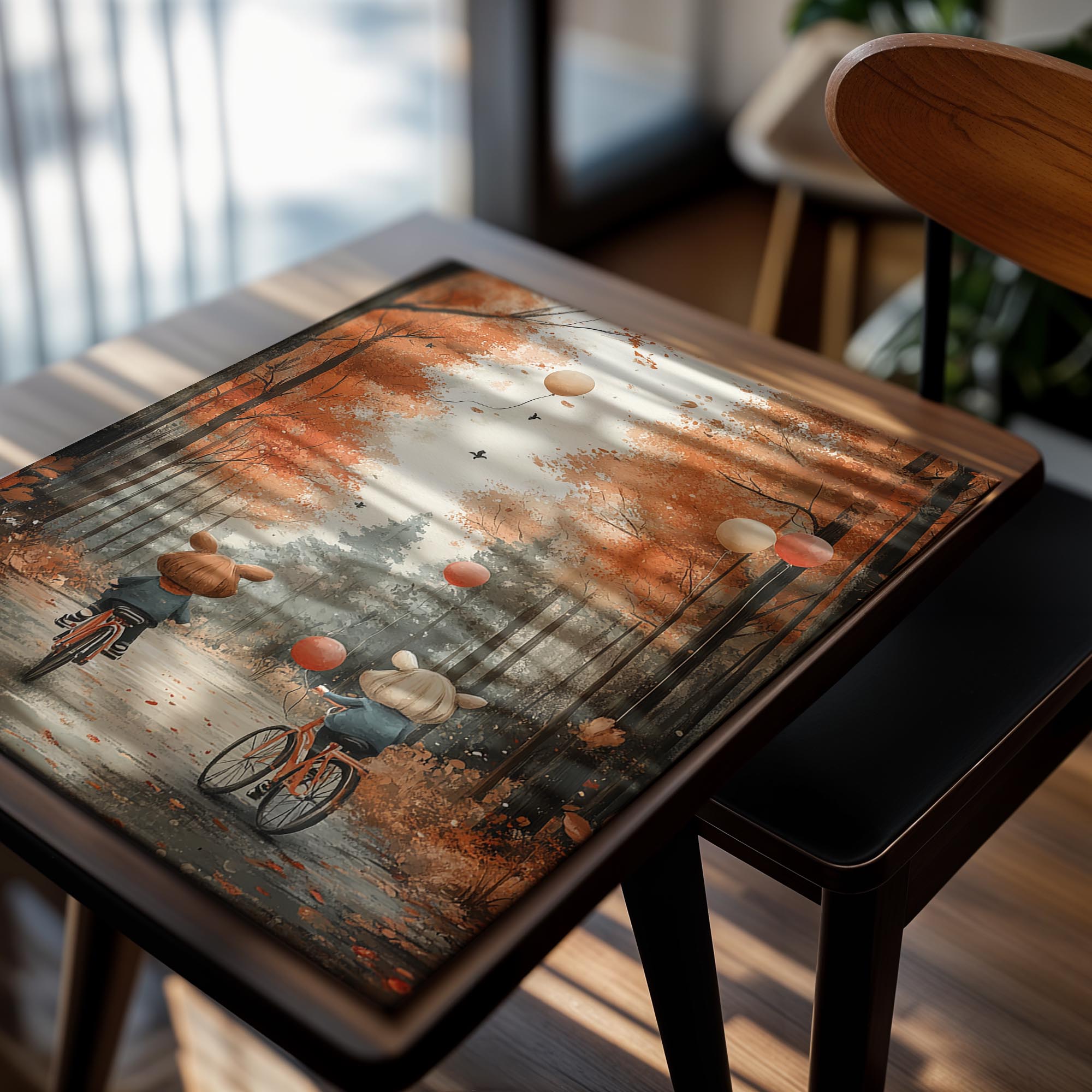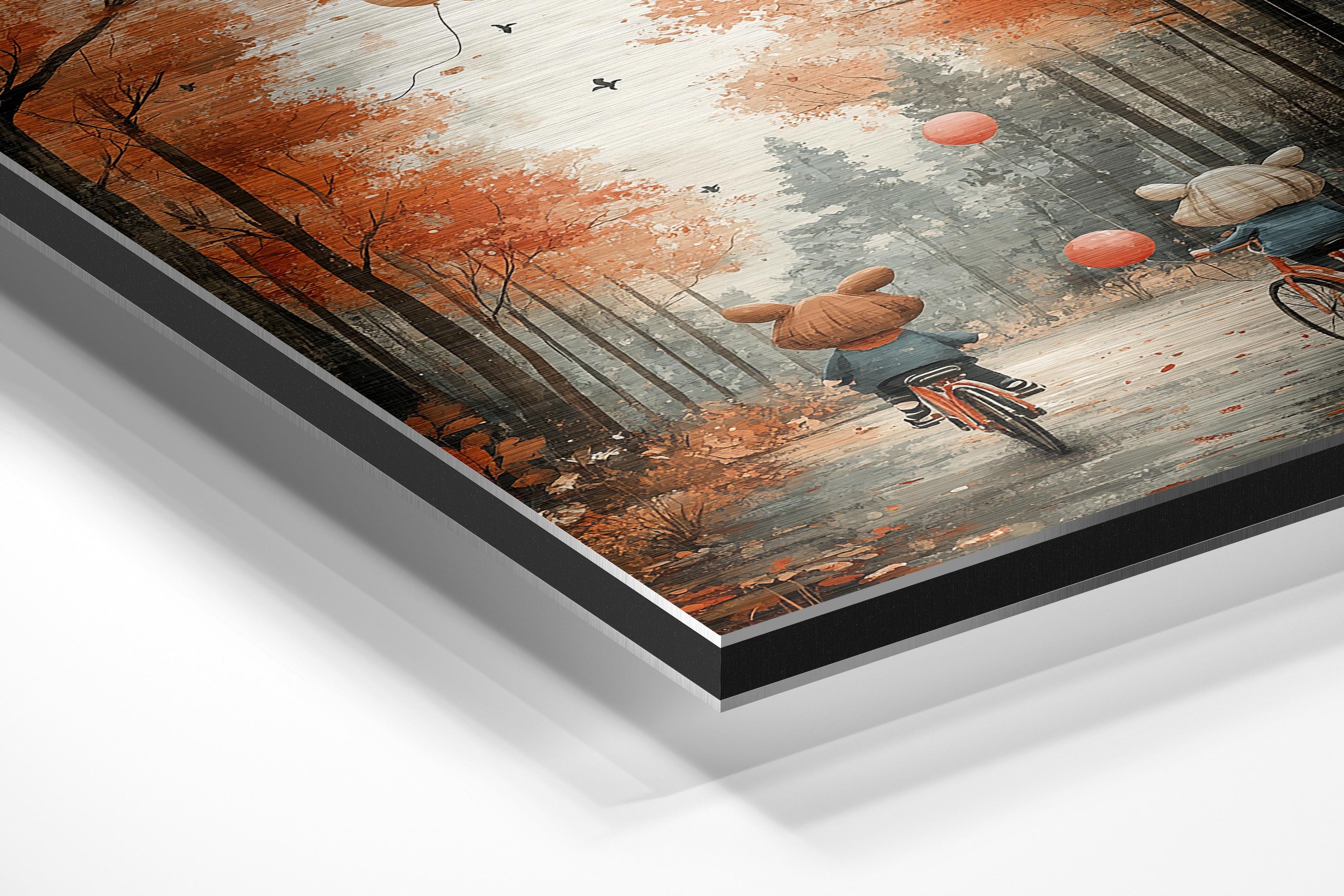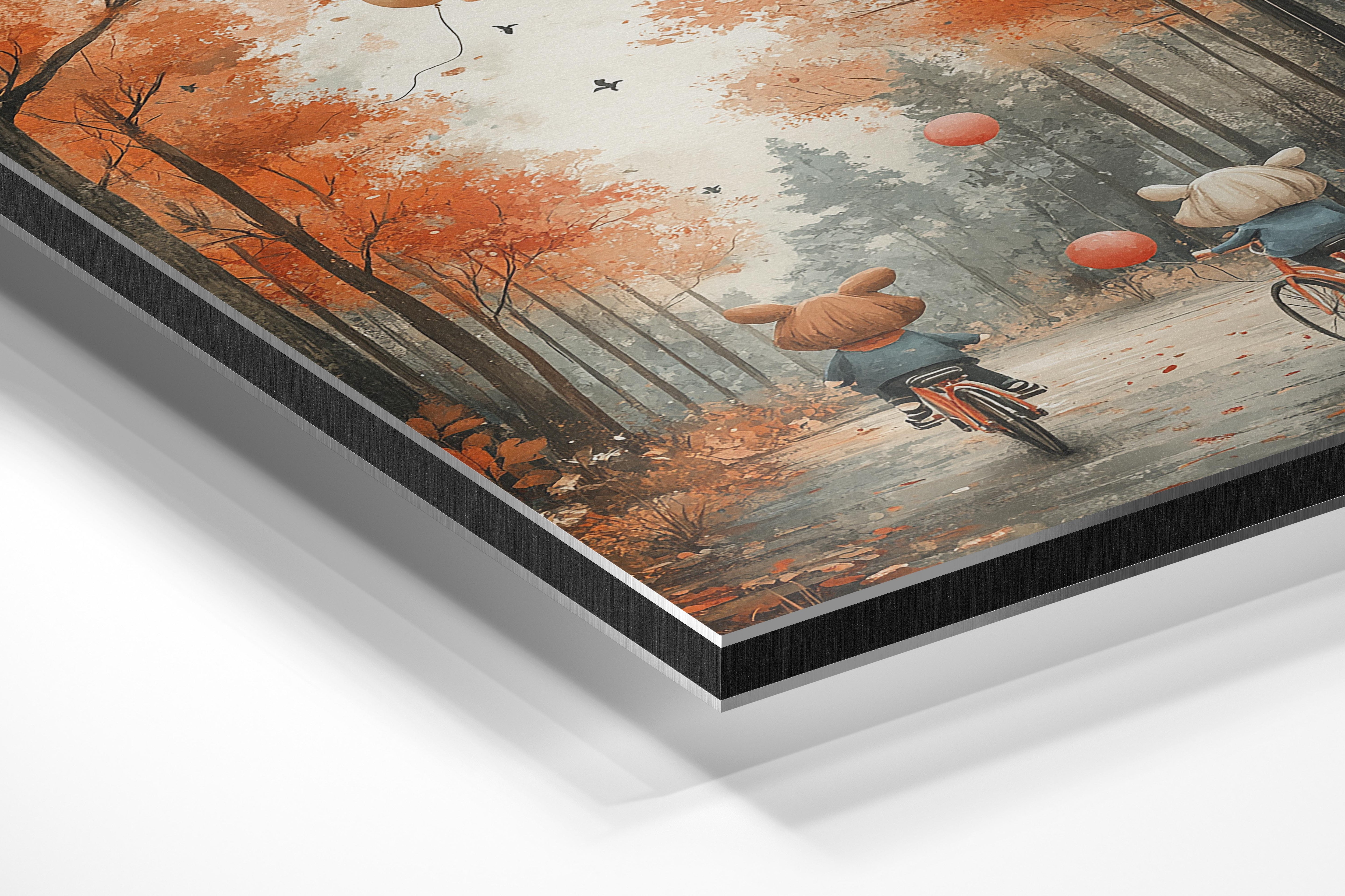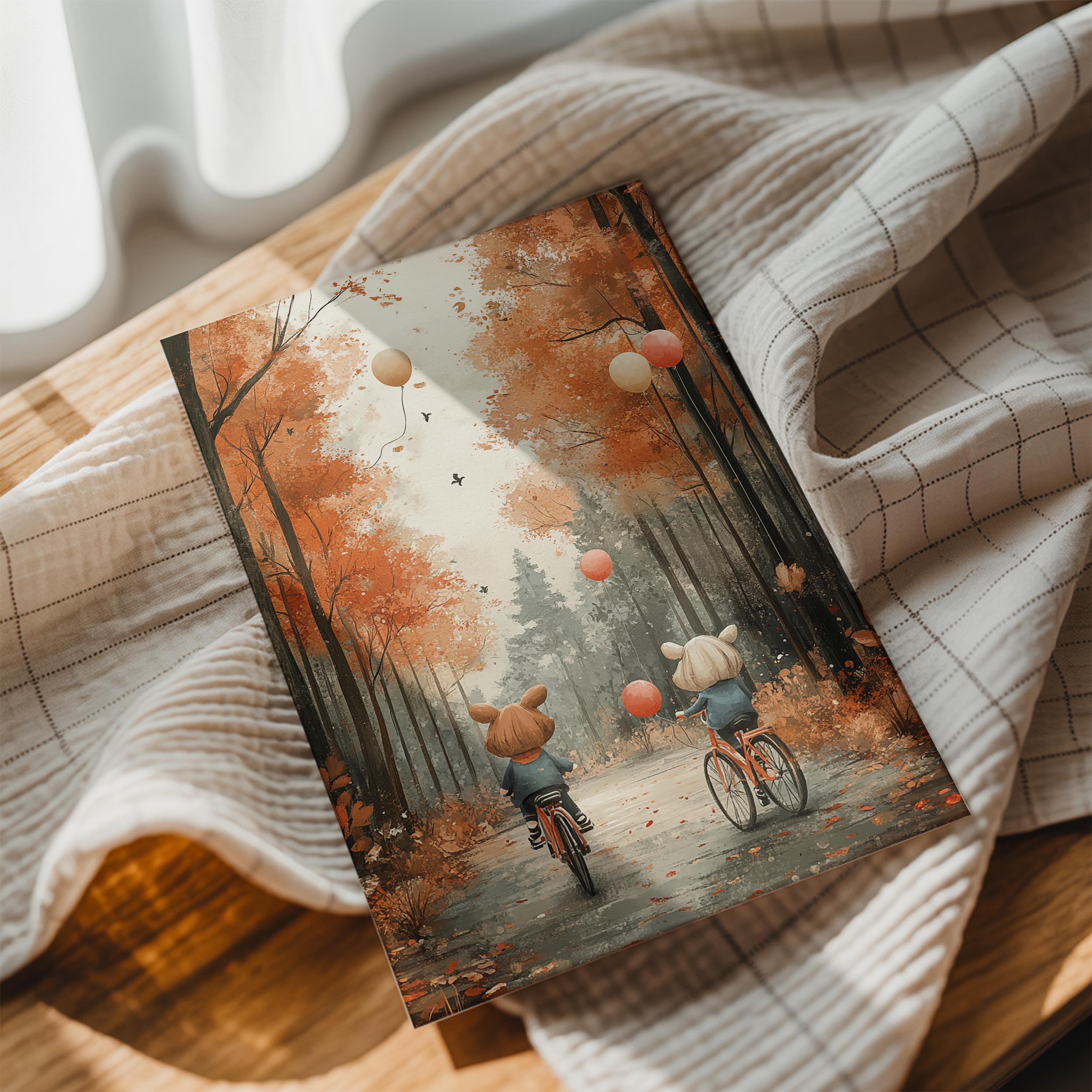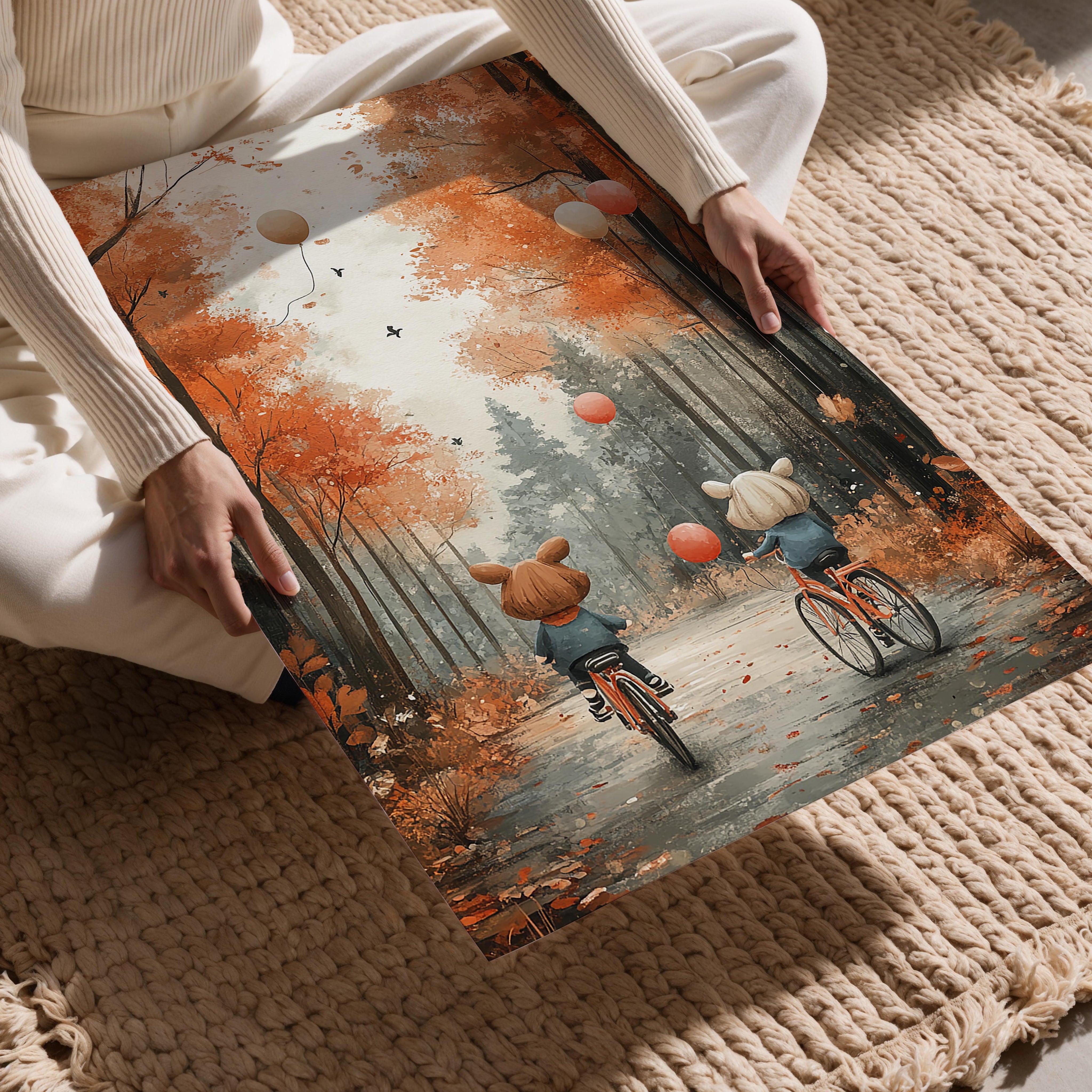 A serene autumnal scene featuring two adorable characters riding bicycles down a leaf-covered path. The vibrant hues of orange and red foliage set a cozy, nostalgic tone. Balloons gently floating in the background add an element of whimsy, making this artwork perfect for a child’s room, play area, or even a fall-themed living space. The charming characters and warm tones make it an inviting piece that encourages viewers to recall the simple joys of life. It’s a celebration of nature’s beauty in the fall and the companionship of shared adventures, ideal for creating a warm and happy atmosphere.