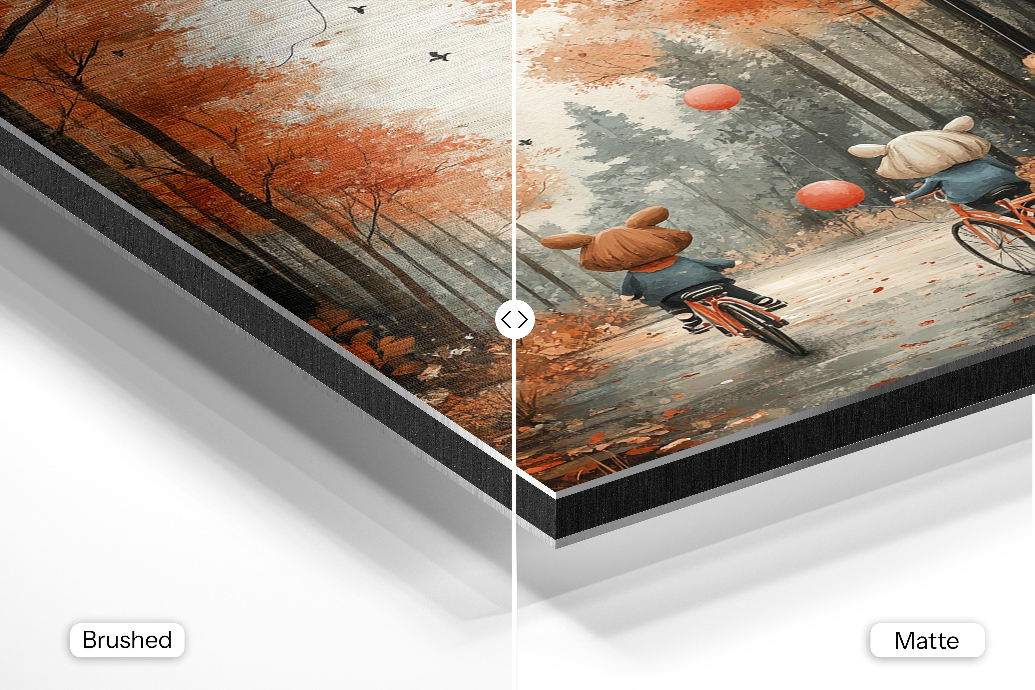 - Brushed Aluminum, on the other hand, features a raw metallic texture with visible brush strokes. Whites and highlights in your image let the silver surface show through, adding a dramatic, shimmering effect. Ideal for black-and-white images, minimalist designs, or abstract art, it creates a bold, industrial vibe with a modern edge.