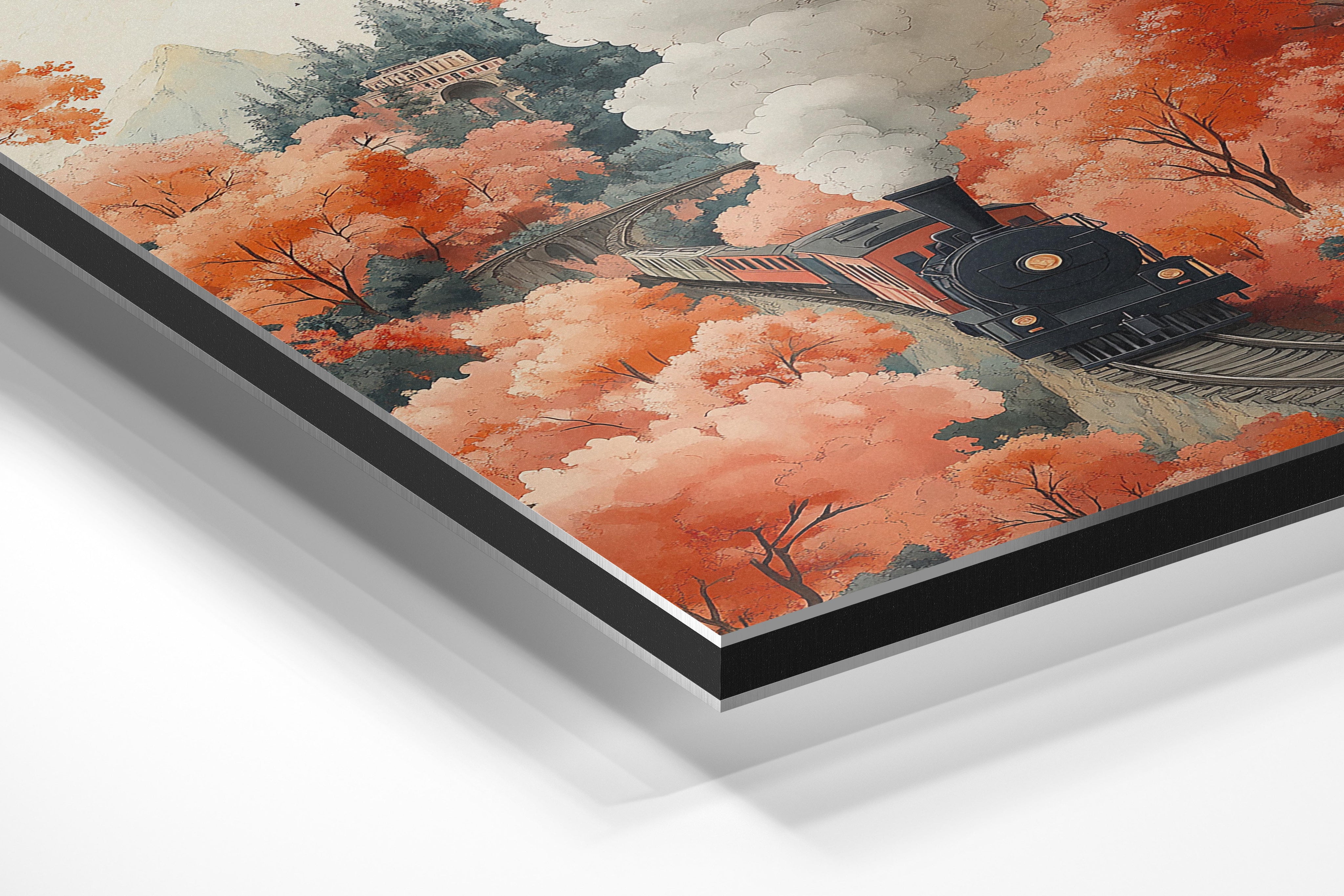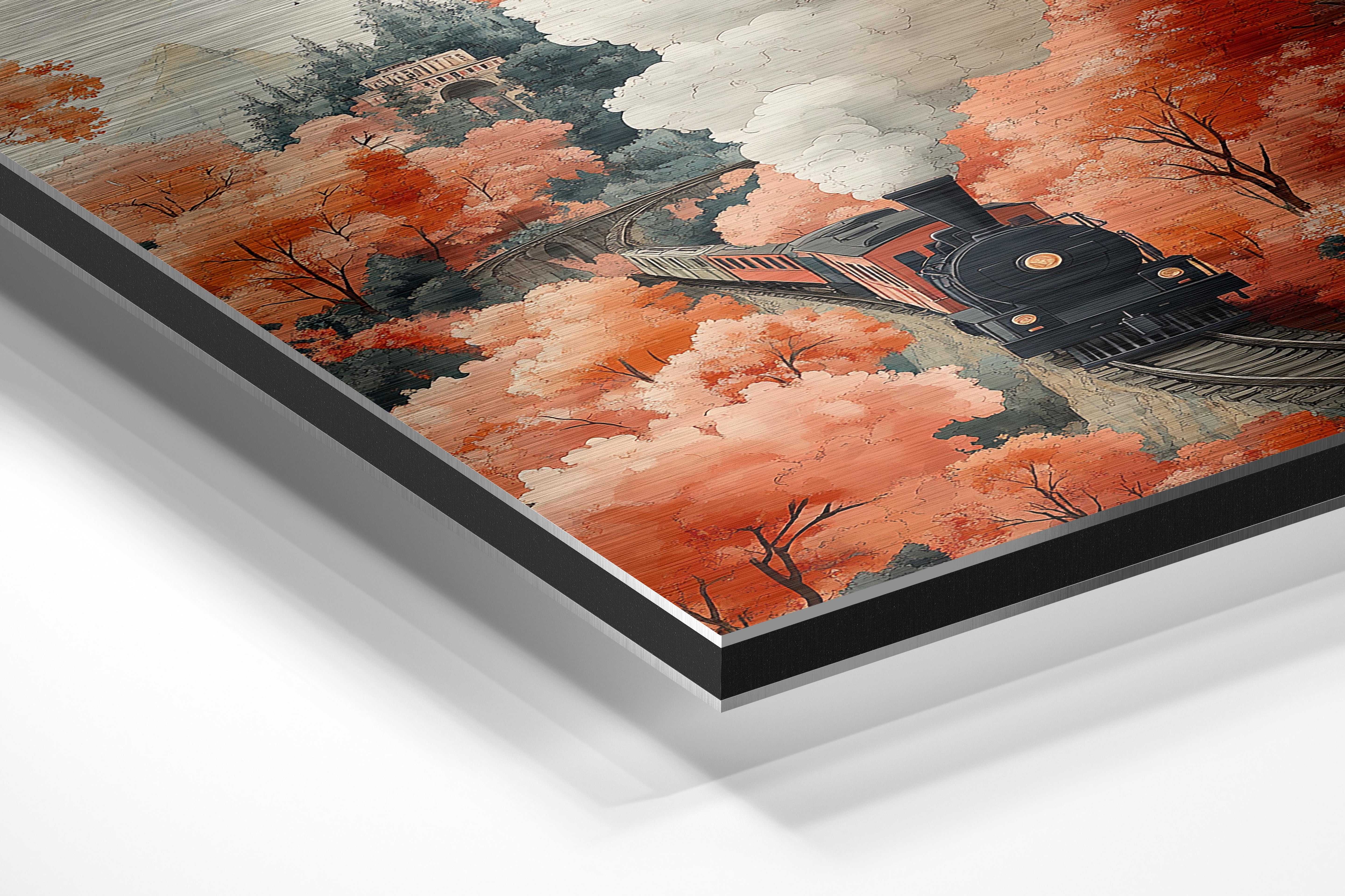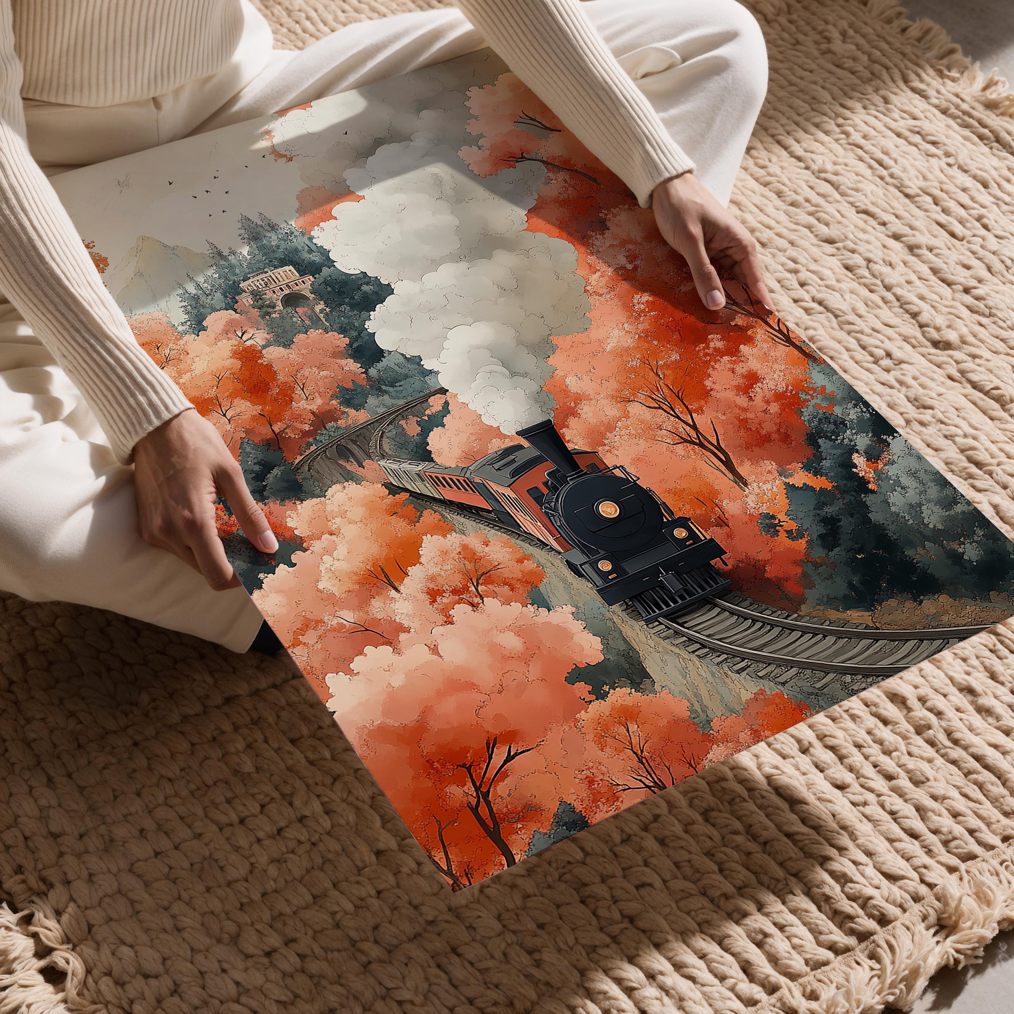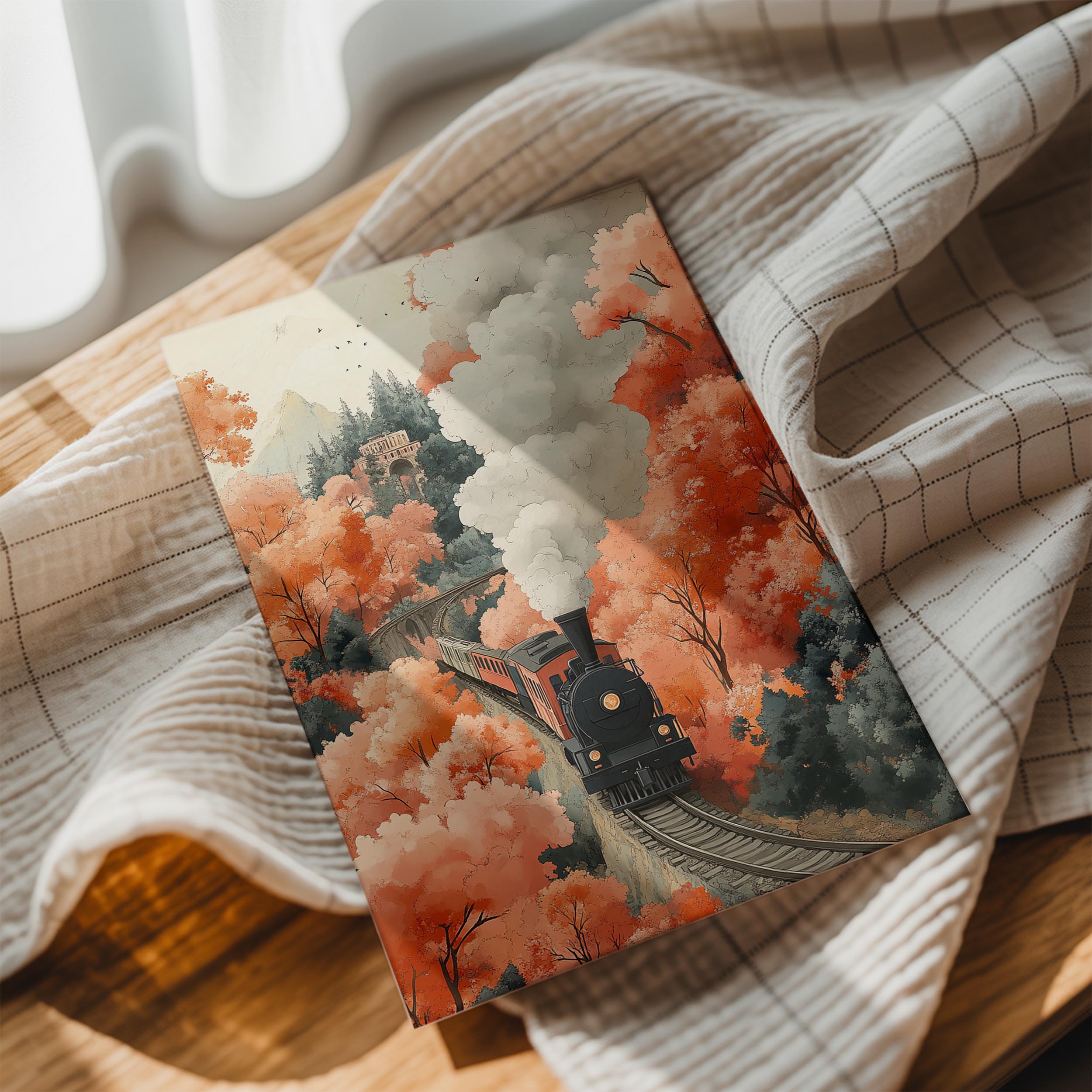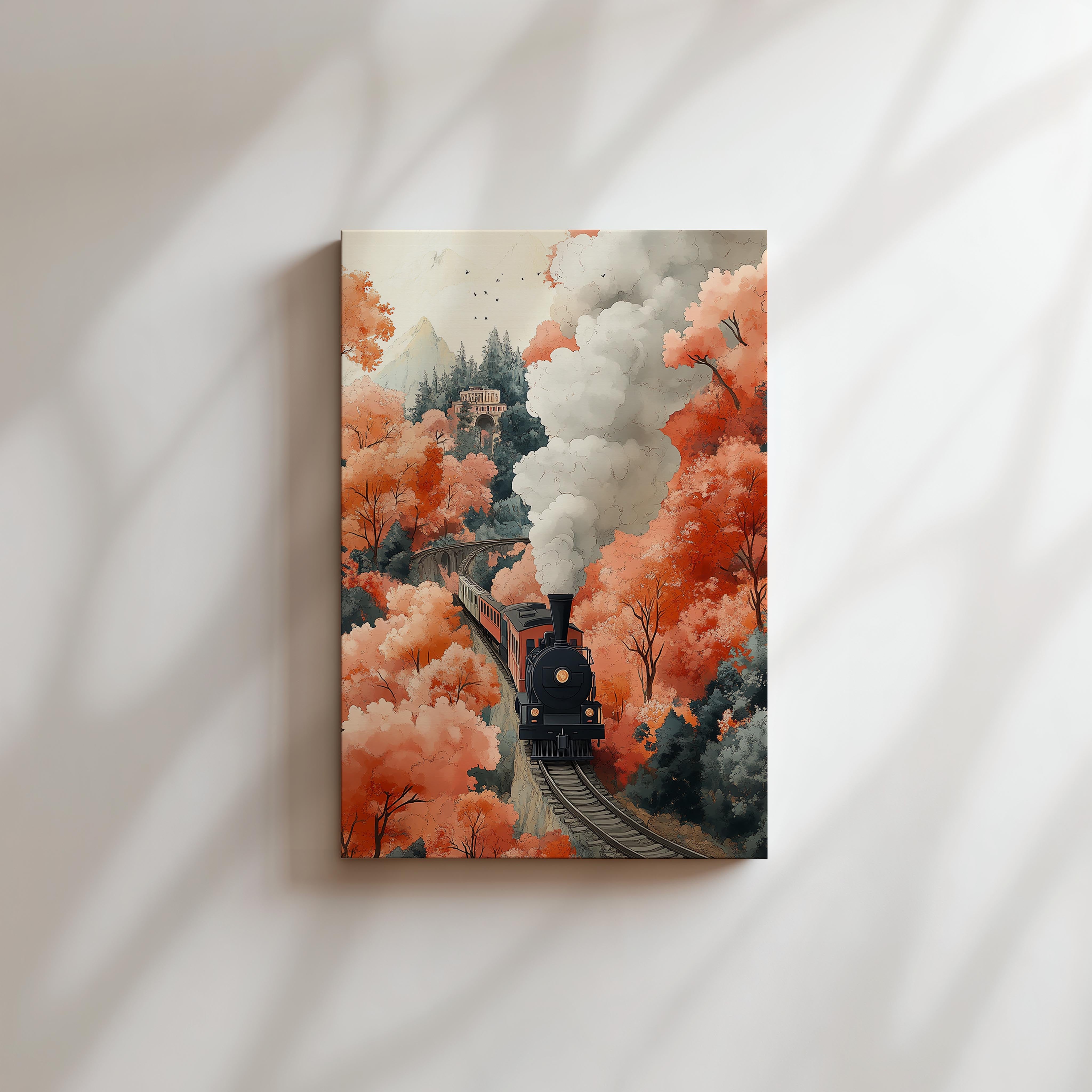 This picturesque artwork showcases a vintage steam train traveling through a vibrant autumn forest, surrounded by a palette of rich oranges, reds, and yellows. The scene exudes warmth and nostalgia, making it an ideal choice for spaces celebrating the charm of seasonal beauty. The detailed rendering of the train, combined with the natural beauty of the landscape, creates a harmonious and inviting composition. Perfect for living rooms, offices, or libraries, this piece brings a sense of timeless elegance and the joy of seasonal travel.