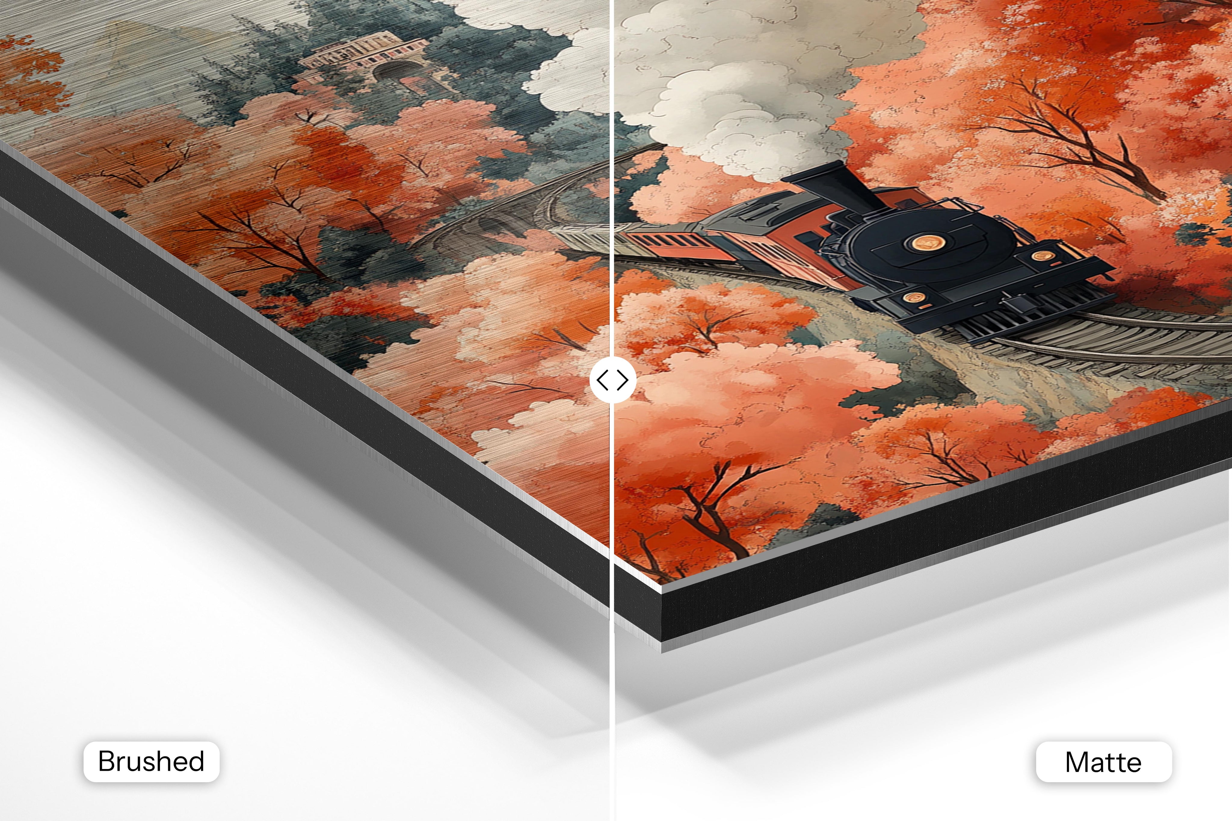 - Brushed Aluminum, on the other hand, features a raw metallic texture with visible brush strokes. Whites and highlights in your image let the silver surface show through, adding a dramatic, shimmering effect. Ideal for black-and-white images, minimalist designs, or abstract art, it creates a bold, industrial vibe with a modern edge.
