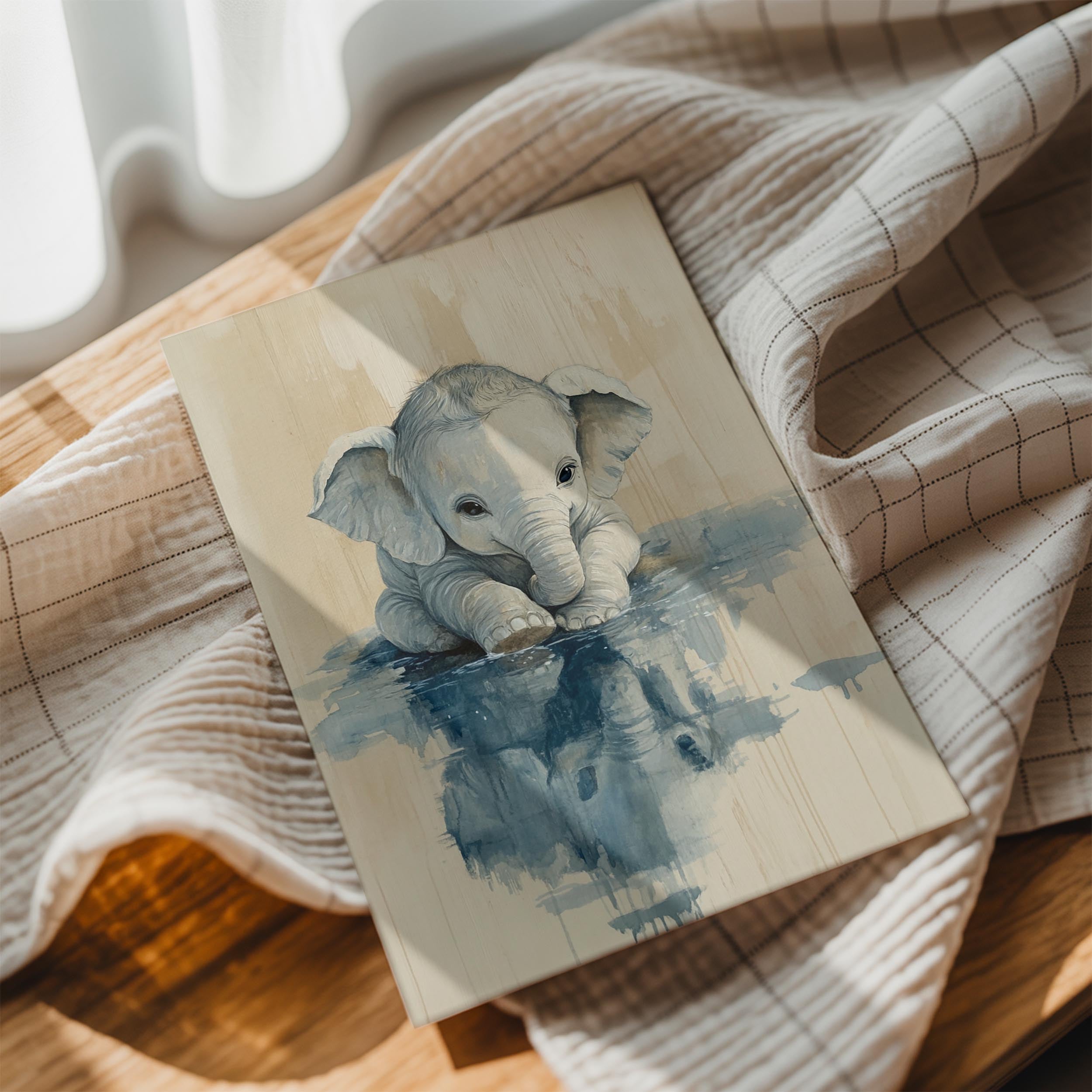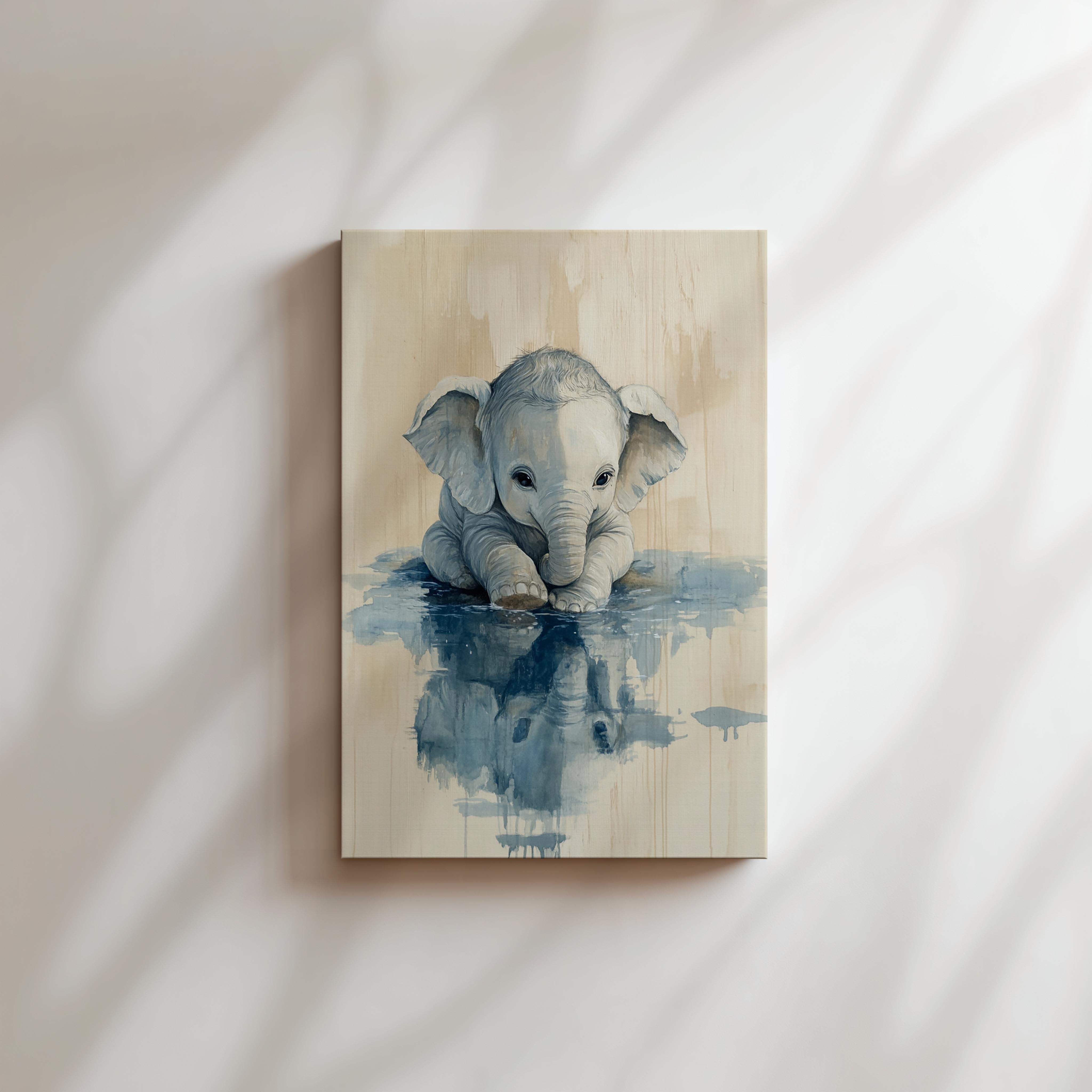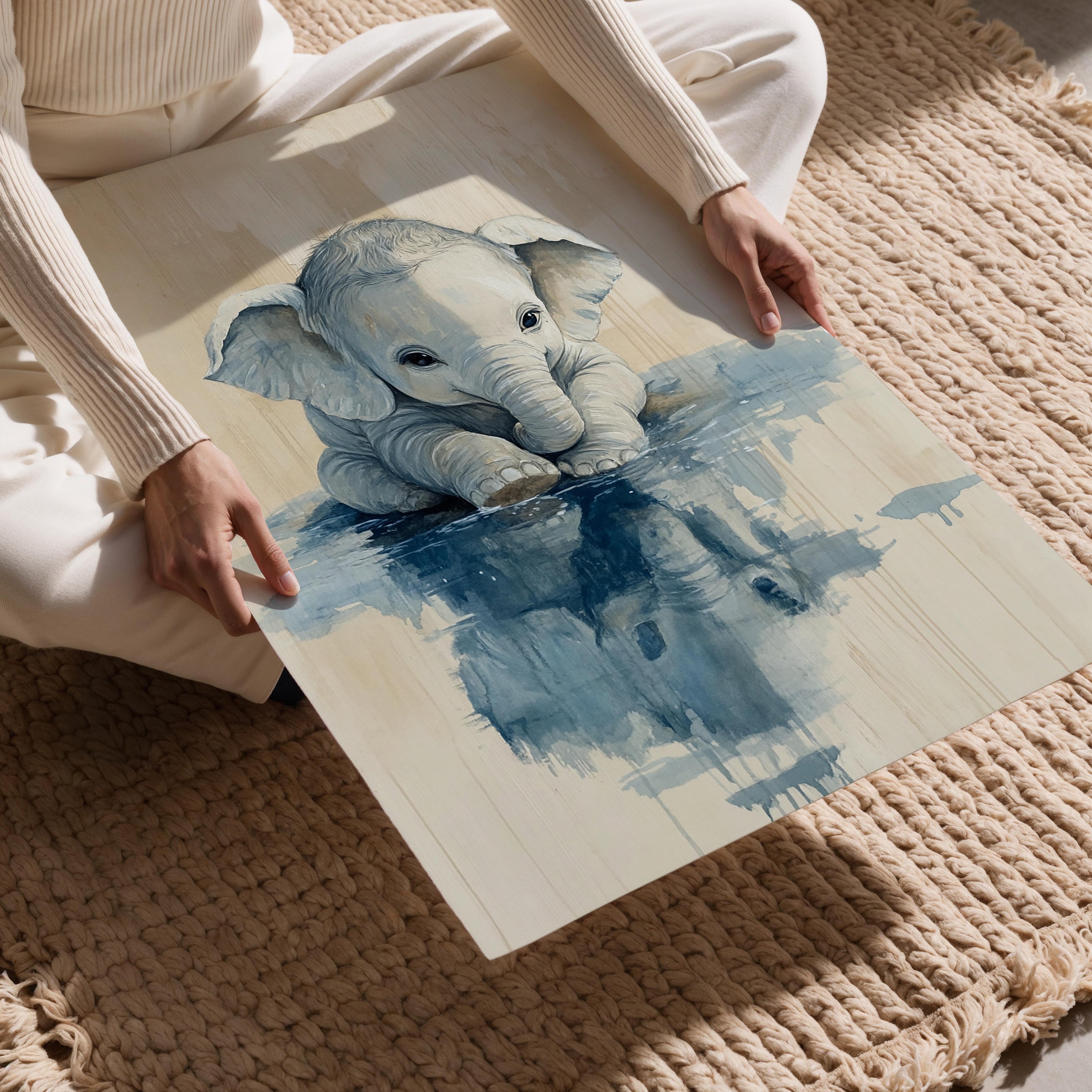 A tender and beautifully rendered painting of a baby elephant resting in shallow water, with its reflection subtly blending into the scene. The delicate brushstrokes and soothing blue tones add to its dreamlike quality, making it a wonderful piece for nurseries, meditation spaces, or relaxation areas.