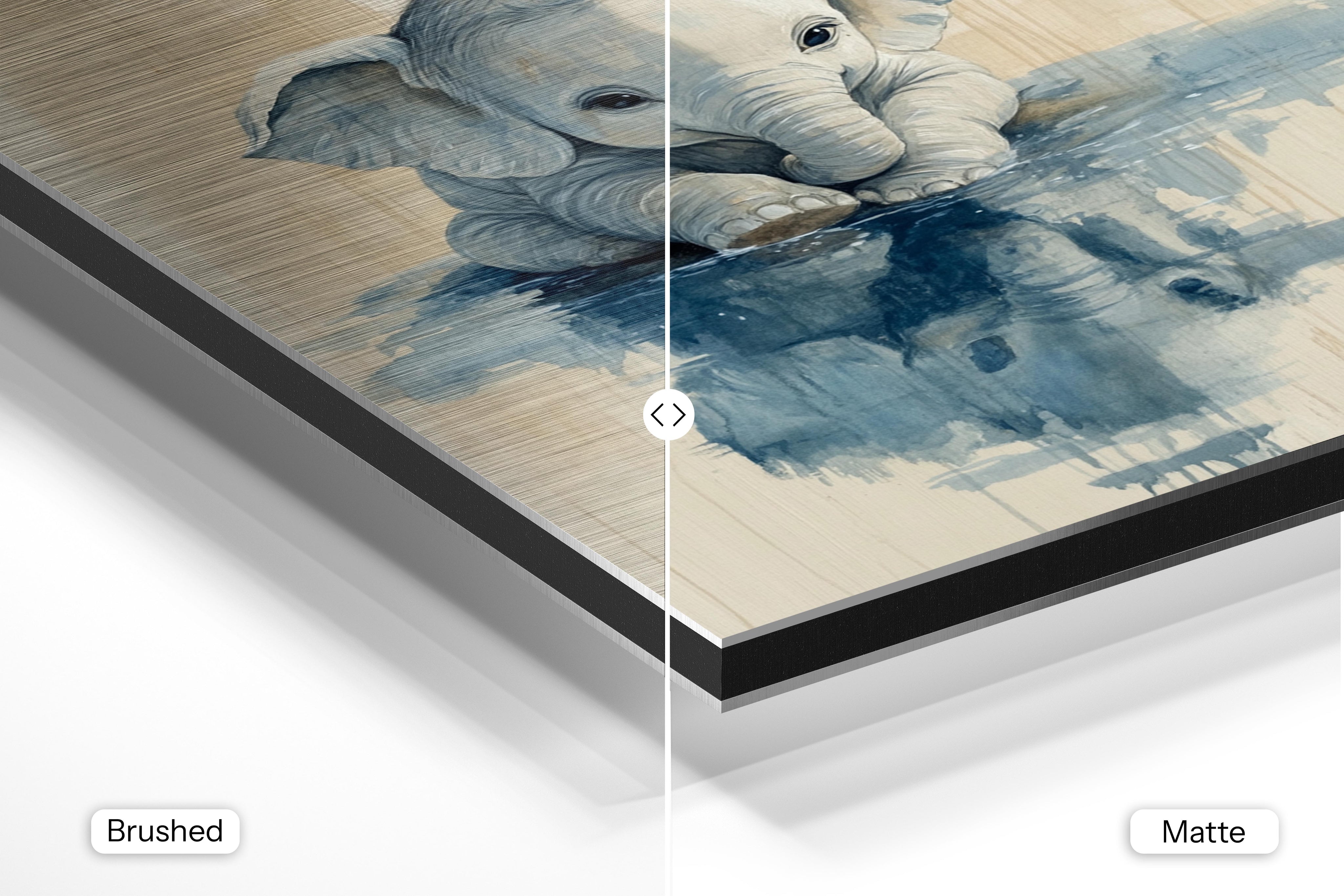 - Brushed Aluminum, on the other hand, features a raw metallic texture with visible brush strokes. Whites and highlights in your image let the silver surface show through, adding a dramatic, shimmering effect. Ideal for black-and-white images, minimalist designs, or abstract art, it creates a bold, industrial vibe with a modern edge.