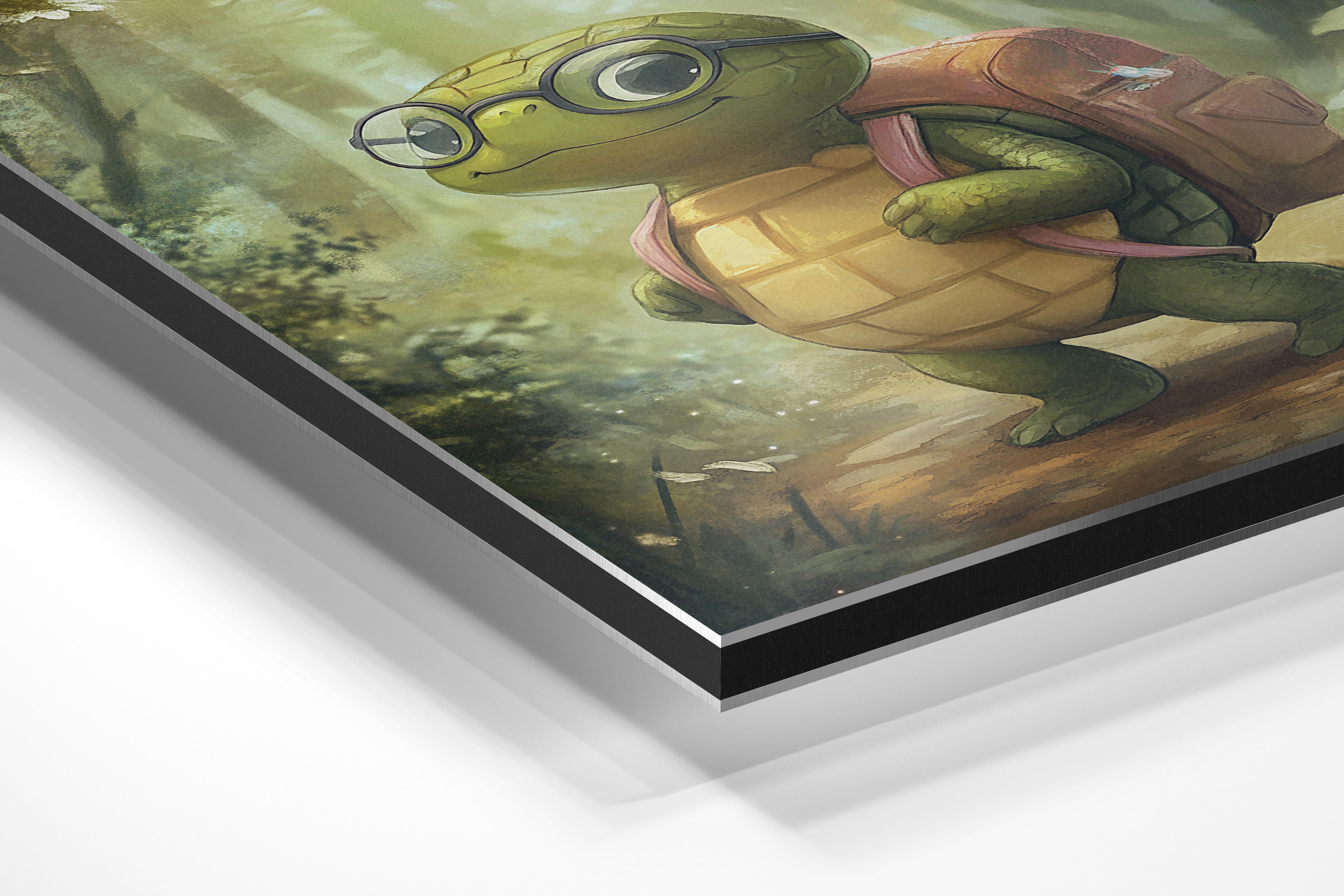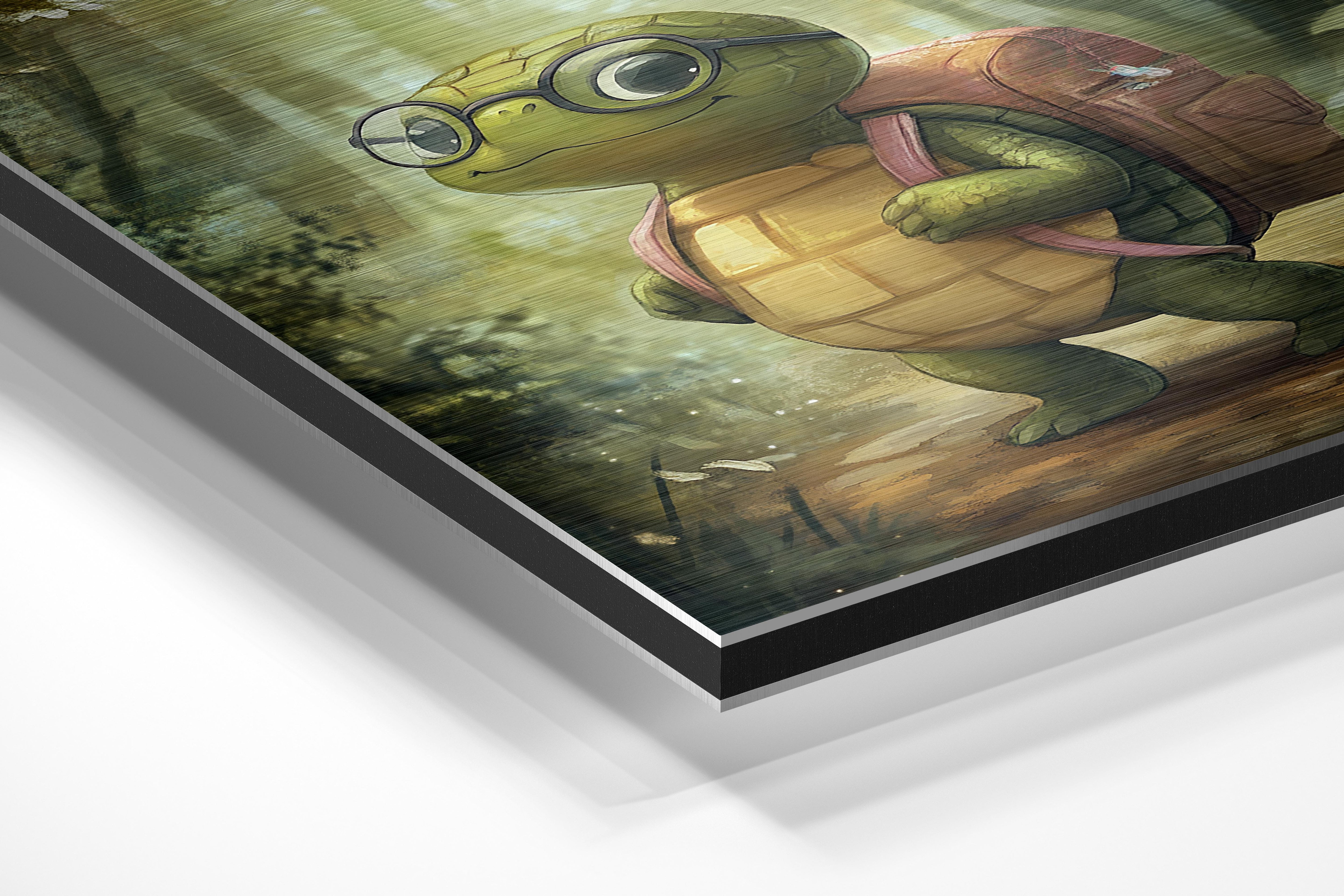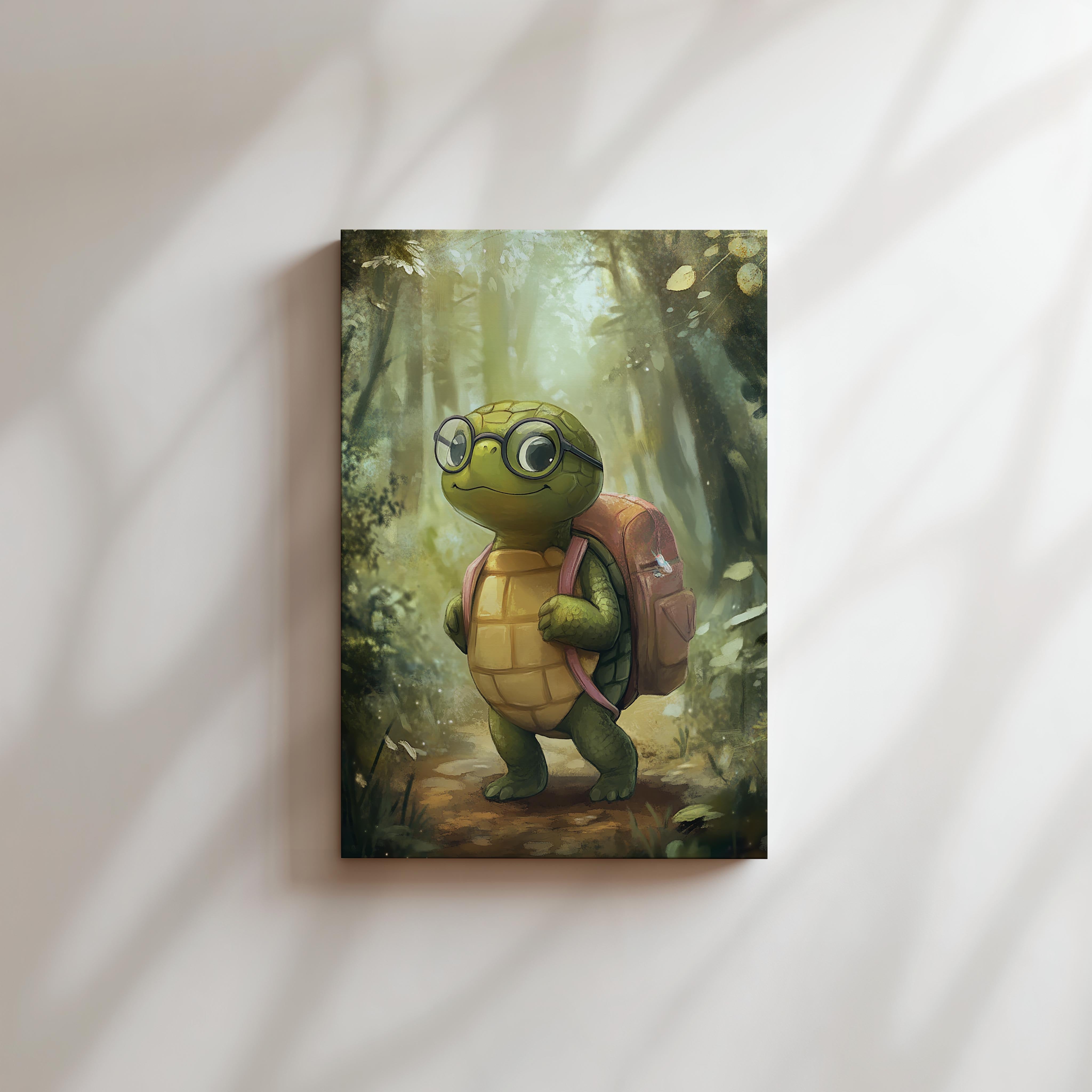A curious turtle with glasses and a backpack explores a forest bathed in golden light. The turtle’s gentle smile and intricate details make it an inviting piece for spaces that celebrate learning and adventure. It’s perfect for libraries or children’s study areas, sparking curiosity and imagination.