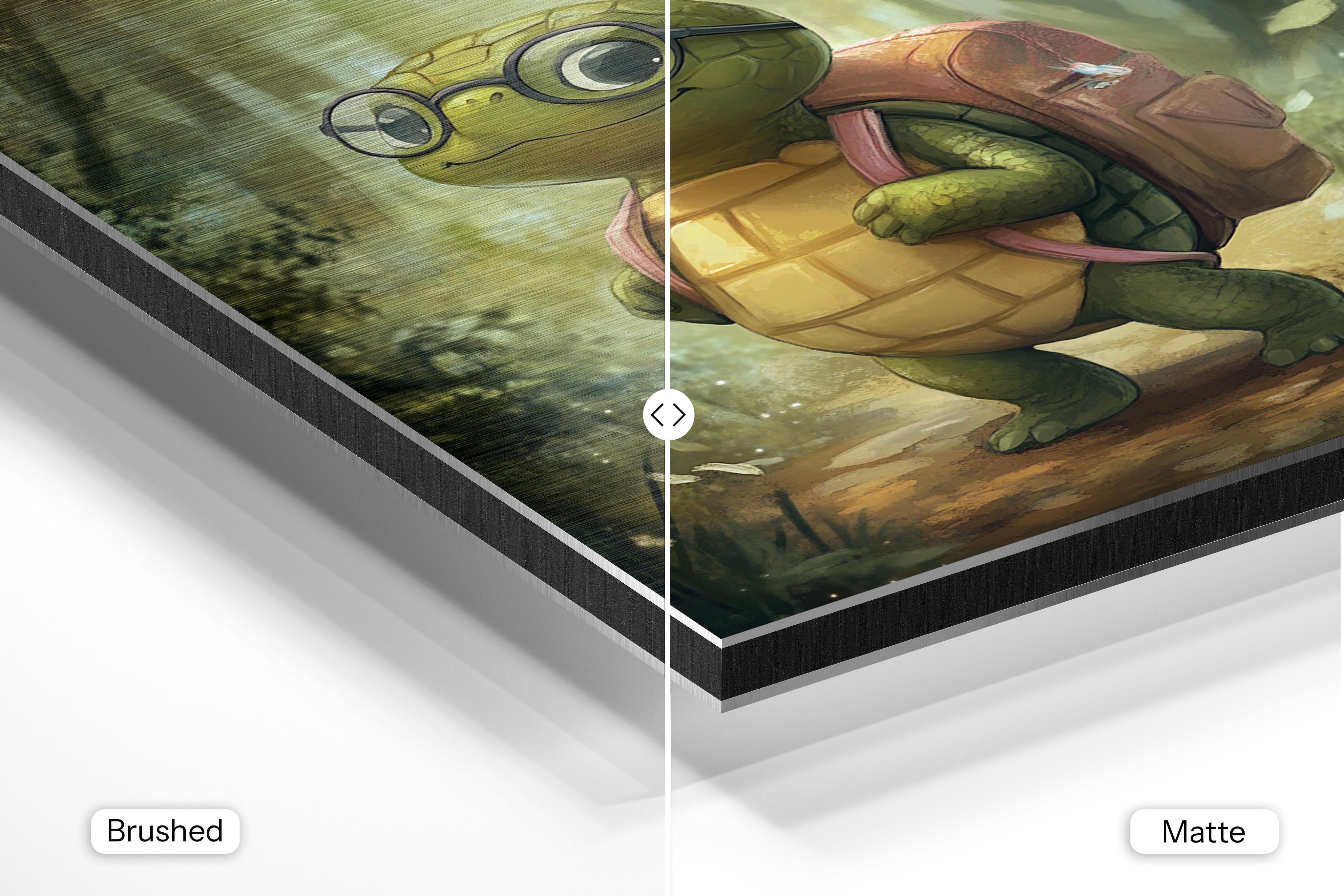 - Brushed Aluminum, on the other hand, features a raw metallic texture with visible brush strokes. Whites and highlights in your image let the silver surface show through, adding a dramatic, shimmering effect. Ideal for black-and-white images, minimalist designs, or abstract art, it creates a bold, industrial vibe with a modern edge.