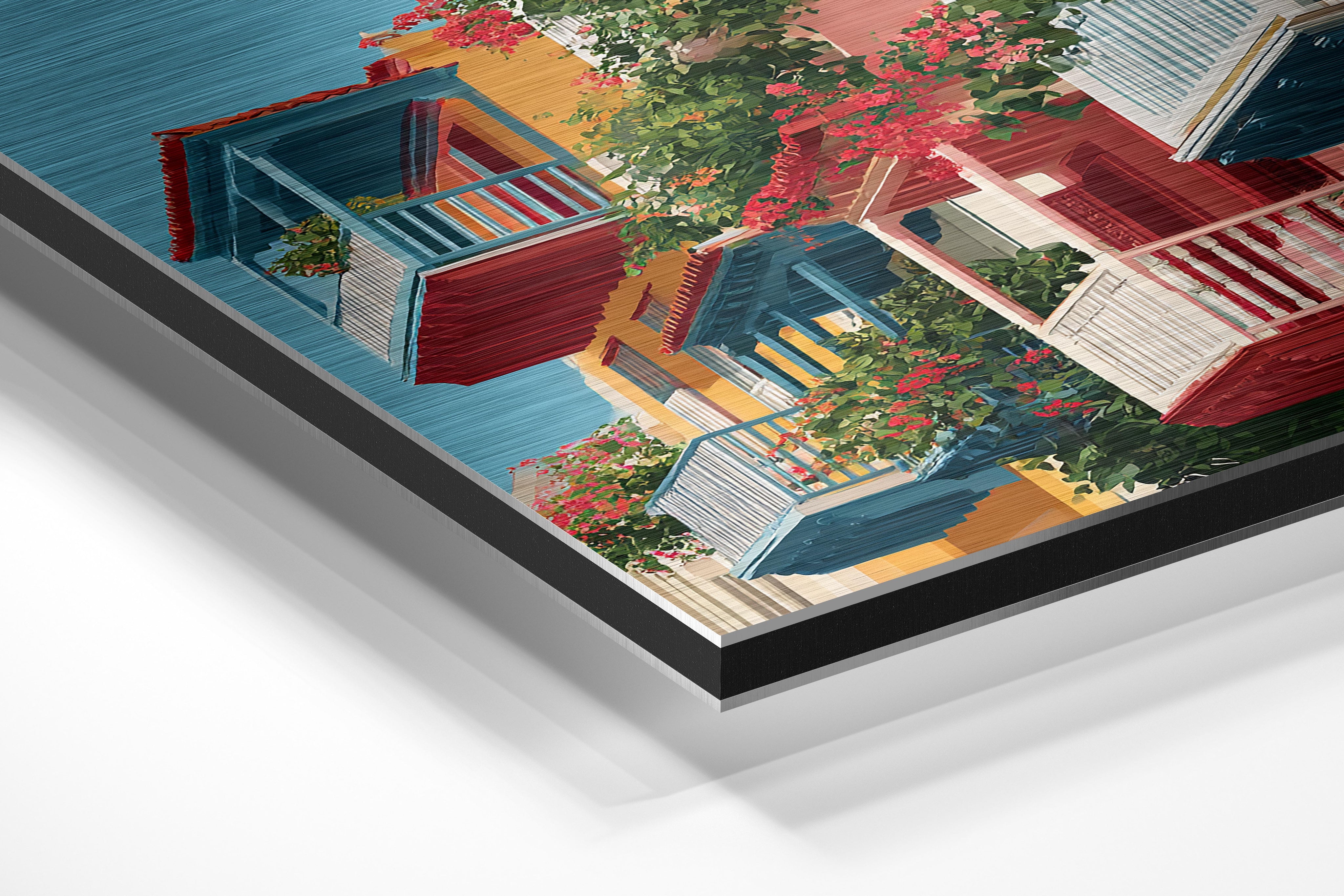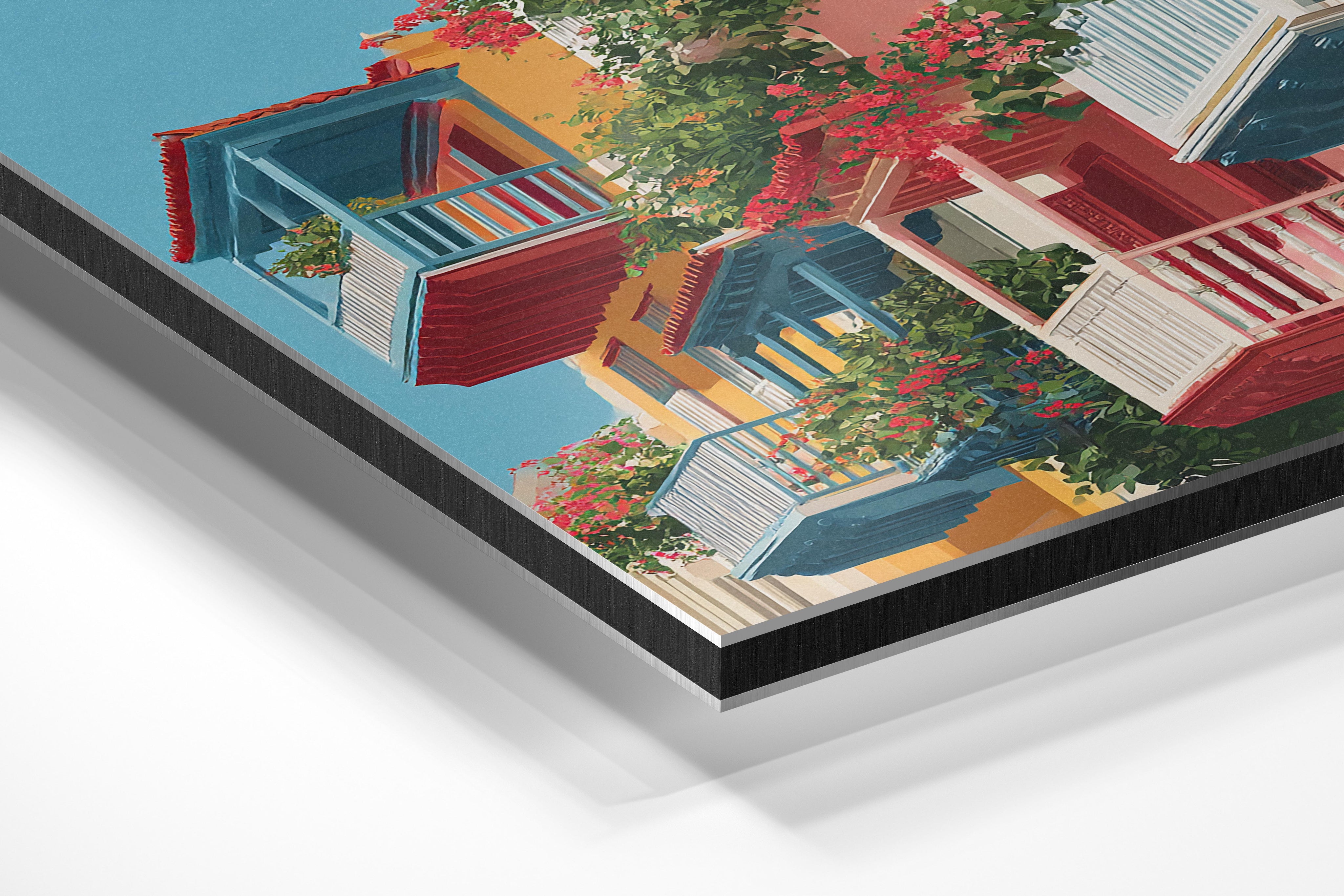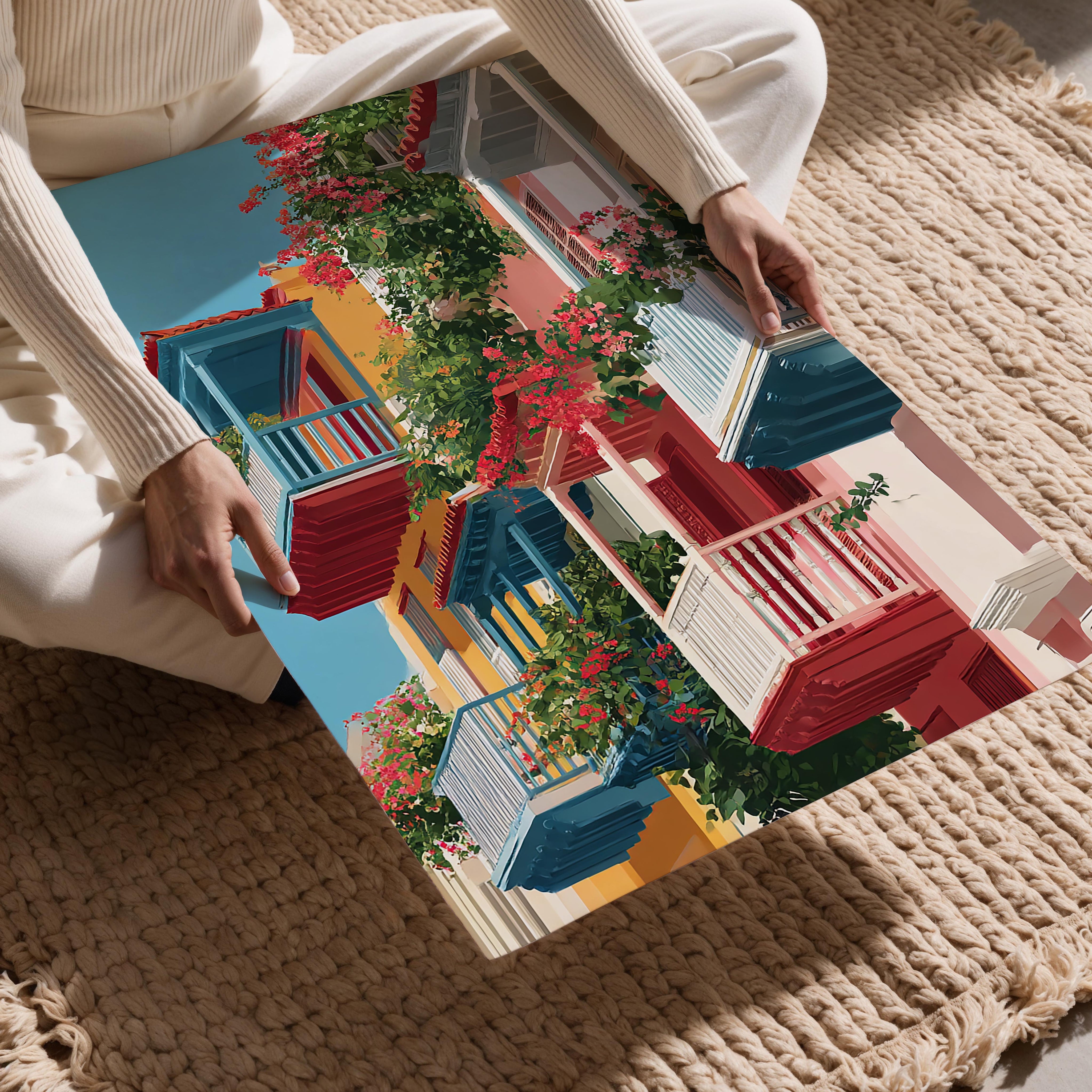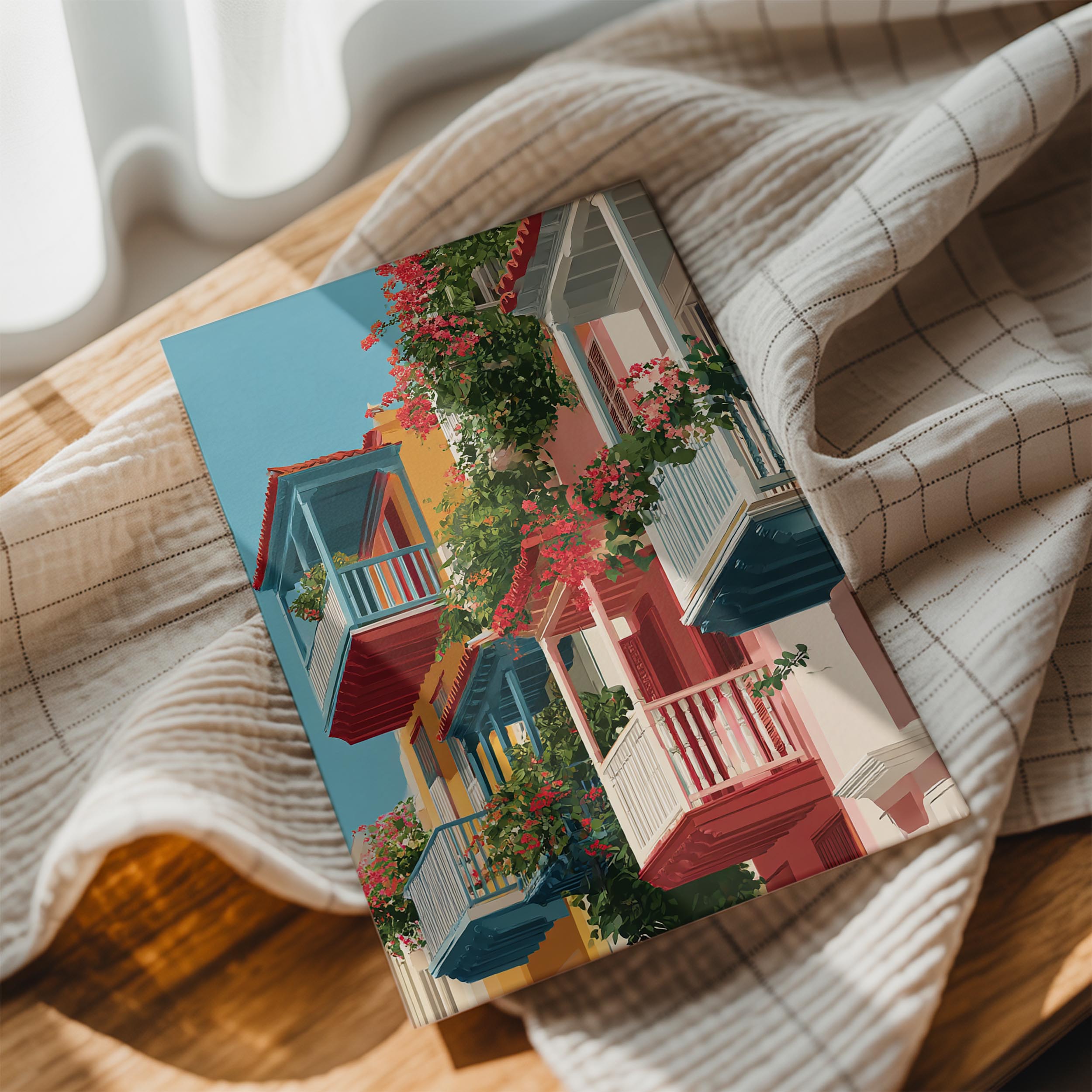 This vibrant image showcases a series of colonial balconies adorned with cascading pink and red flowers. The facades of the buildings are painted in cheerful hues of yellow, salmon, and white, while bright blue railings and terracotta roofs add a Mediterranean charm. The lush greenery and blossoms soften the angular architecture, creating a welcoming and romantic visual. Perfect for tropical-themed interiors or spaces celebrating color and culture, this artwork offers joy and movement in every corner, bringing a burst of botanical charm to walls in homes, cafes, or coastal resorts.