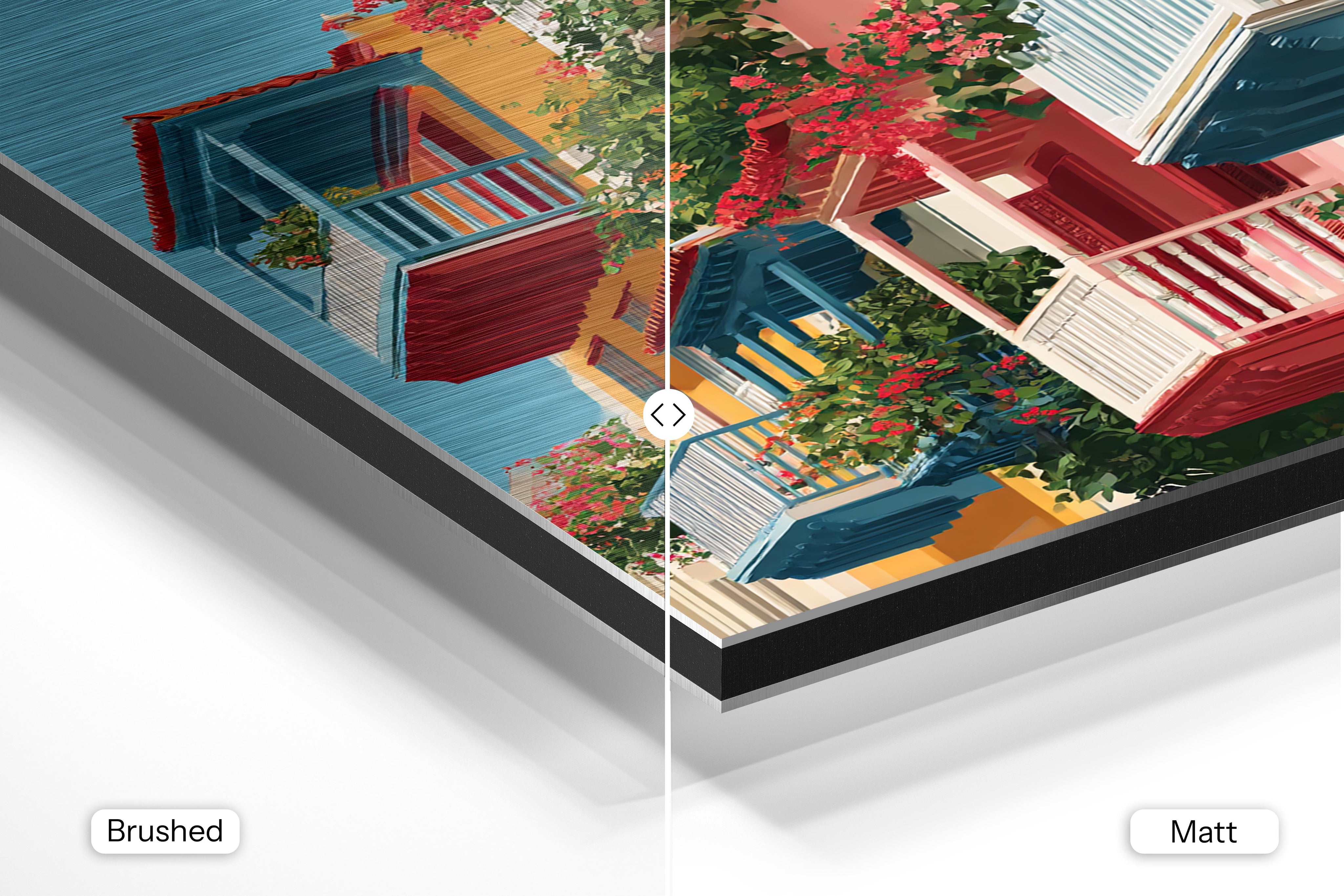 - Matte Aluminum offers a smooth, bright white surface that delivers crisp details and vibrant, true-to-life colors. With its non-reflective finish and subtle silky sheen, it’s perfect for photography, portraits, and colorful artwork—bringing a clean, polished look to any interior.