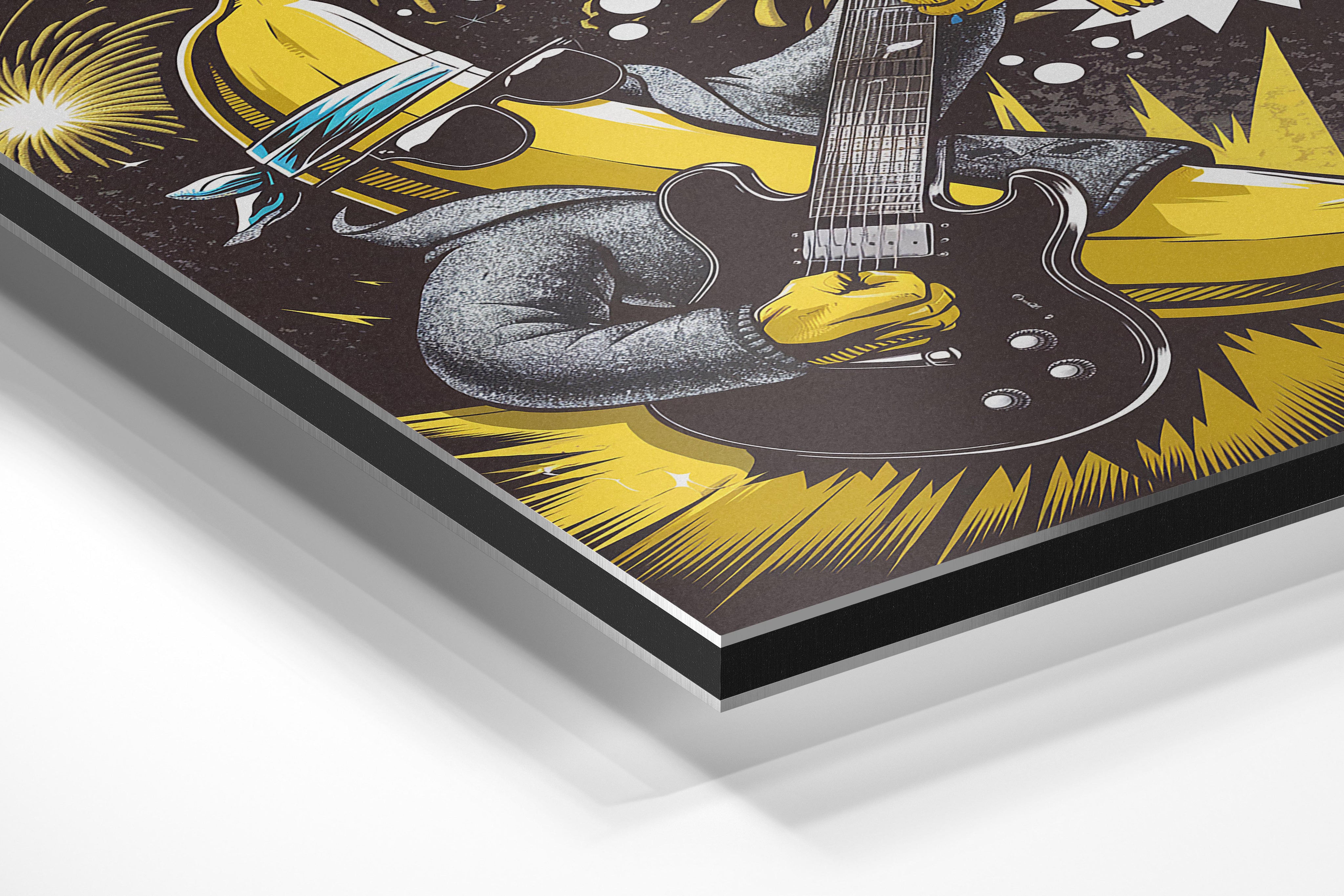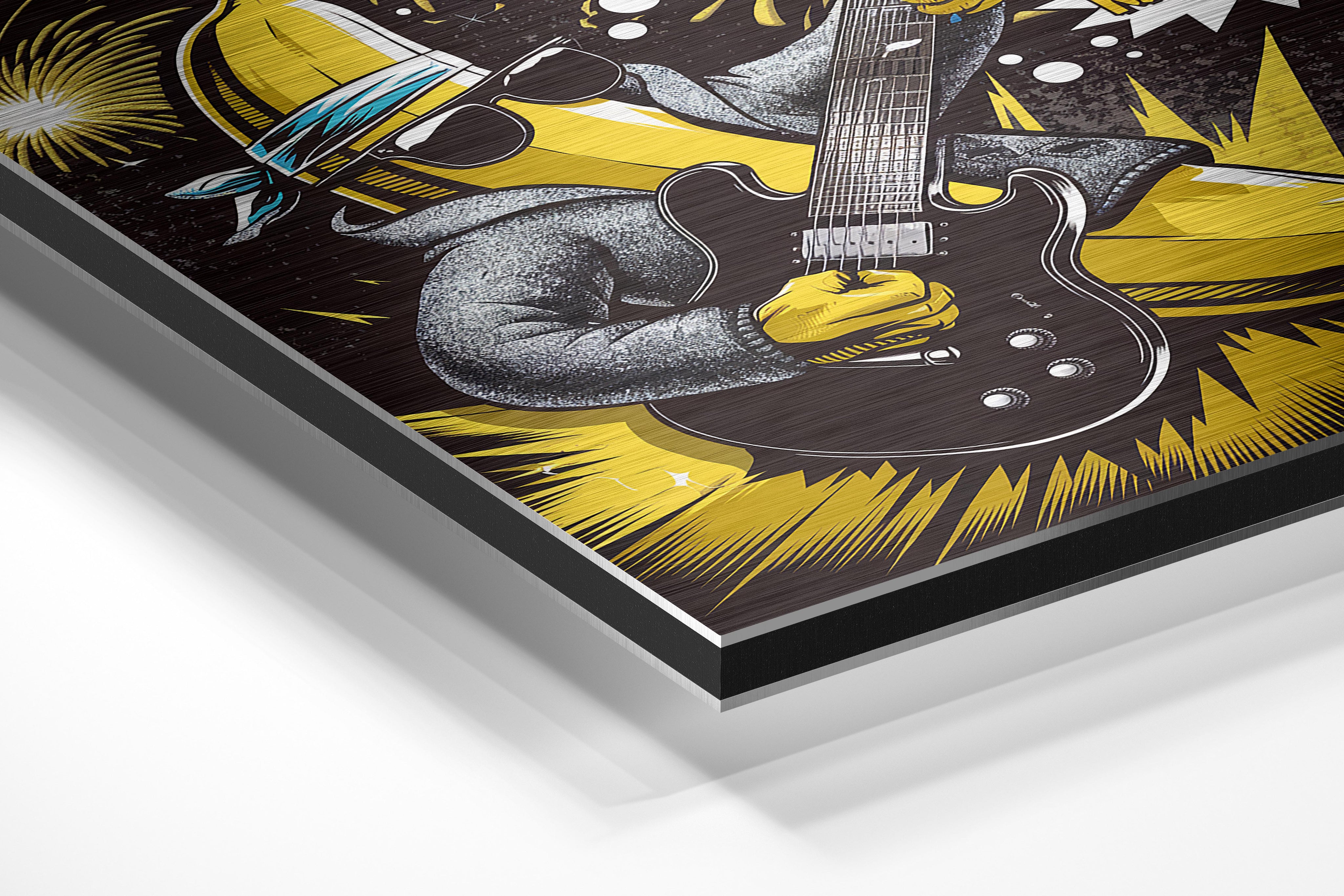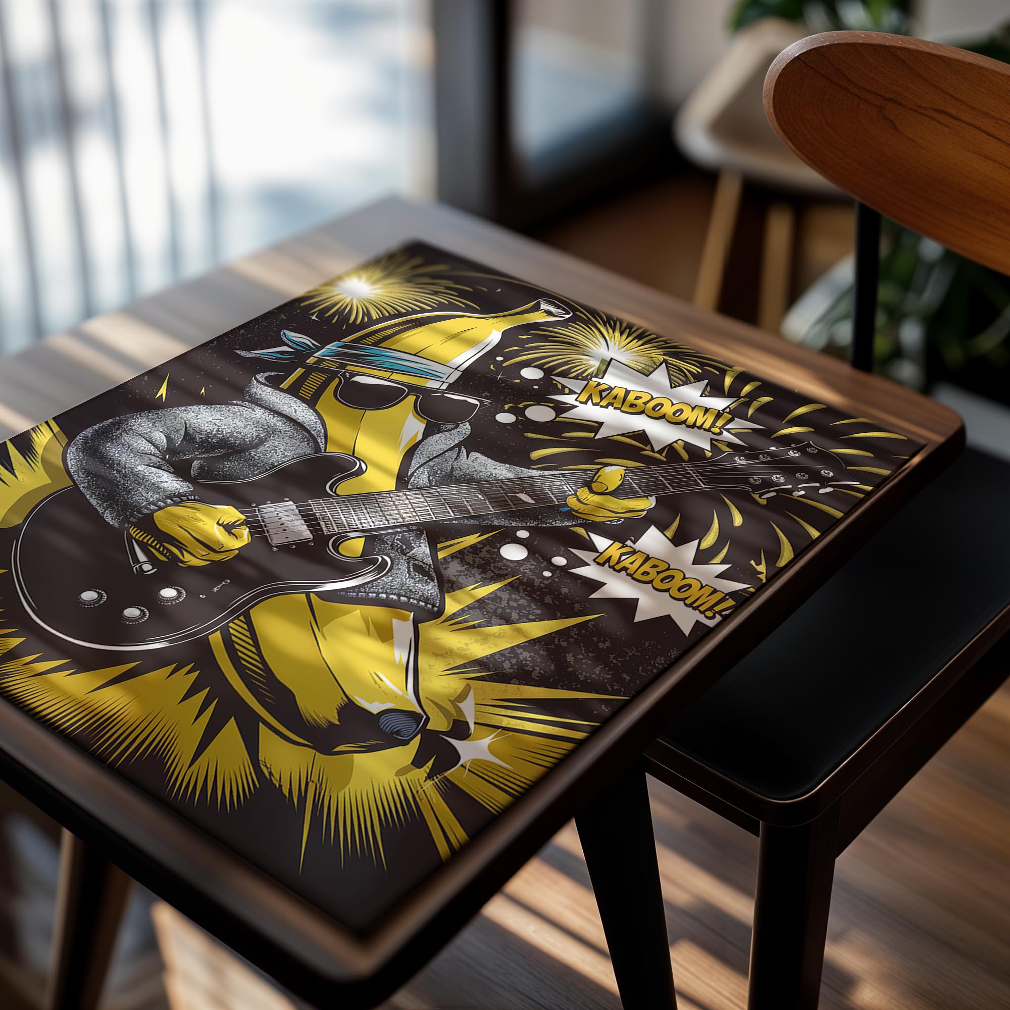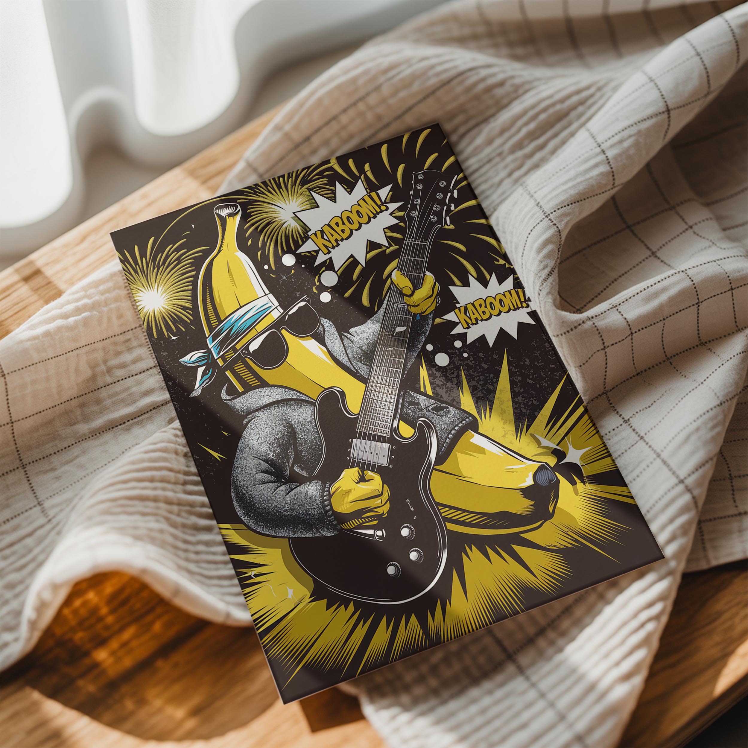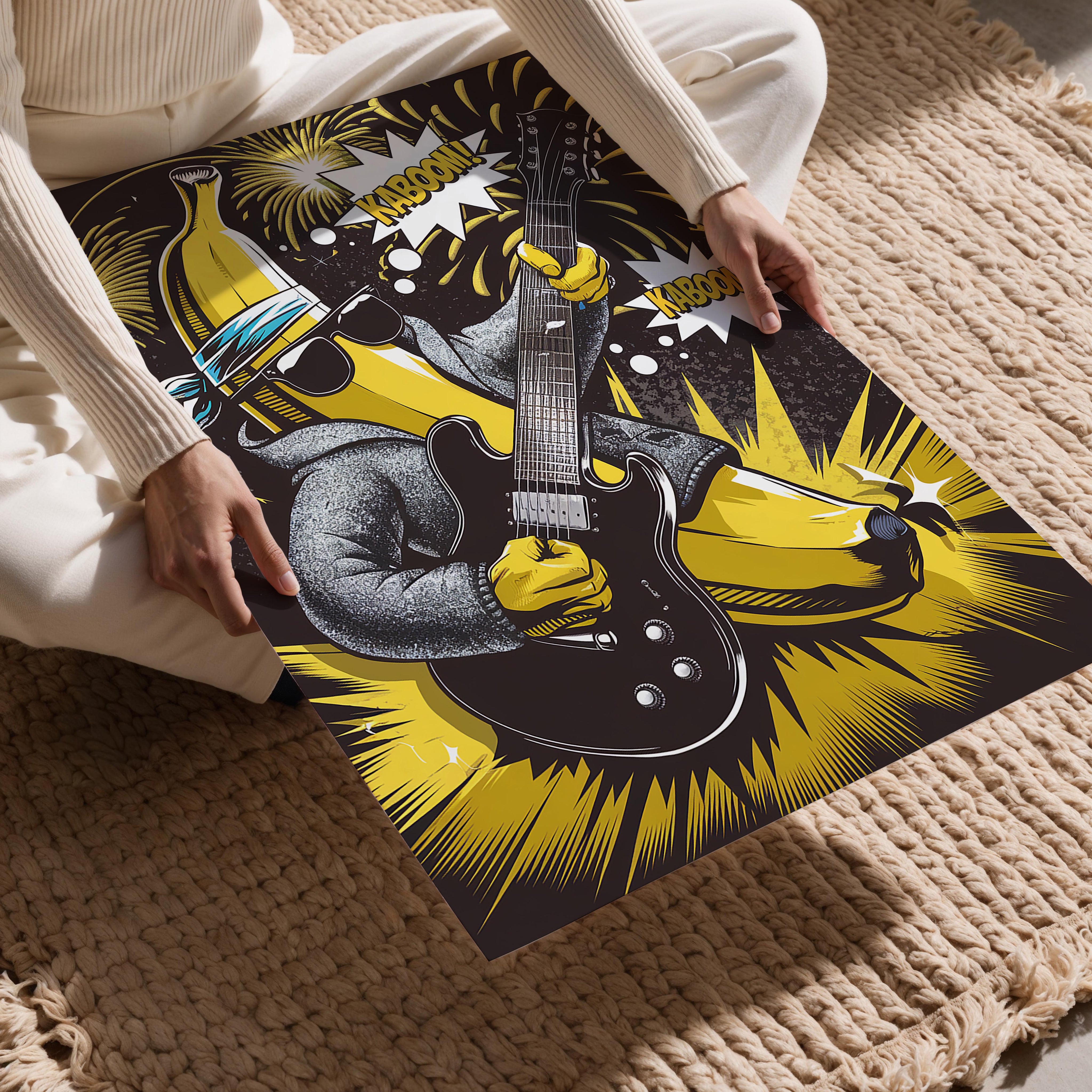 A banana character rocks out with fireworks and bold energy. This humorous, music-fueled art is great for playrooms or music spaces wanting quirky personality.