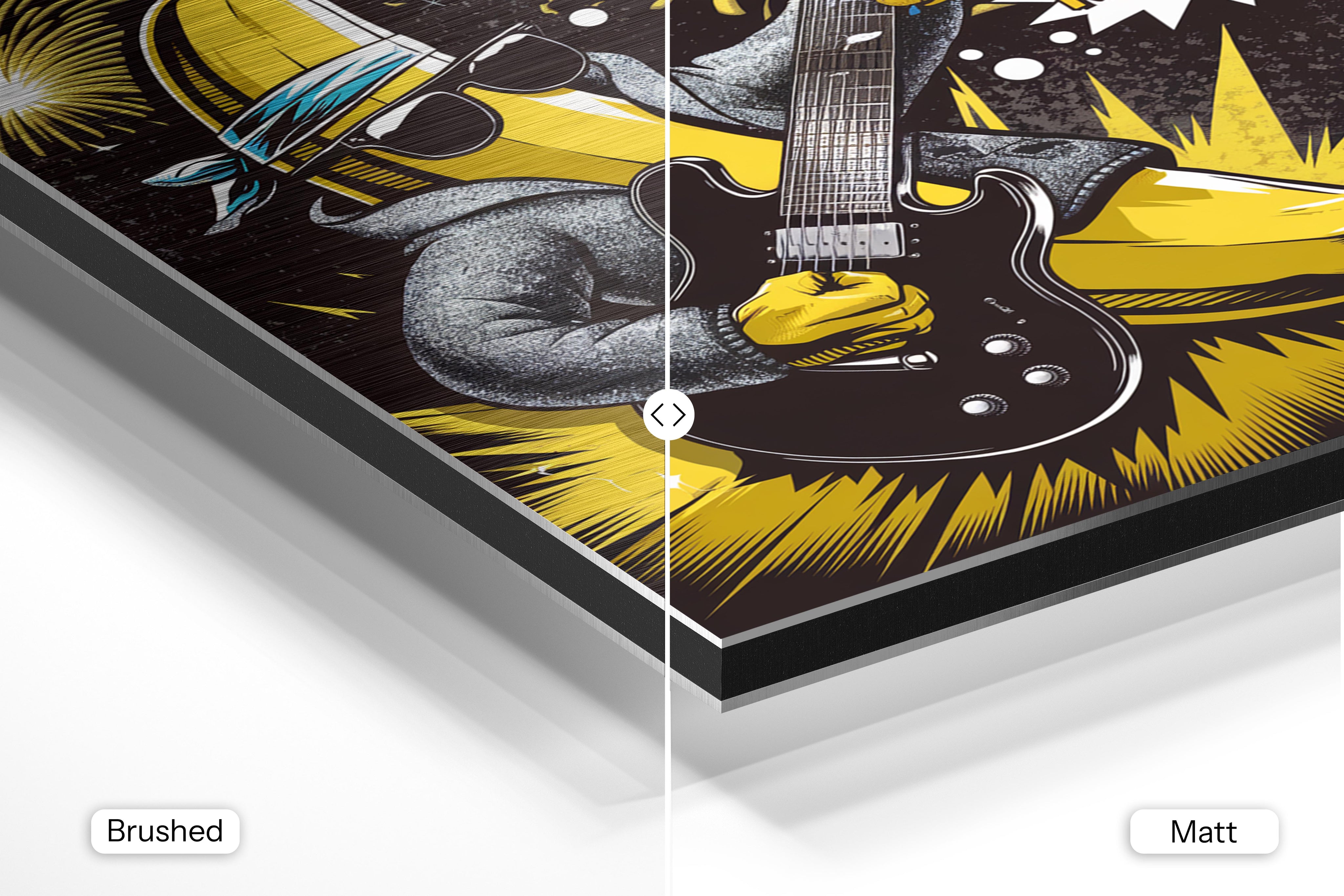 - Brushed Aluminum, on the other hand, features a raw metallic texture with visible brush strokes. Whites and highlights in your image let the silver surface show through, adding a dramatic, shimmering effect. Ideal for black-and-white images, minimalist designs, or abstract art, it creates a bold, industrial vibe with a modern edge.