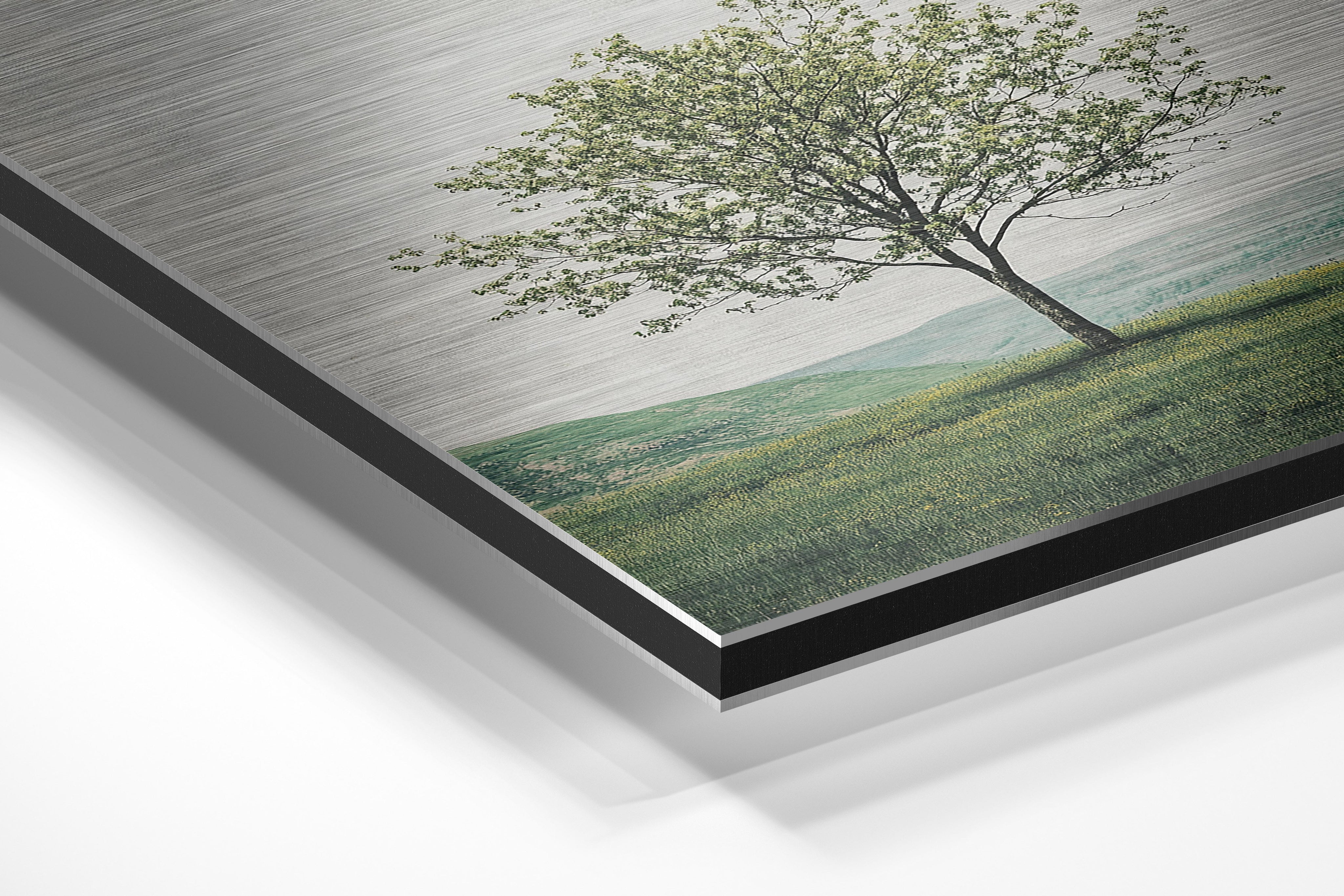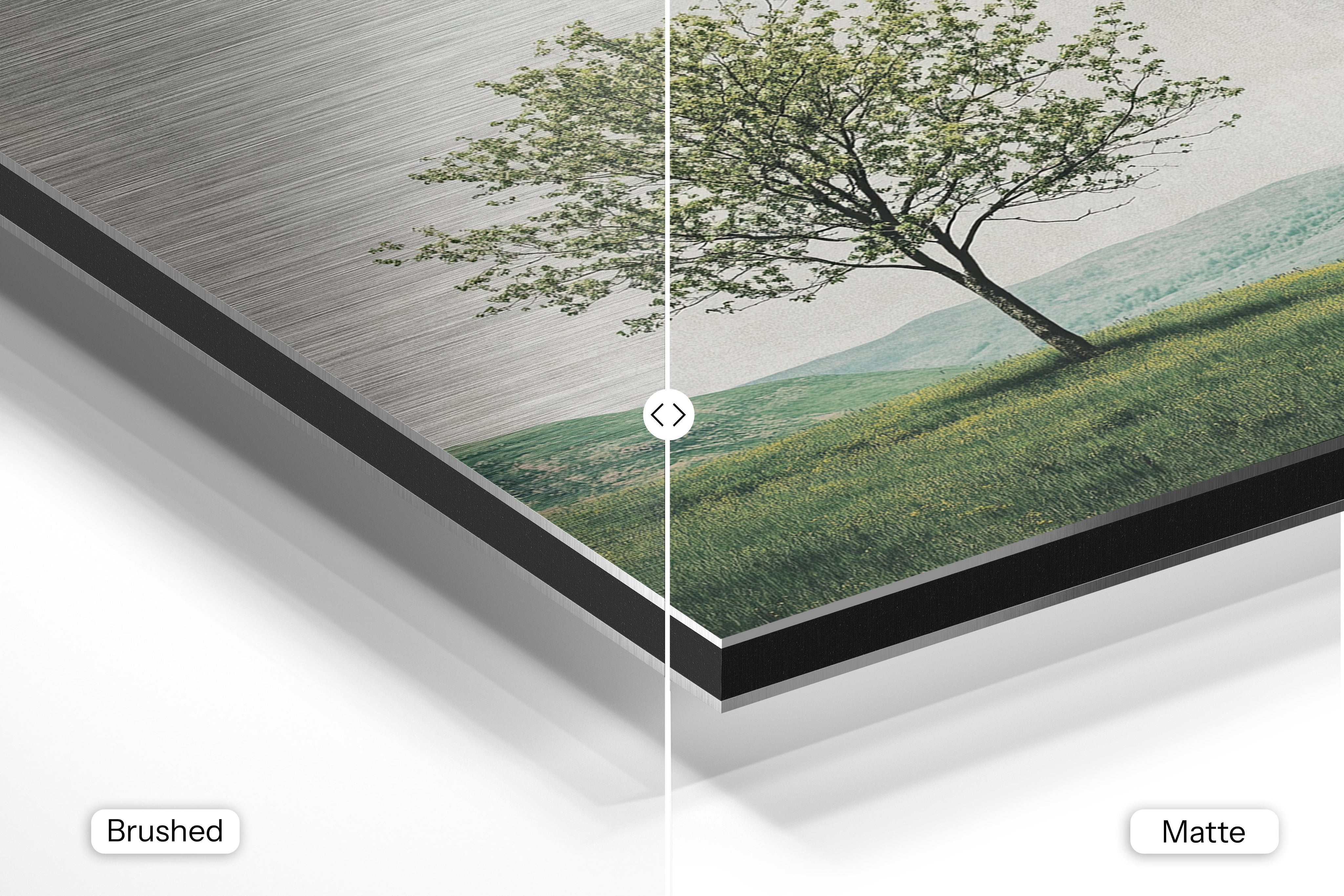- Brushed Aluminum, on the other hand, features a raw metallic texture with visible brush strokes. Whites and highlights in your image let the silver surface show through, adding a dramatic, shimmering effect. Ideal for black-and-white images, minimalist designs, or abstract art, it creates a bold, industrial vibe with a modern edge.