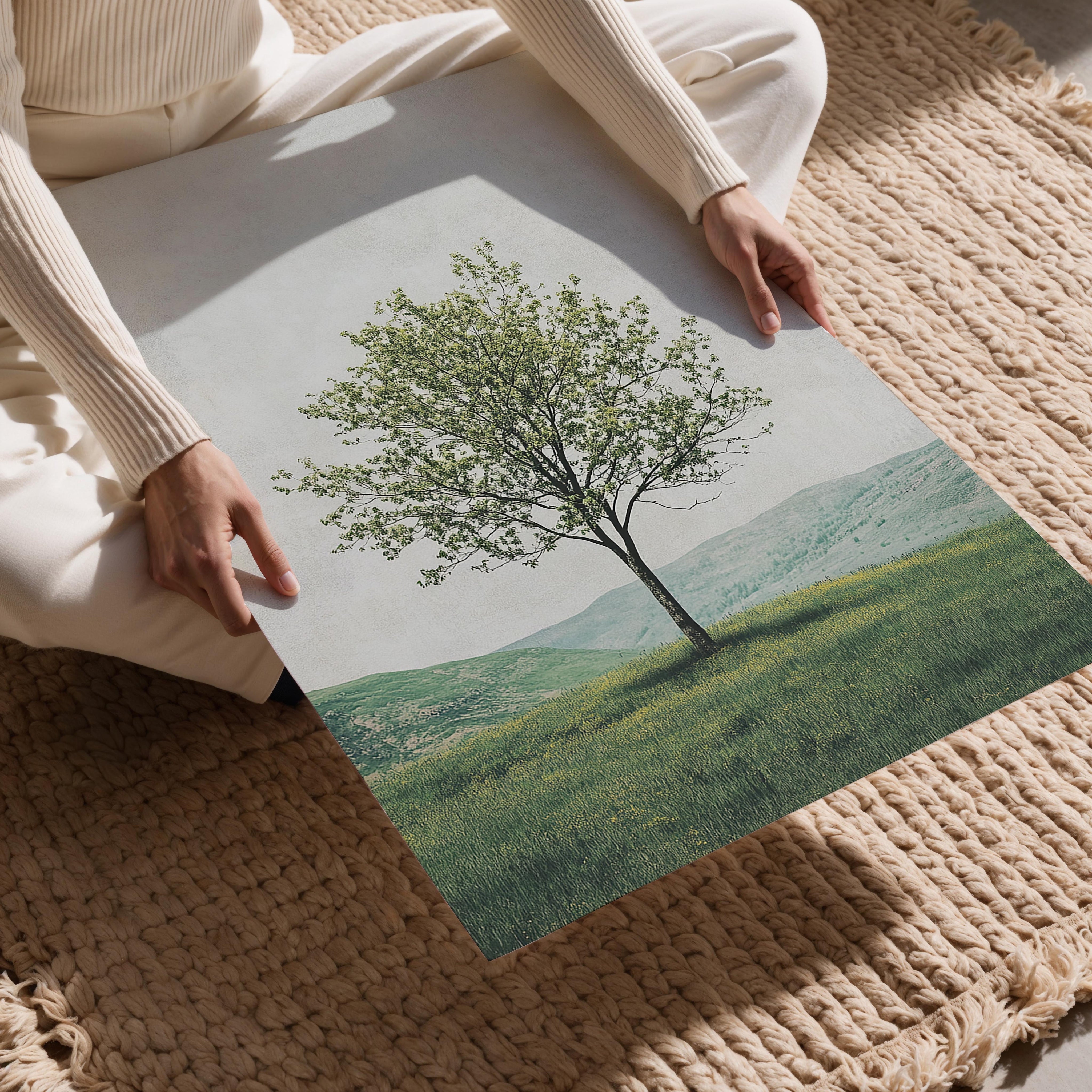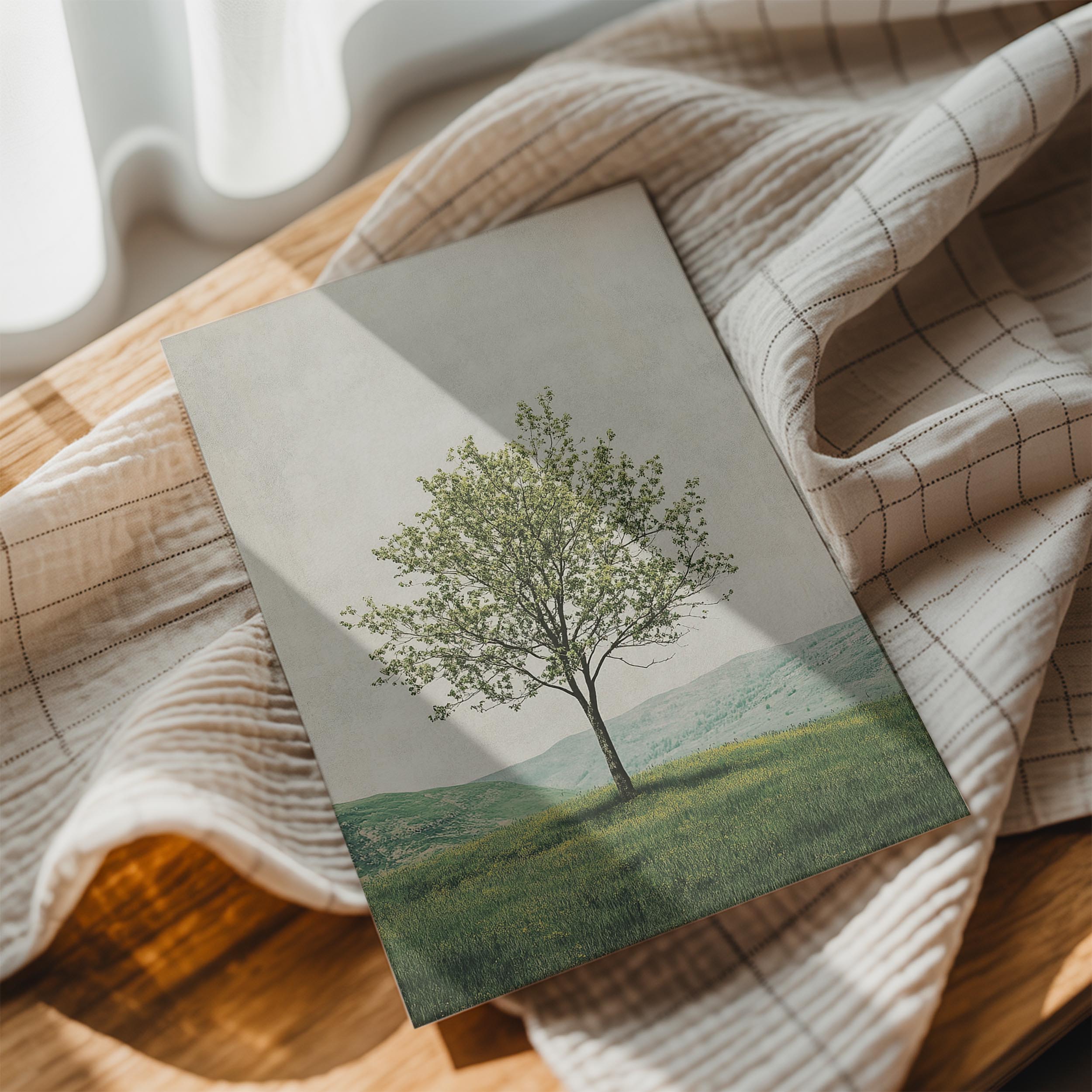 A vibrant blooming tree surrounded by fresh greenery. The delicate blossoms bring a burst of color and life to the scene, symbolizing renewal and the joy of spring. The surrounding meadow adds to the sense of vitality, creating a picturesque landscape of seasonal beauty. This image captures the spirit of growth and transformation, inspiring a connection to nature’s cycles. Perfect for celebrating the energy and freshness of springtime, it’s a delightful visual treat.