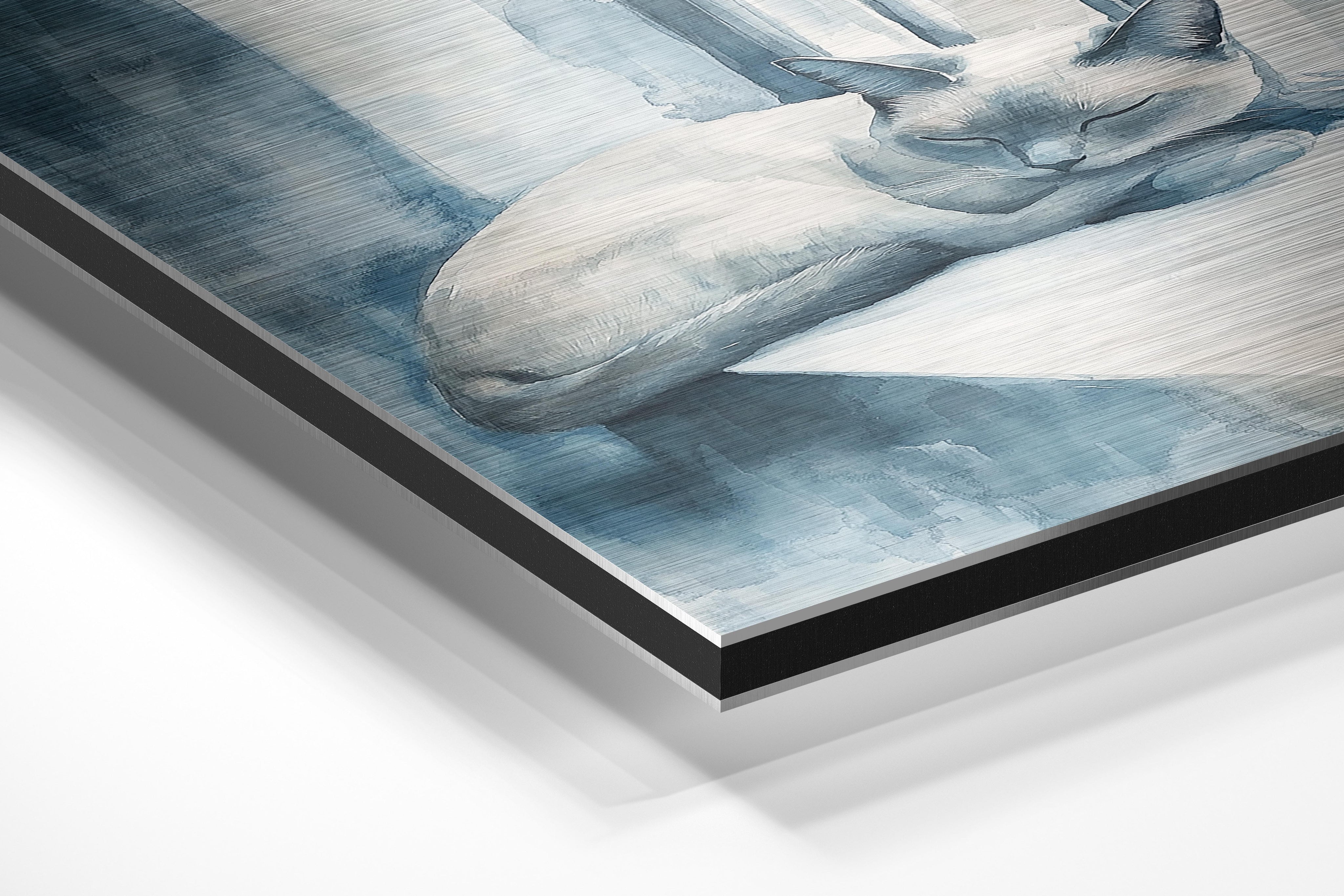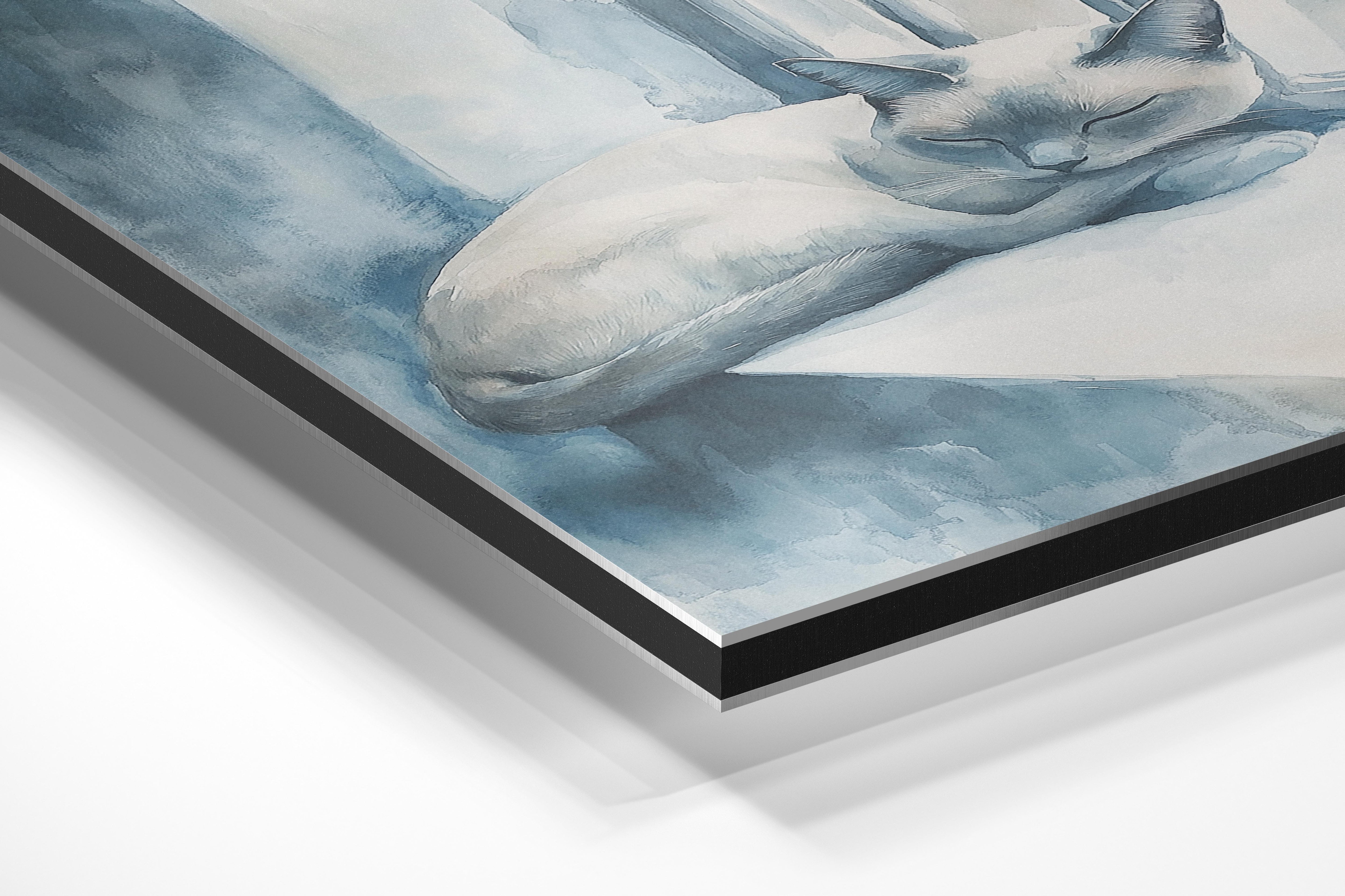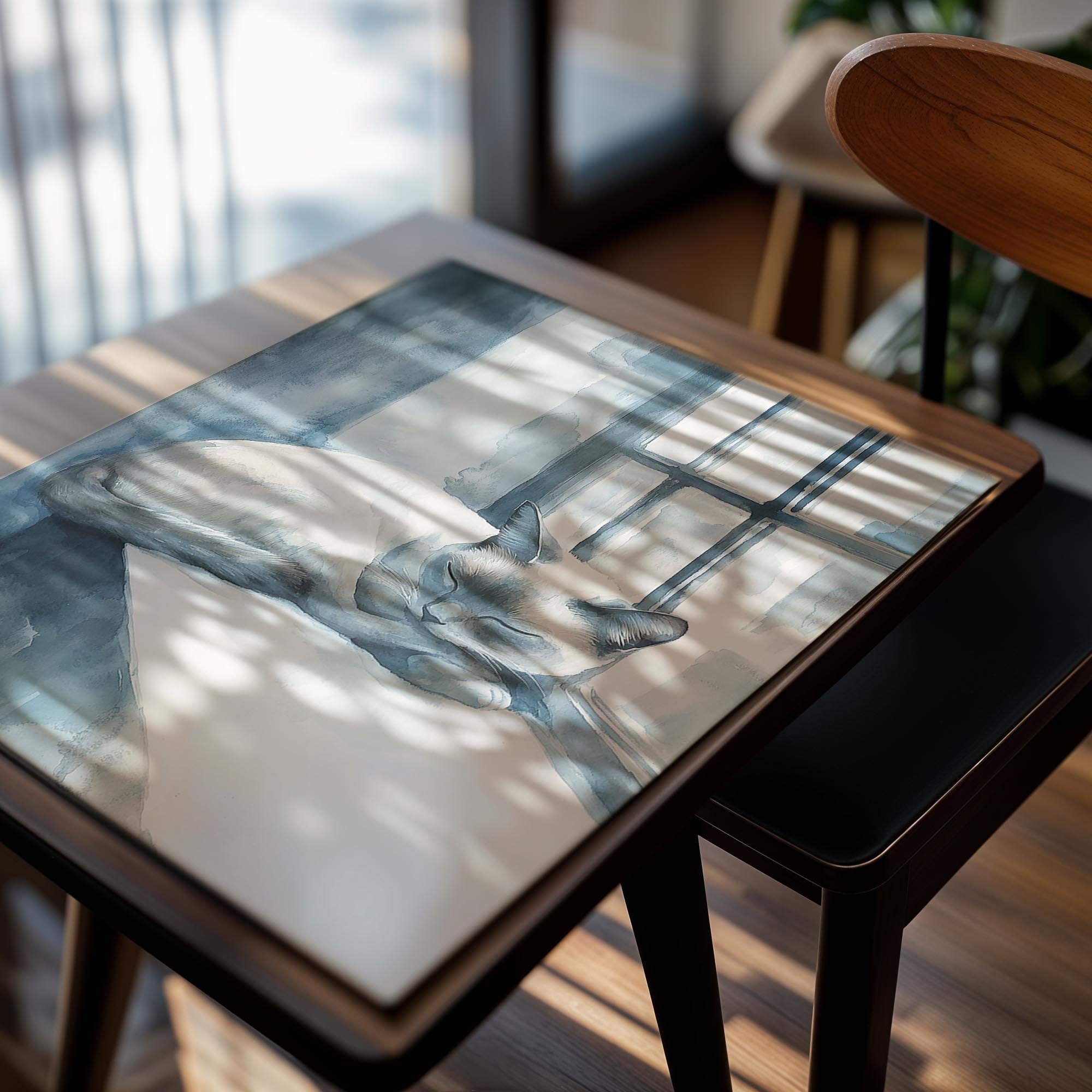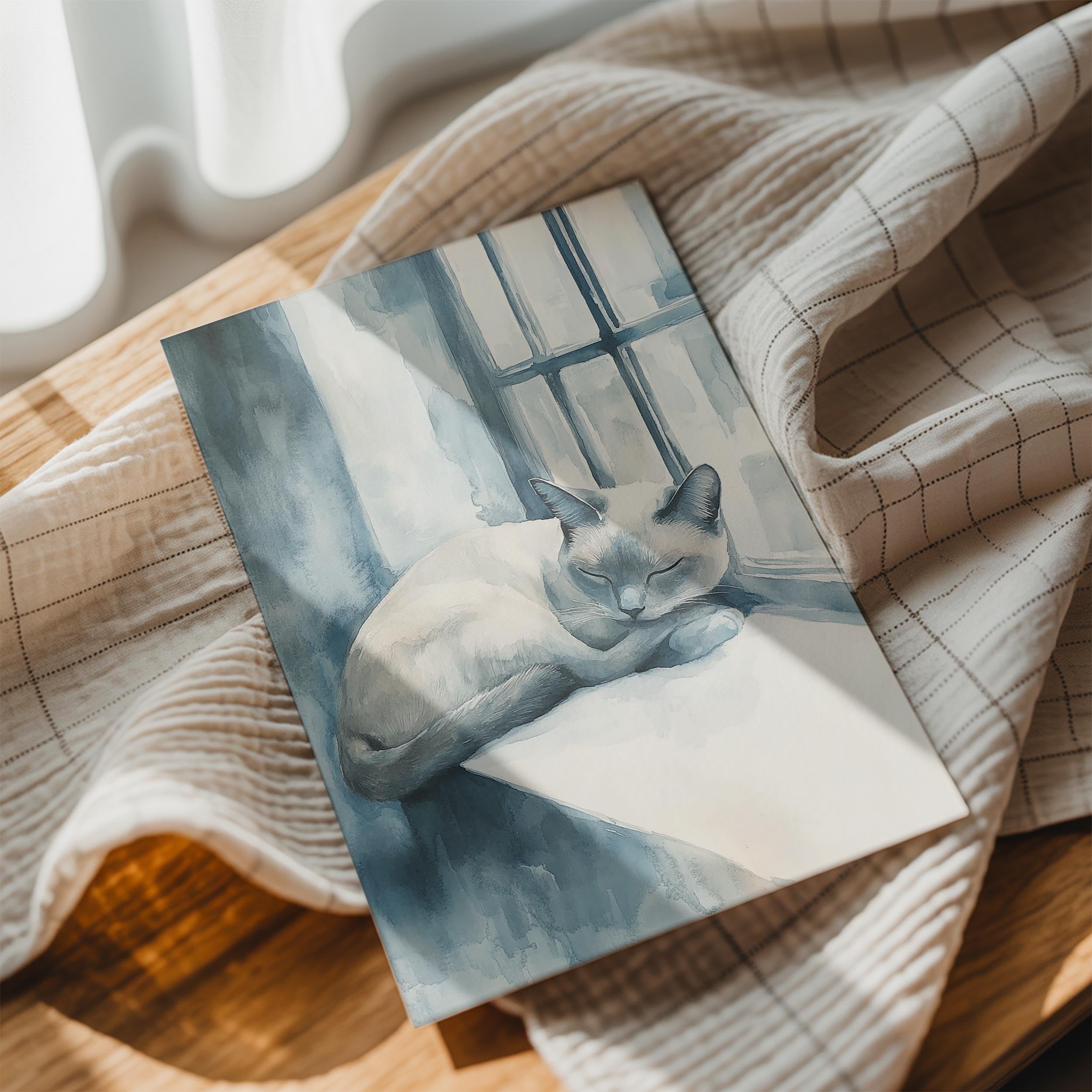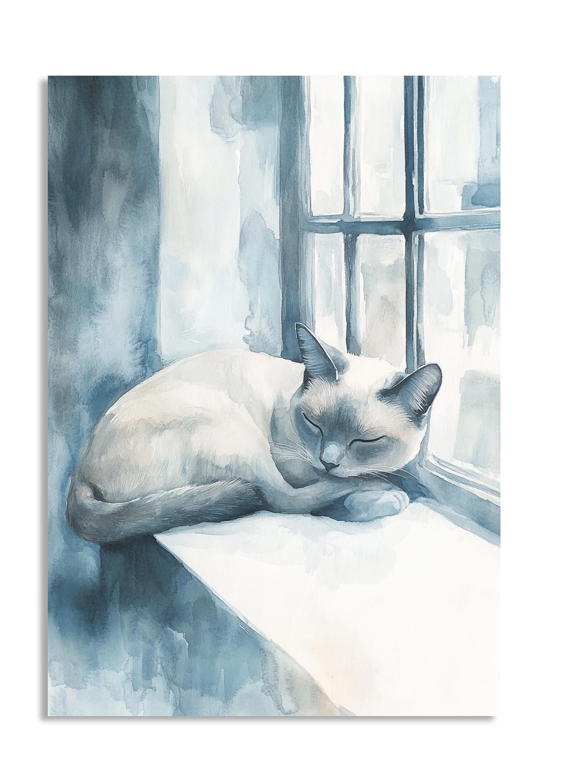 This watercolor-inspired painting depicts a tranquil blue-toned cat curled up on a windowsill, basking in soft natural light. The calming color palette of blues and whites enhances the sense of serenity and relaxation, making this artwork an excellent choice for bedrooms, study areas, or peaceful retreats. The delicate brushstrokes add a dreamy effect, evoking a sense of solitude and quiet reflection. This piece would pair well with minimalist or cozy interior styles.