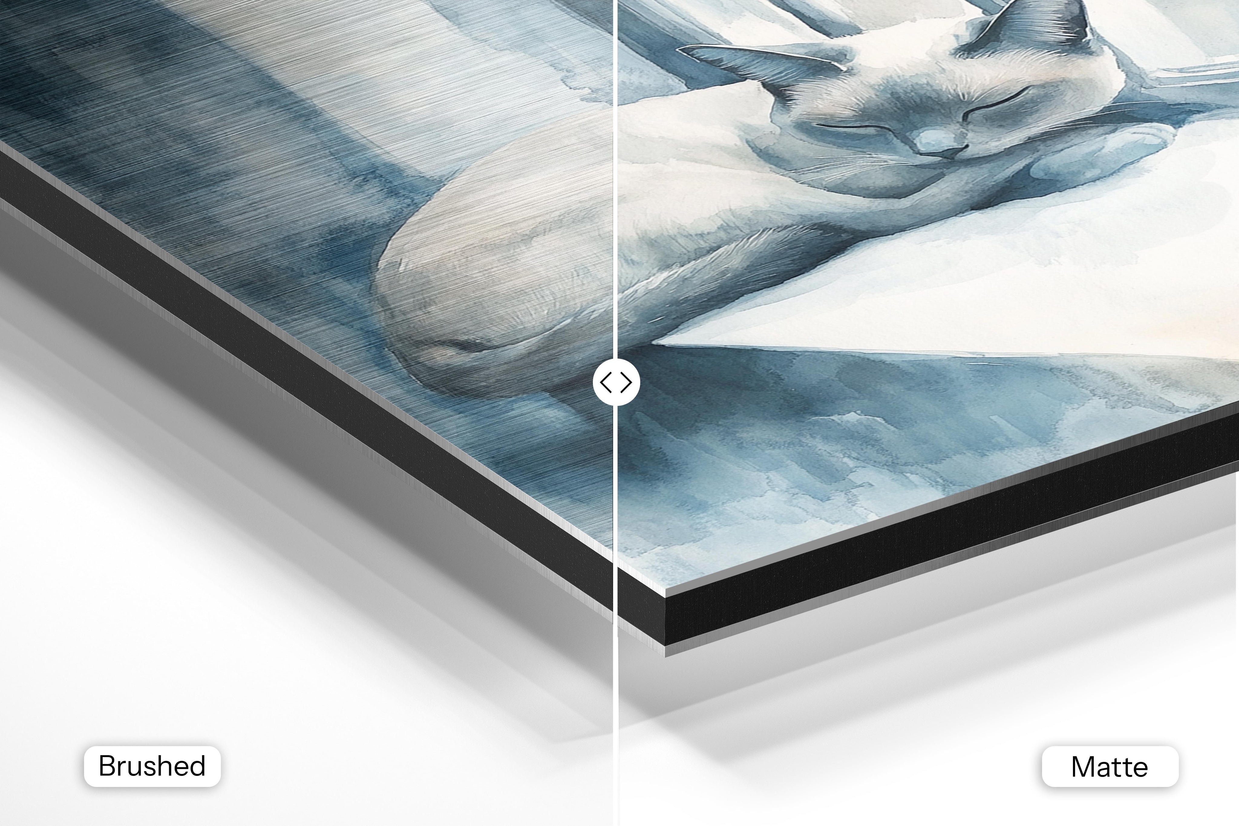 - Brushed Aluminum, on the other hand, features a raw metallic texture with visible brush strokes. Whites and highlights in your image let the silver surface show through, adding a dramatic, shimmering effect. Ideal for black-and-white images, minimalist designs, or abstract art, it creates a bold, industrial vibe with a modern edge.