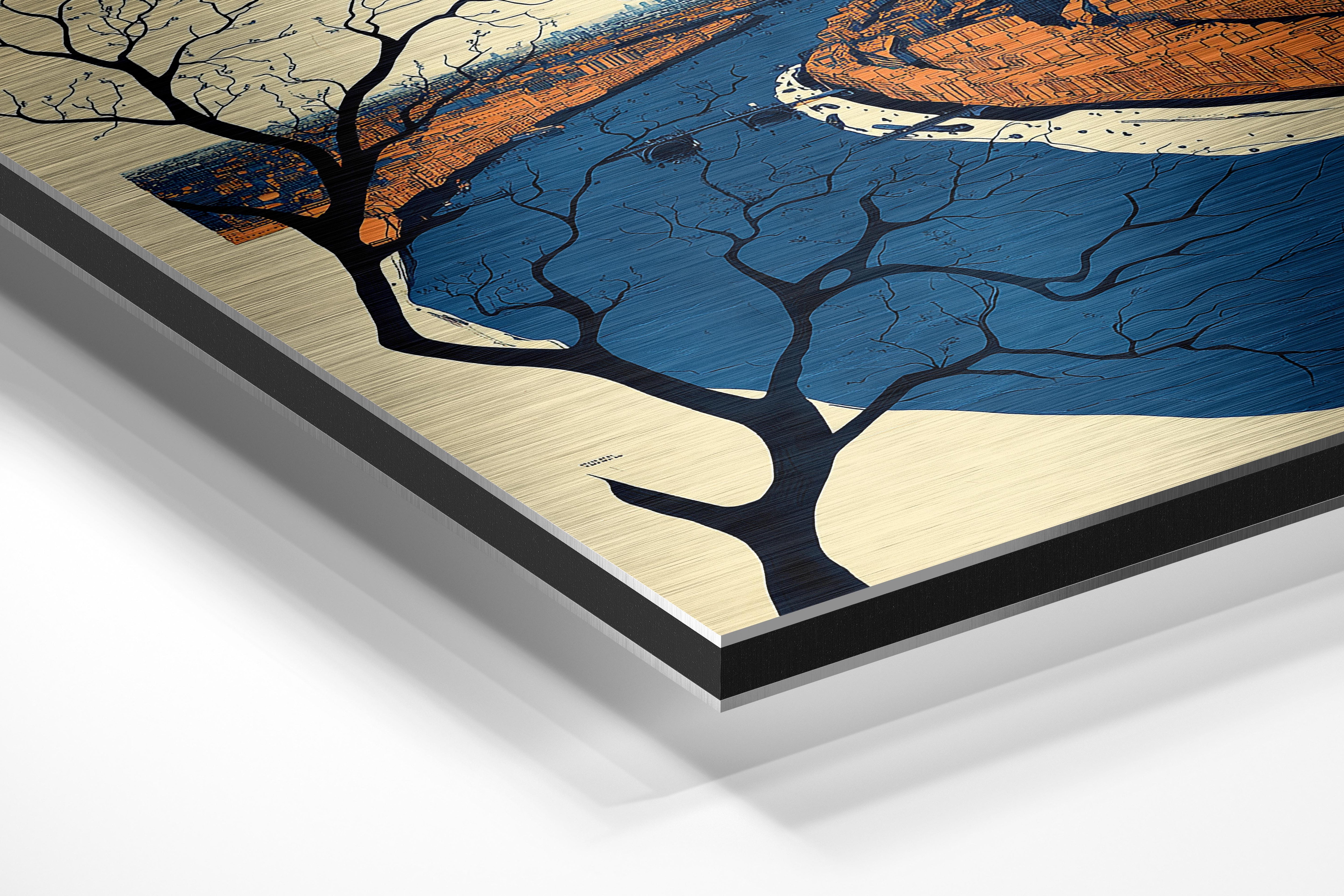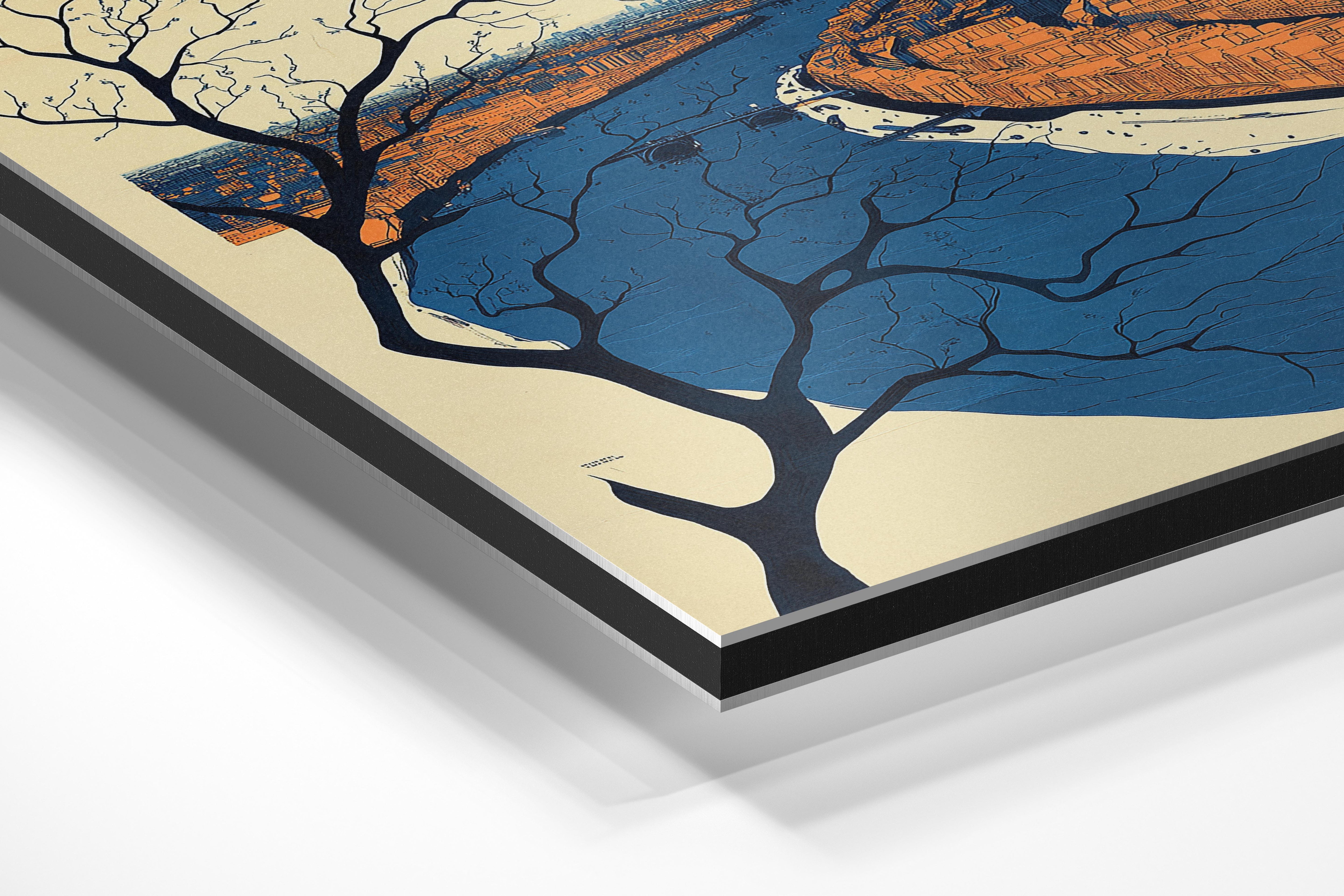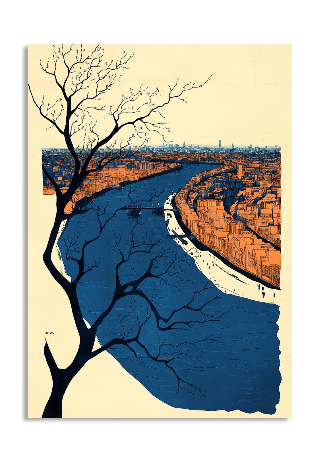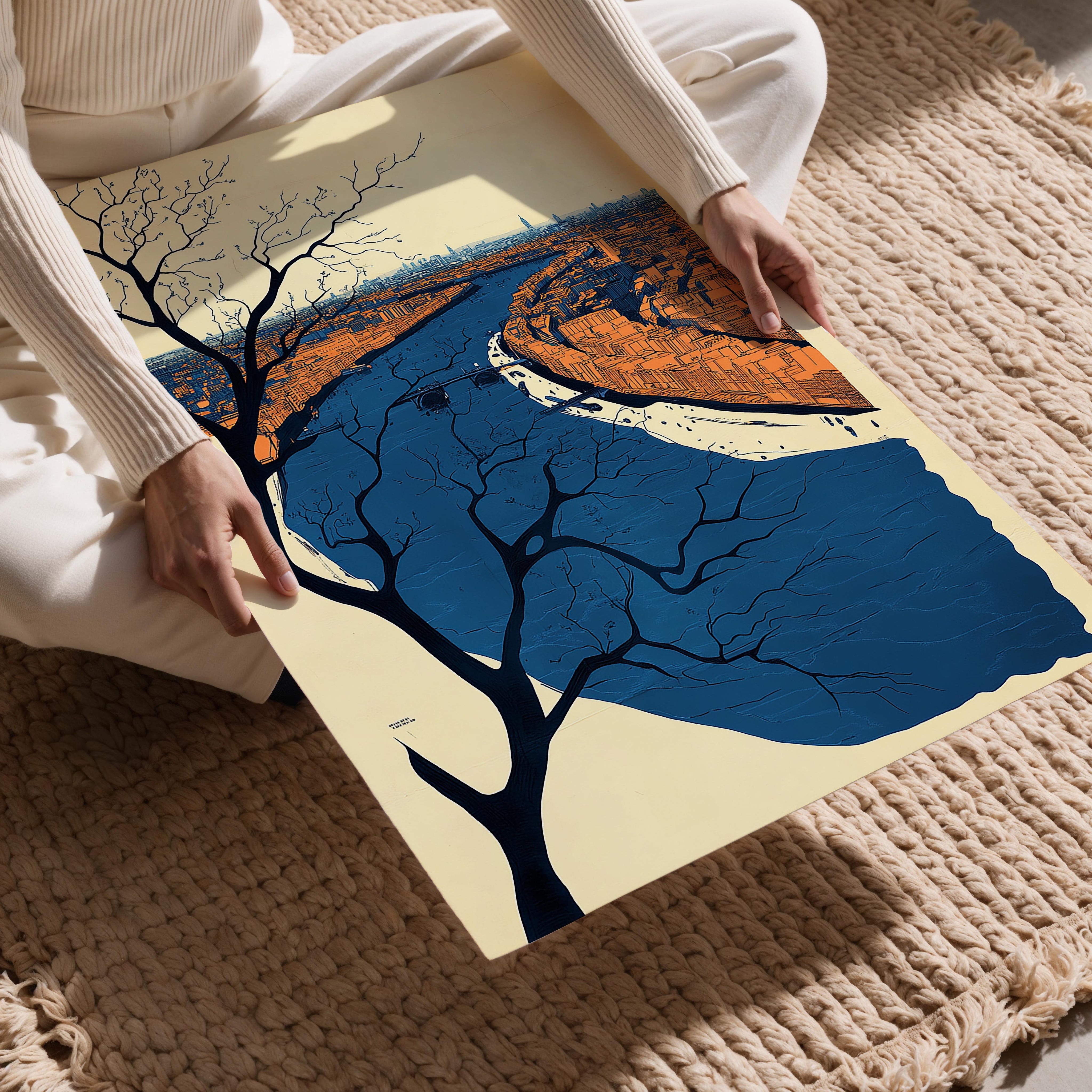 This stunning artwork captures a winding blue river slicing through a detailed cityscape. The juxtaposition of the urban setting with natural elements creates a harmonious balance, enhanced by the artistic depiction of tree branches in the foreground. Ideal for lovers of urban landscapes and nature-inspired decor, this piece would add charm to homes or offices. Its serene tones and thoughtful composition bring a sense of calm and connection to the viewer.