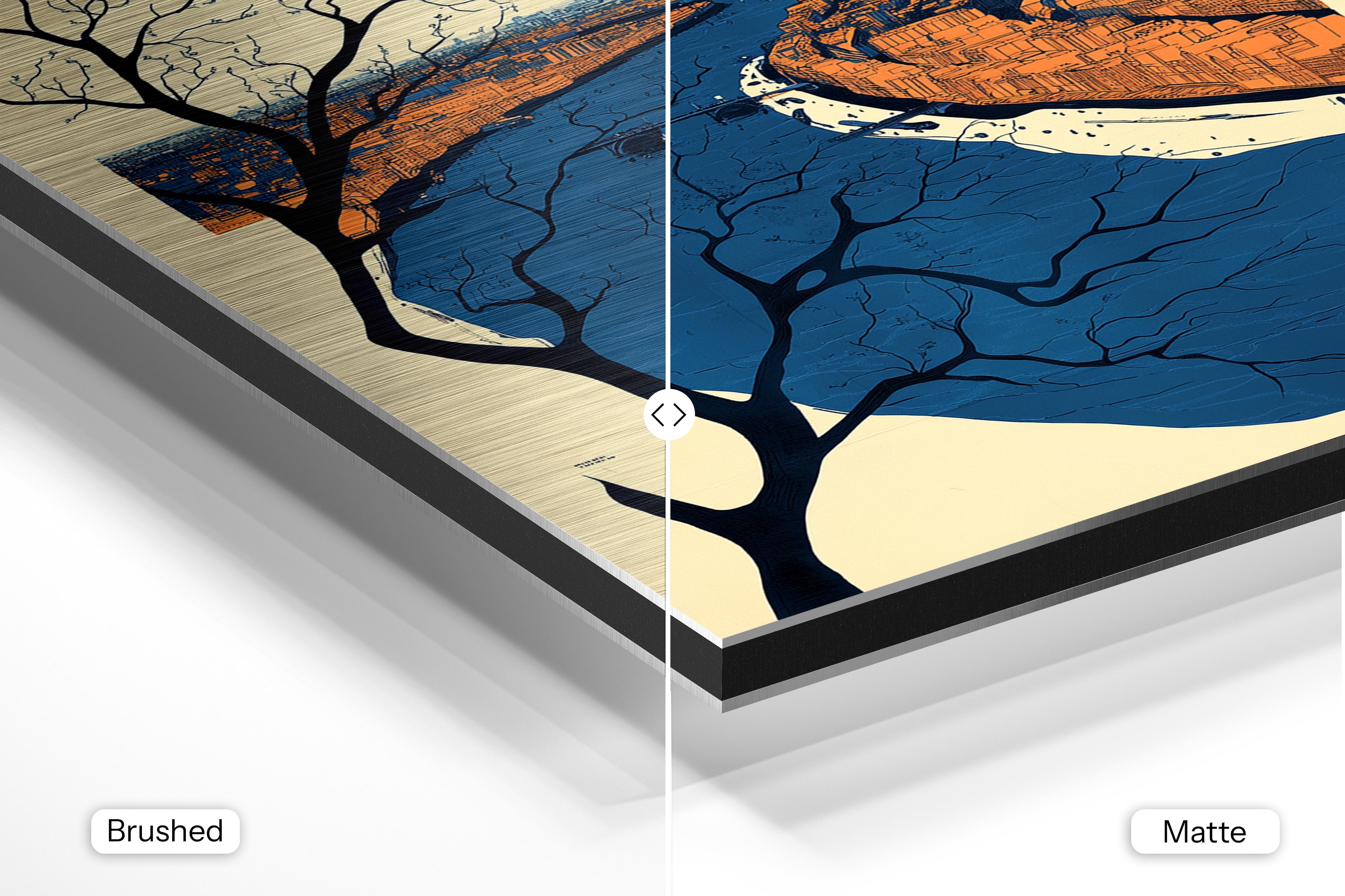 - Brushed Aluminum, on the other hand, features a raw metallic texture with visible brush strokes. Whites and highlights in your image let the silver surface show through, adding a dramatic, shimmering effect. Ideal for black-and-white images, minimalist designs, or abstract art, it creates a bold, industrial vibe with a modern edge.