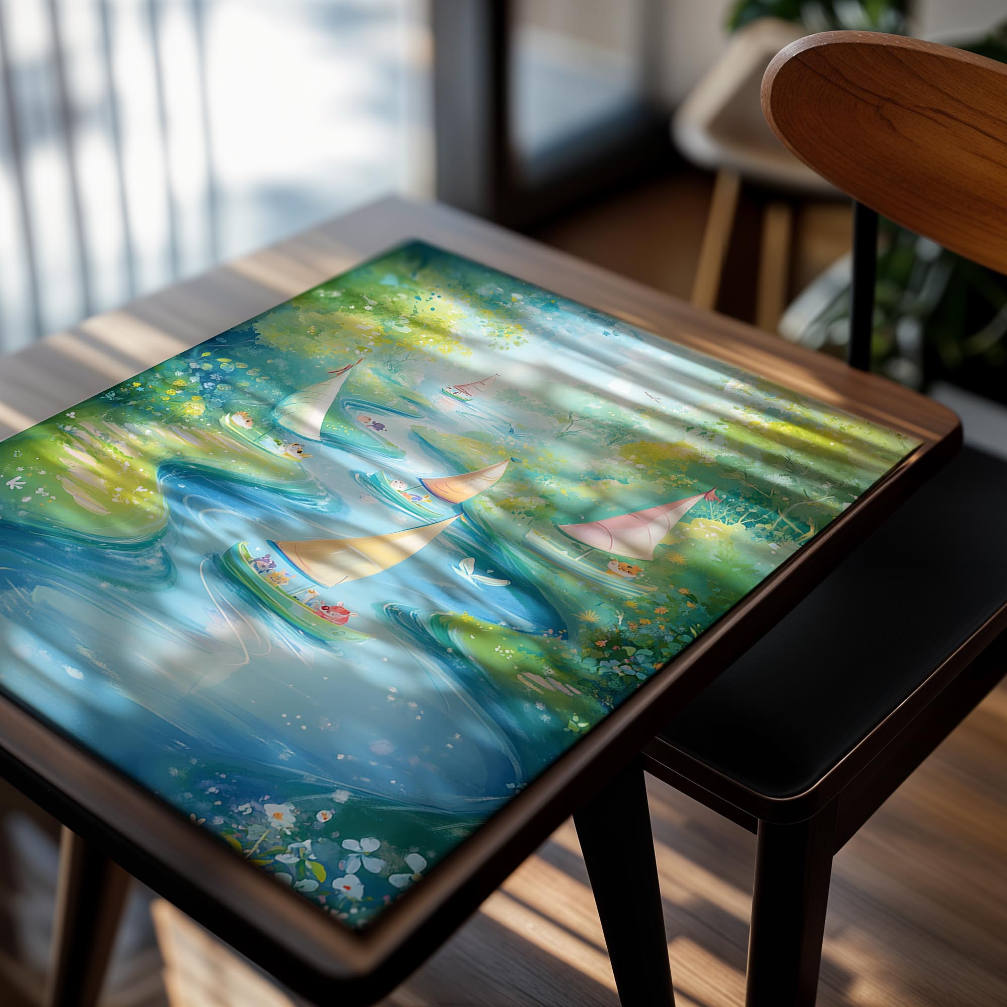 This serene illustration depicts colorful boats gently gliding along a sparkling stream surrounded by lush greenery and blooming flowers. The pastel hues and delicate details of the scene create a tranquil and idyllic ambiance. Perfect for nature lovers, this artwork evokes feelings of peace and relaxation, making it an excellent choice for living rooms or meditation spaces. Its dreamy quality invites viewers to imagine themselves embarking on a gentle adventure through an enchanted, picturesque landscape.