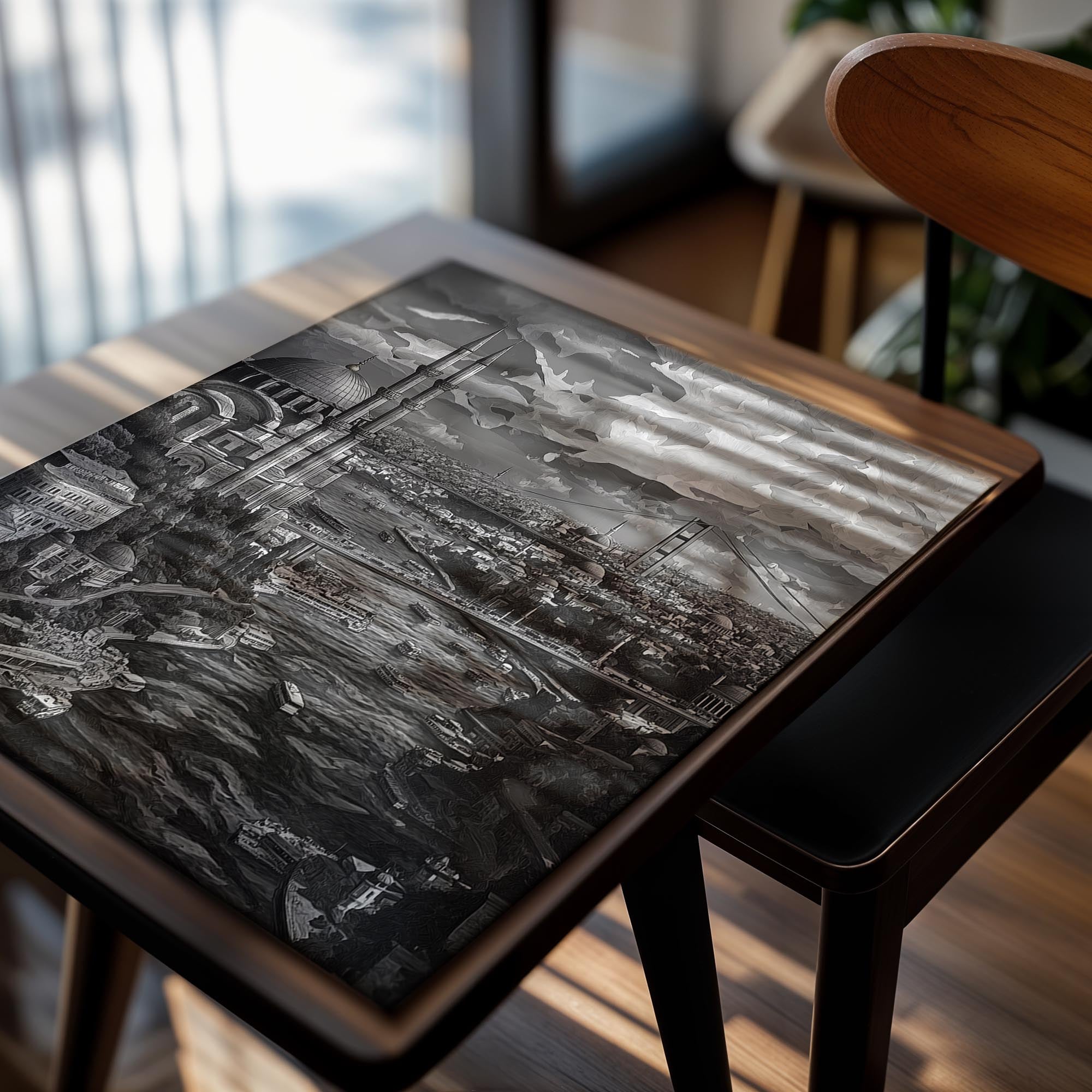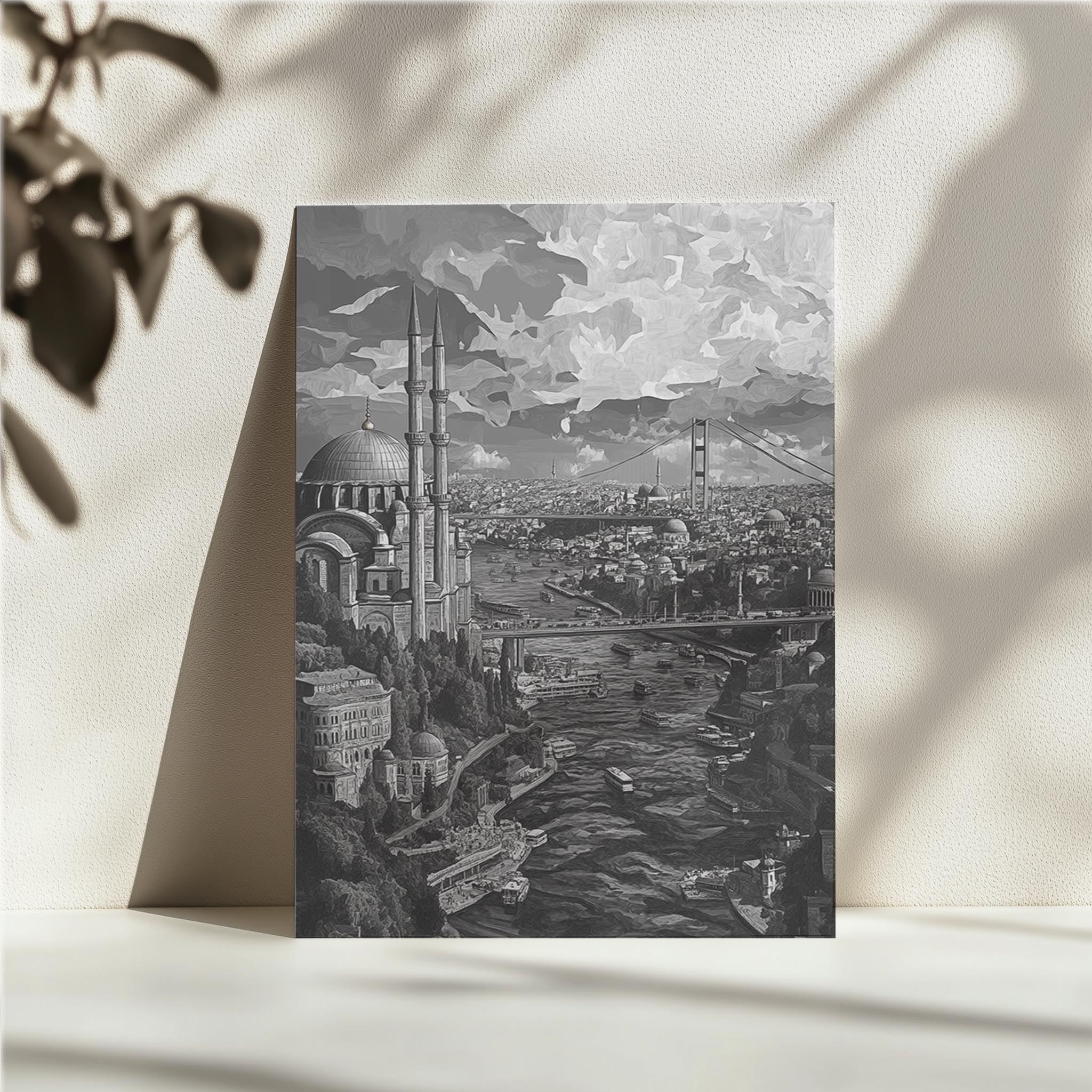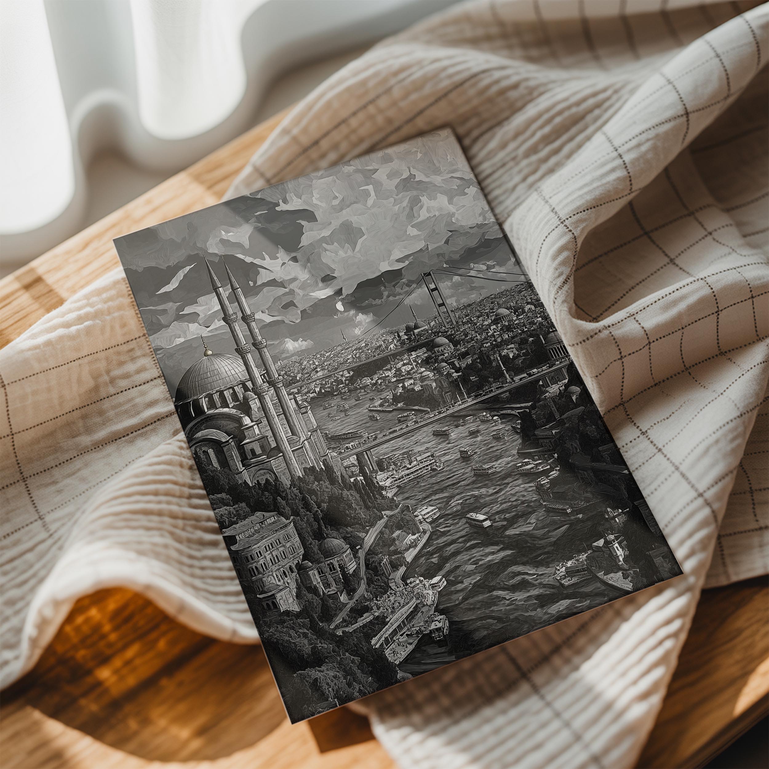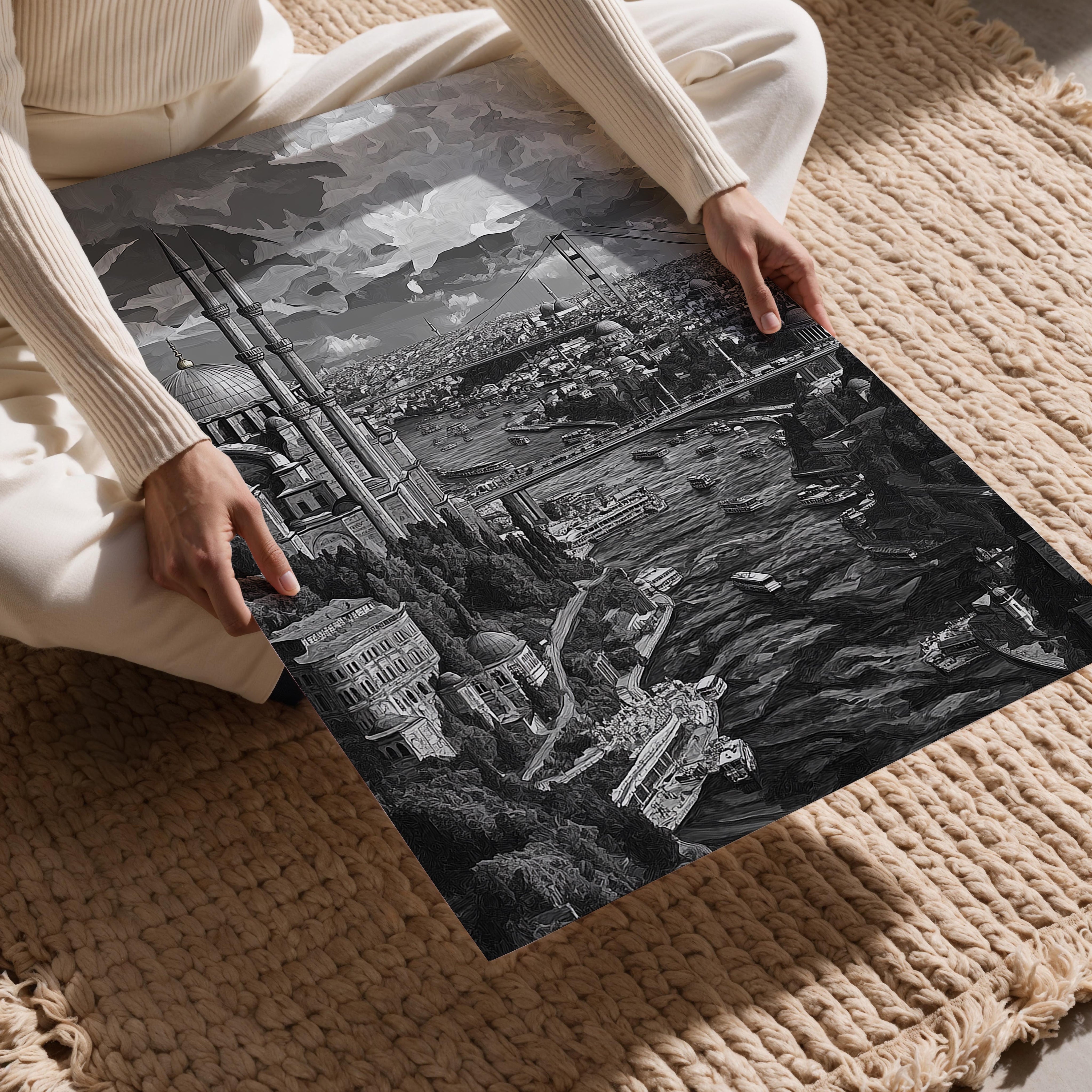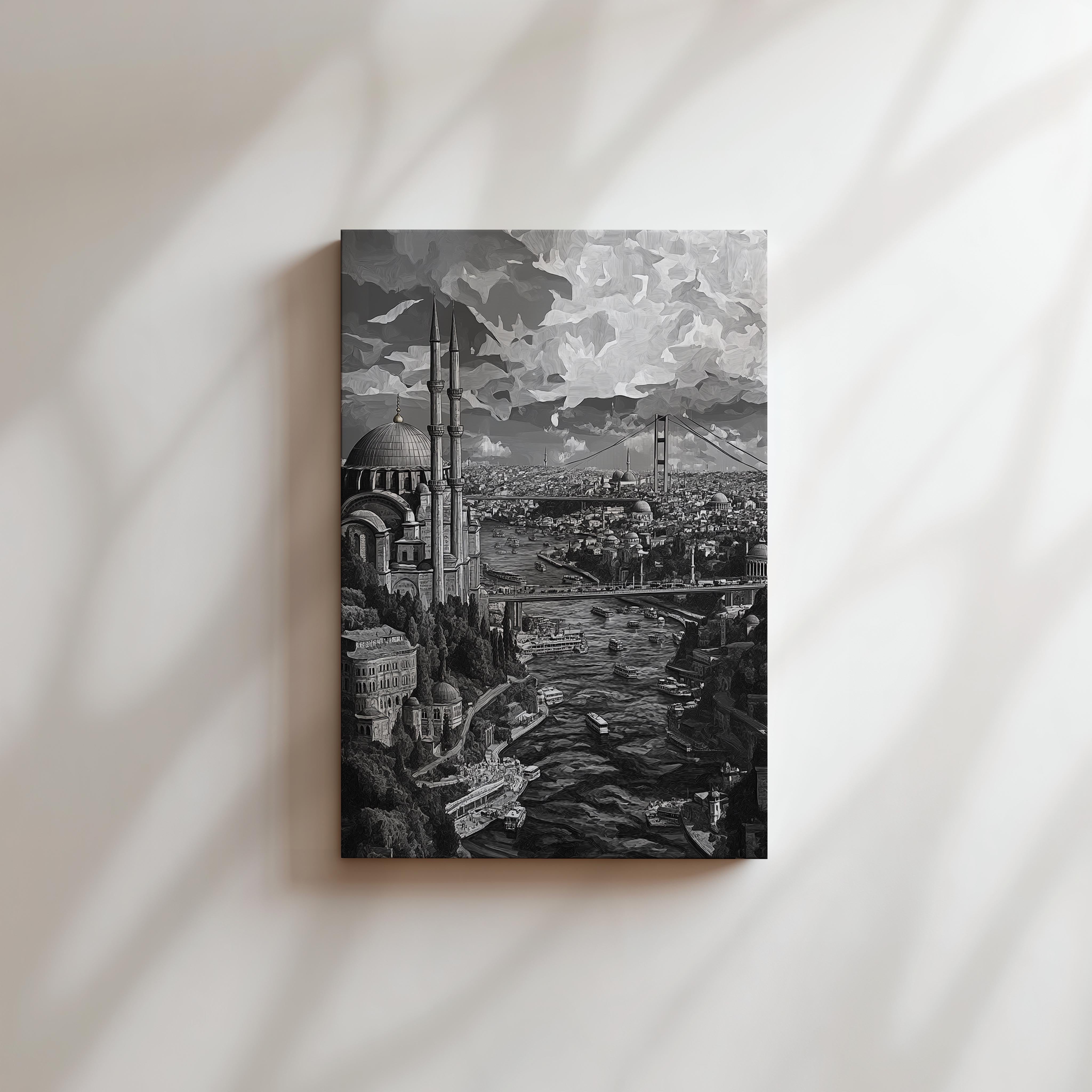 A breathtaking aerial depiction of Istanbul, featuring the Bosphorus Strait and its iconic bridges. This grayscale artwork is rich in detail, capturing the vibrant energy of the city’s skyline. Perfect for spaces with a global or travel-inspired theme, it offers a sophisticated representation of Istanbul’s unique charm and vitality. Its intricate design adds a sense of adventure and appreciation for urban beauty.