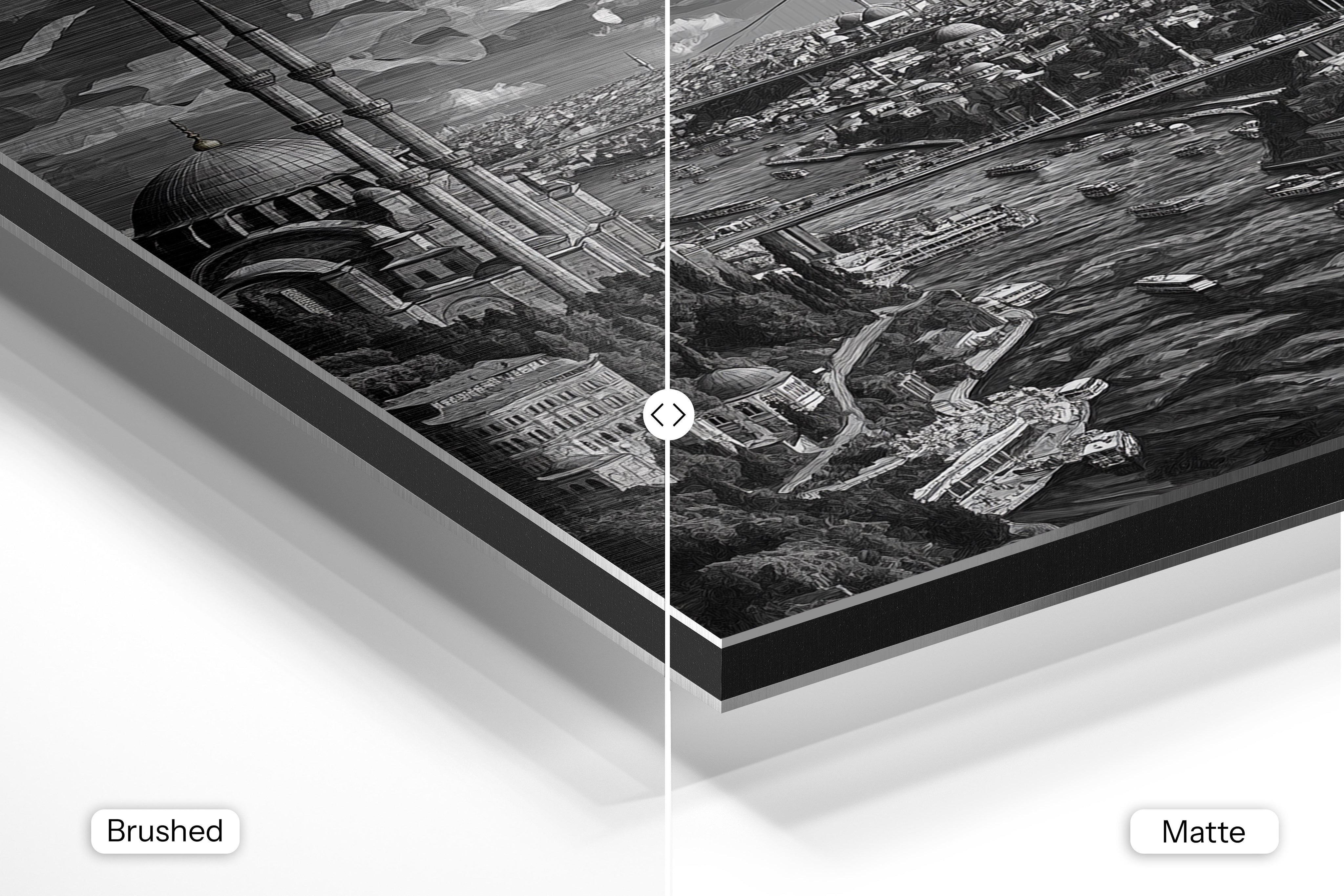 - Brushed Aluminum, on the other hand, features a raw metallic texture with visible brush strokes. Whites and highlights in your image let the silver surface show through, adding a dramatic, shimmering effect. Ideal for black-and-white images, minimalist designs, or abstract art, it creates a bold, industrial vibe with a modern edge.