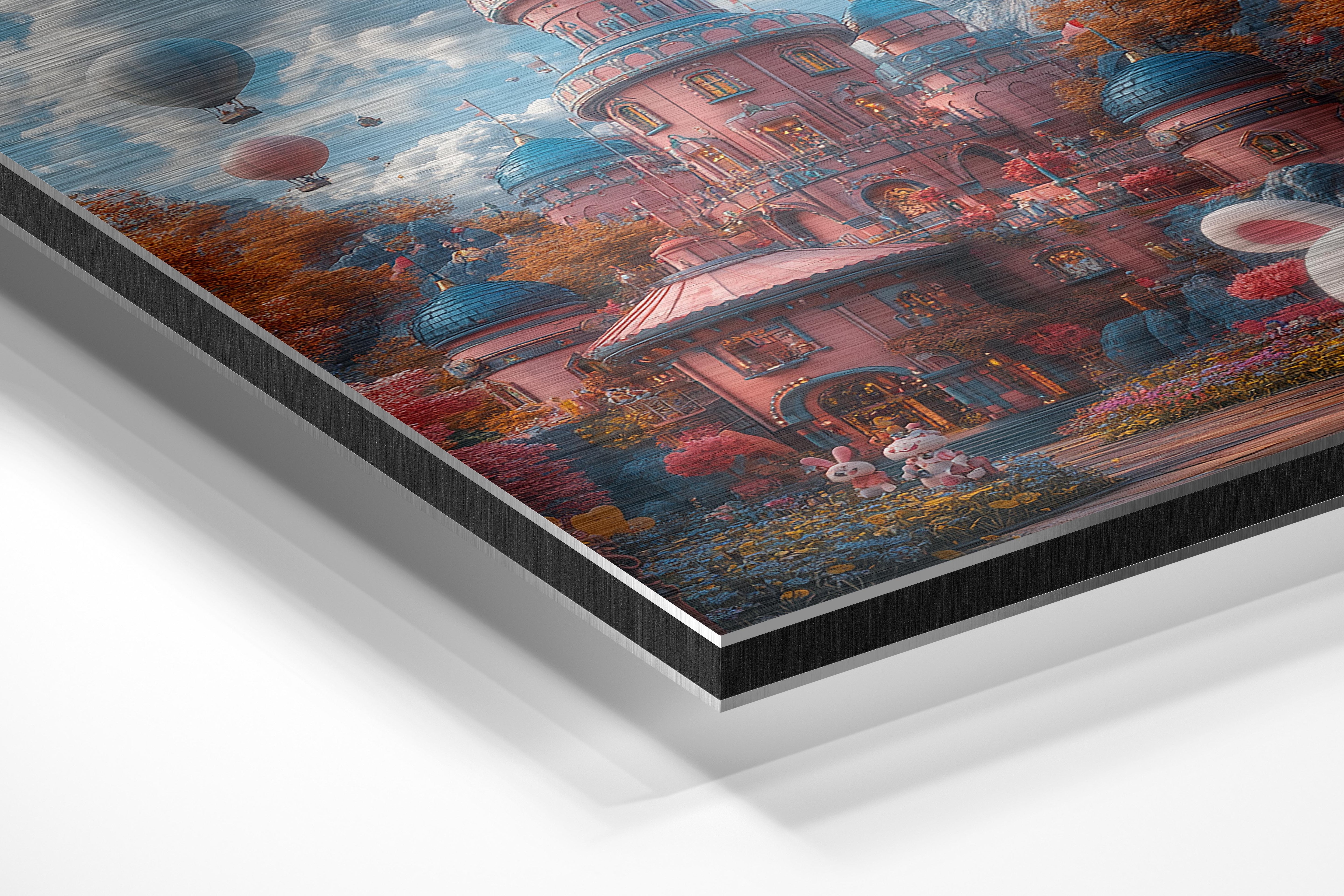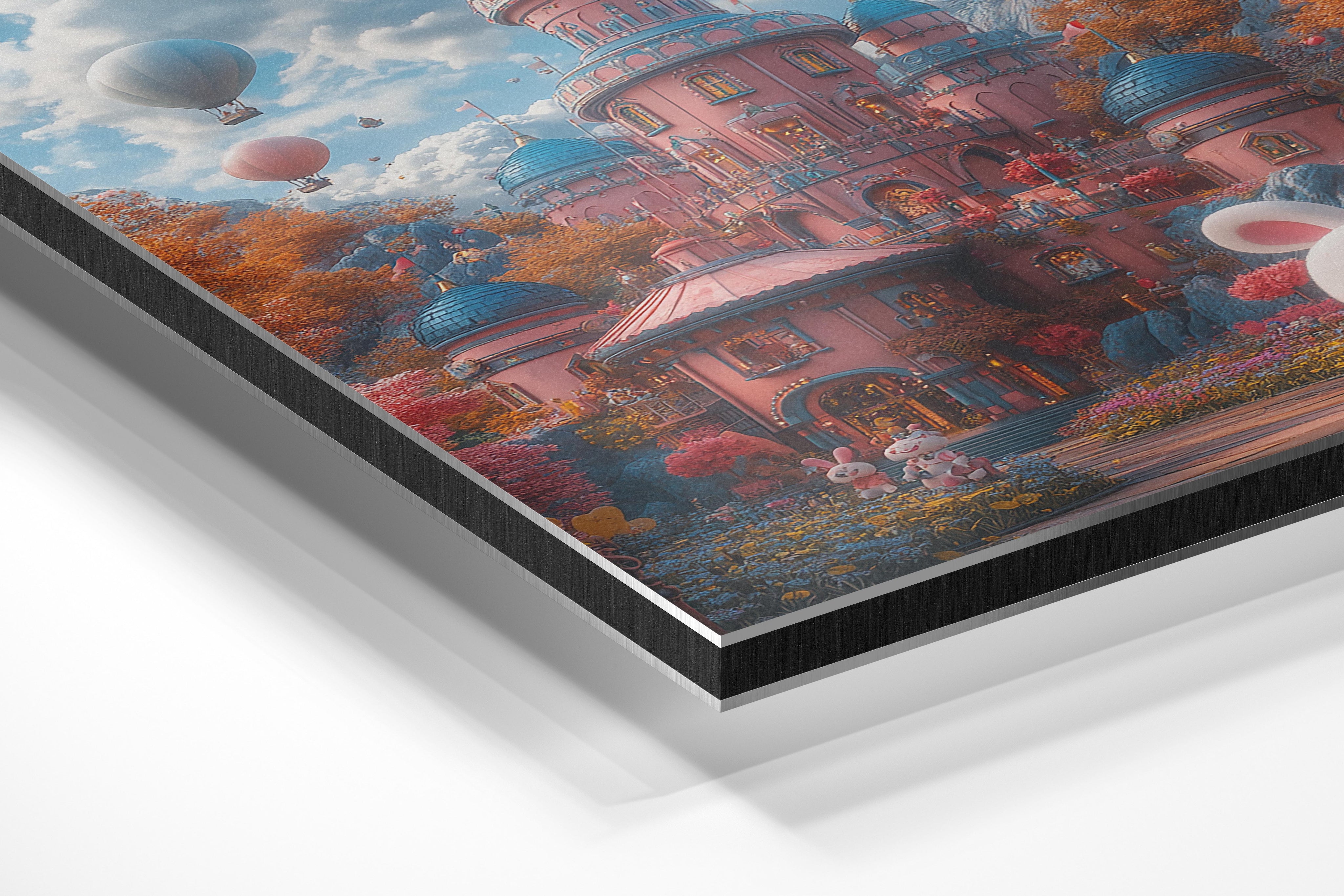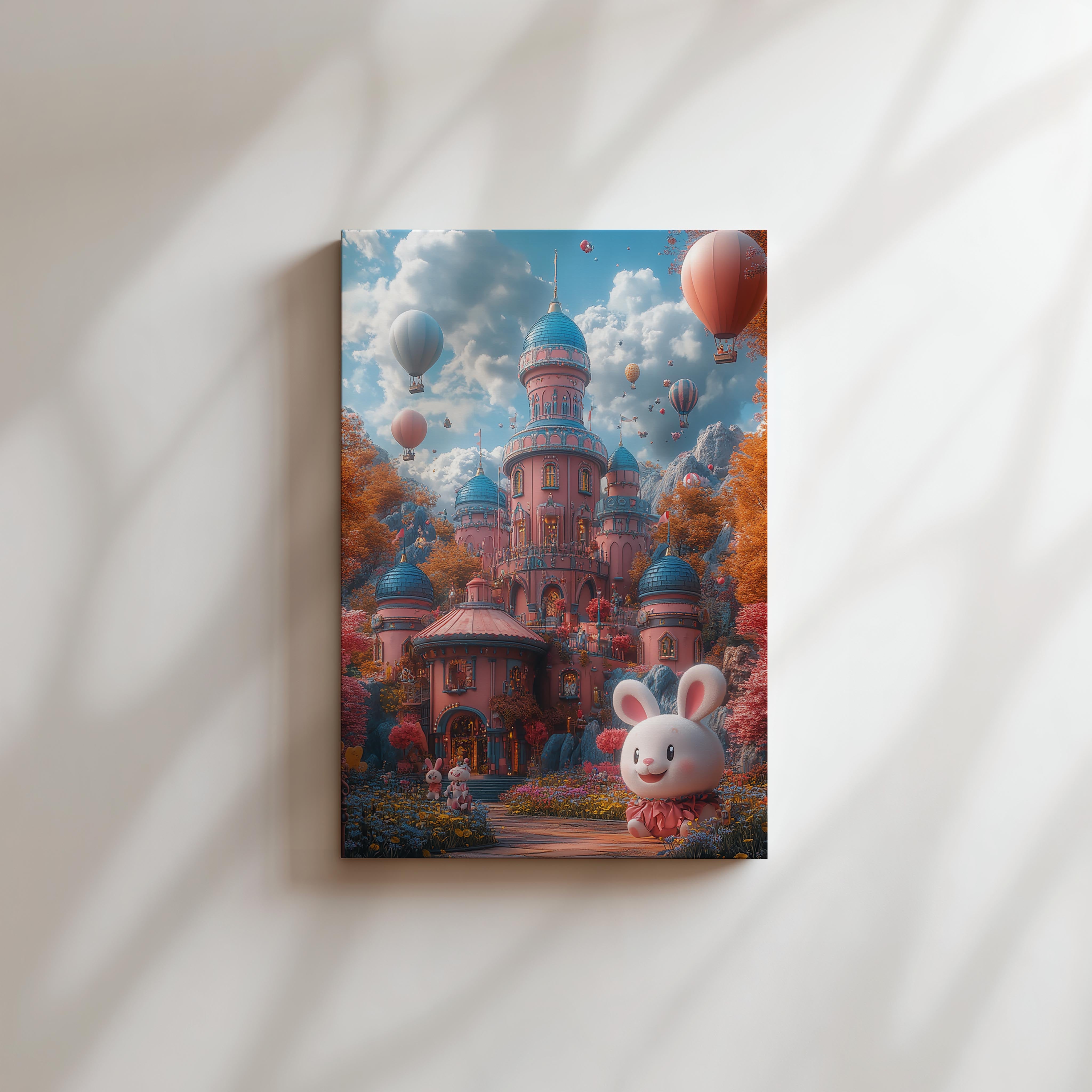 A whimsical castle surrounded by bunny characters in a vibrant, fantasy-inspired setting. The pastel colors and imaginative details make it perfect for nurseries, fantasy-themed rooms, or creative spaces. This artwork is a celebration of joy and creativity, bringing charm and warmth to any wall.