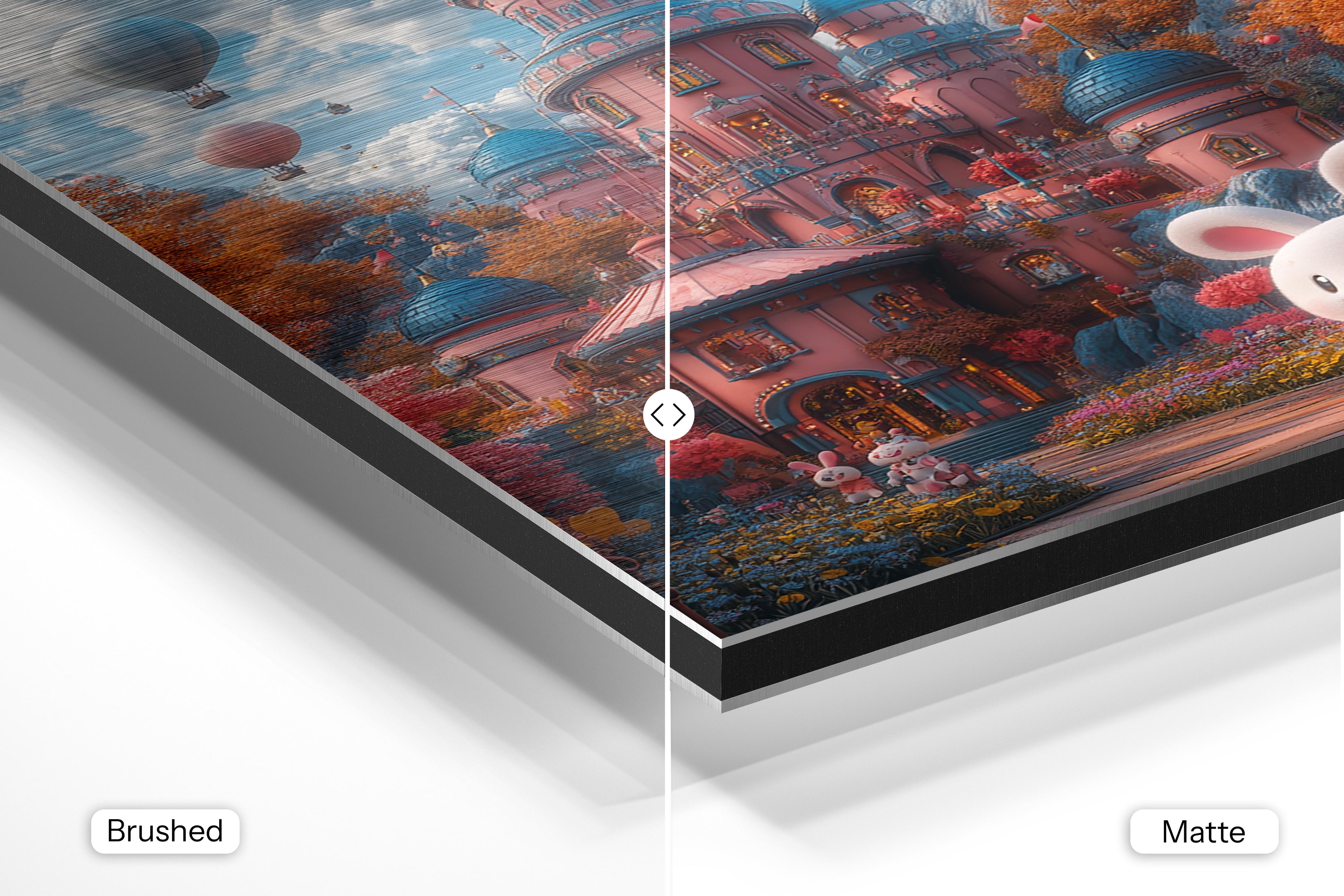 - Matte Aluminum offers a smooth, bright white surface that delivers crisp details and vibrant, true-to-life colors. With its non-reflective finish and subtle silky sheen, it’s perfect for photography, portraits, and colorful artwork—bringing a clean, polished look to any interior.
