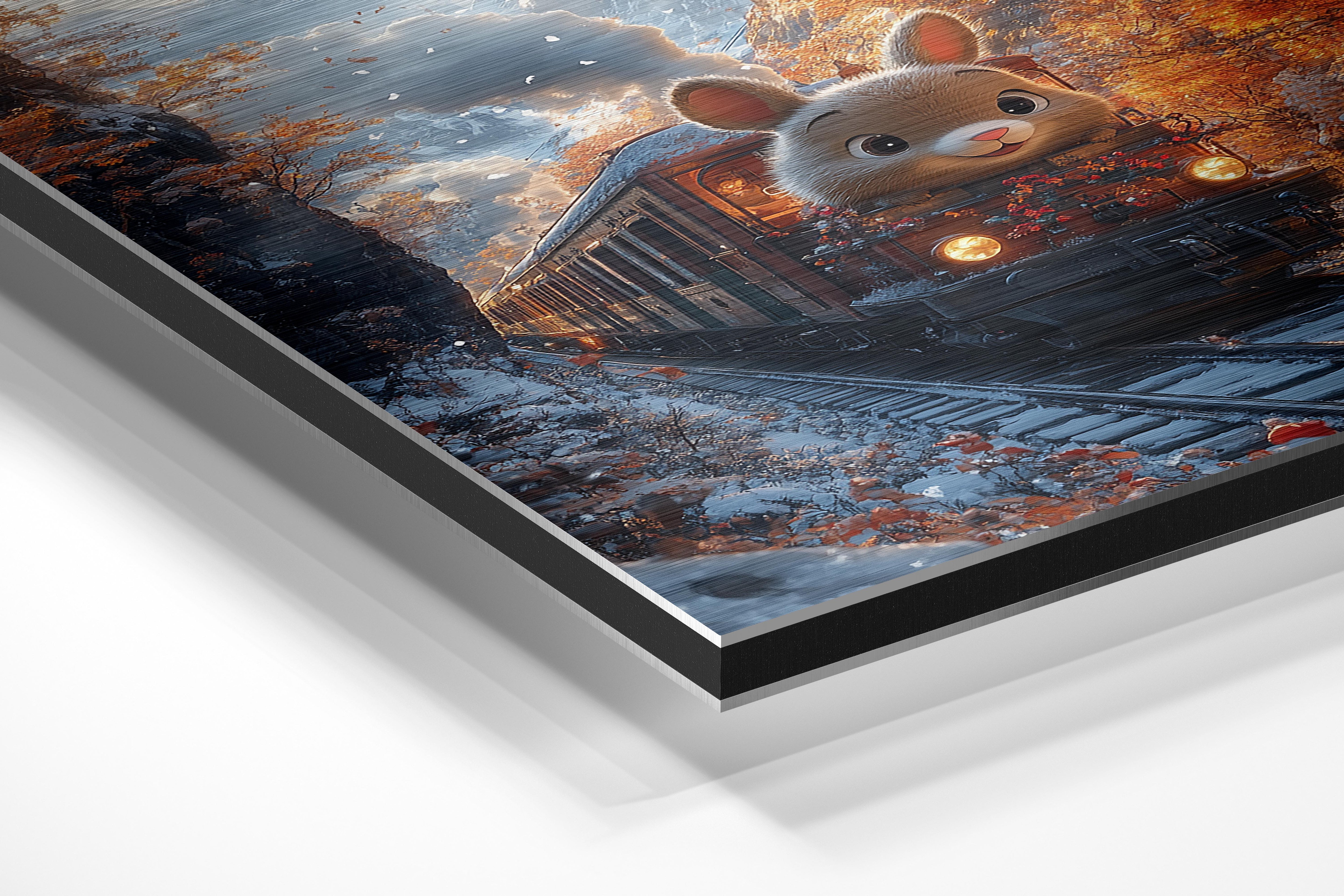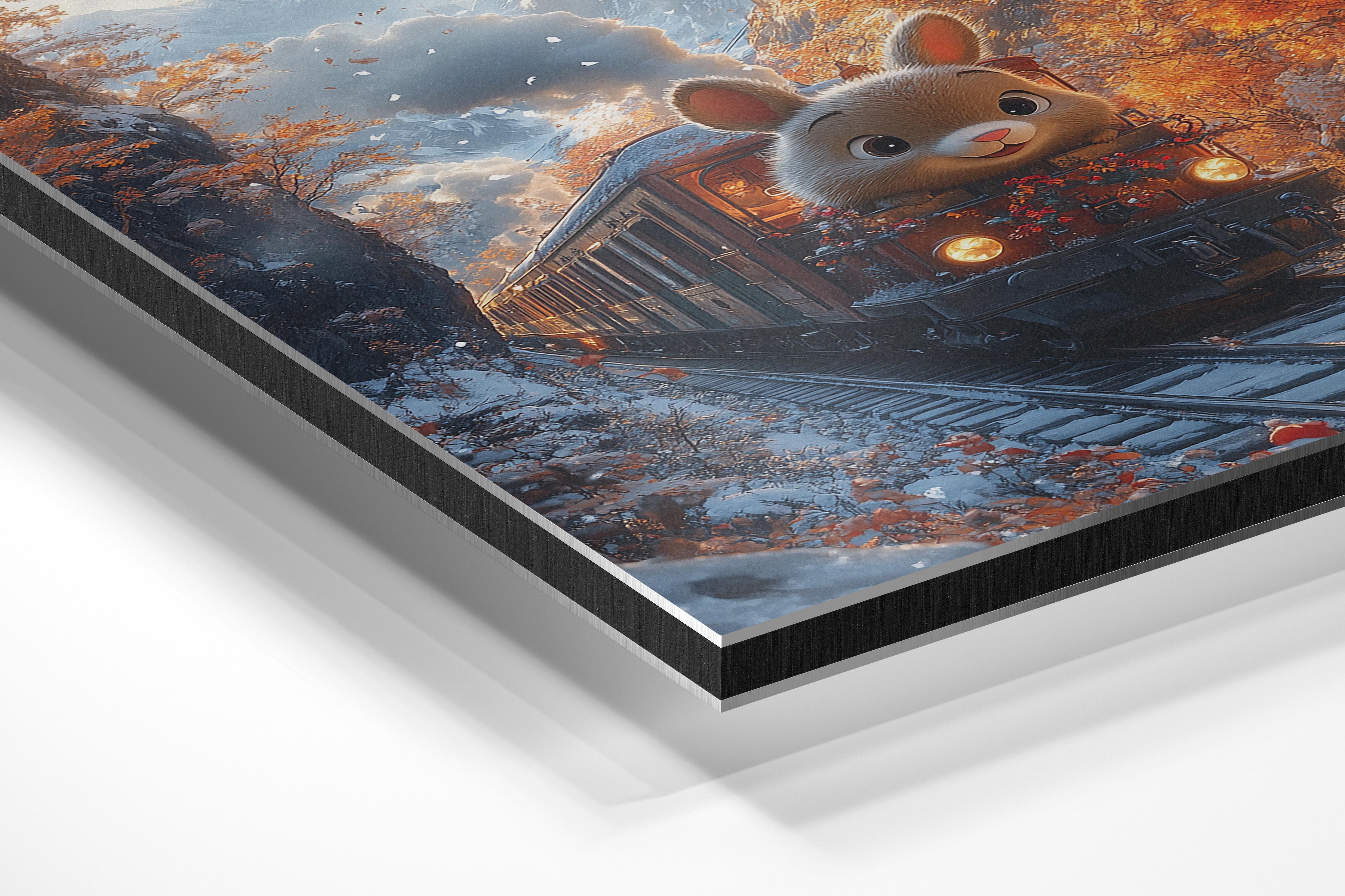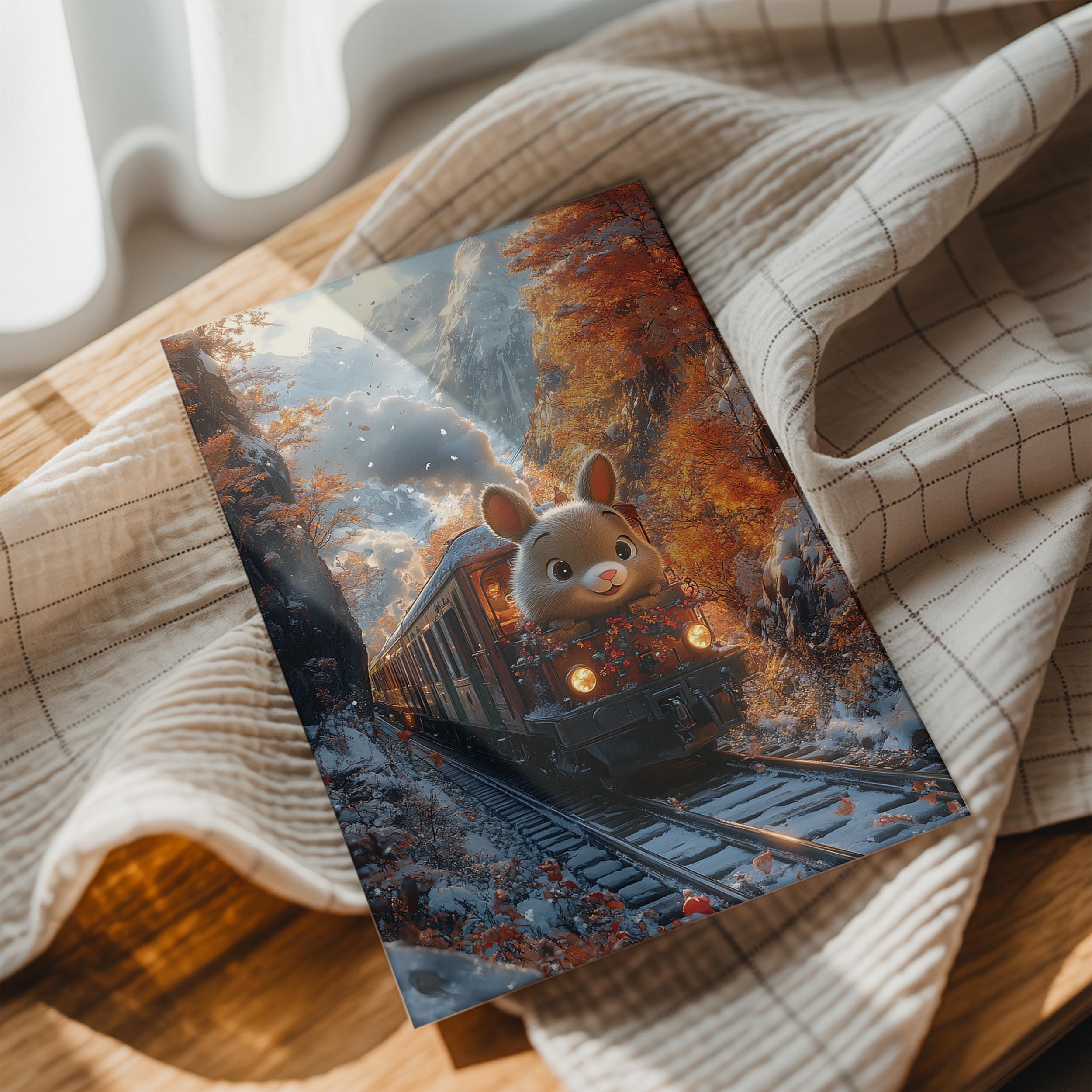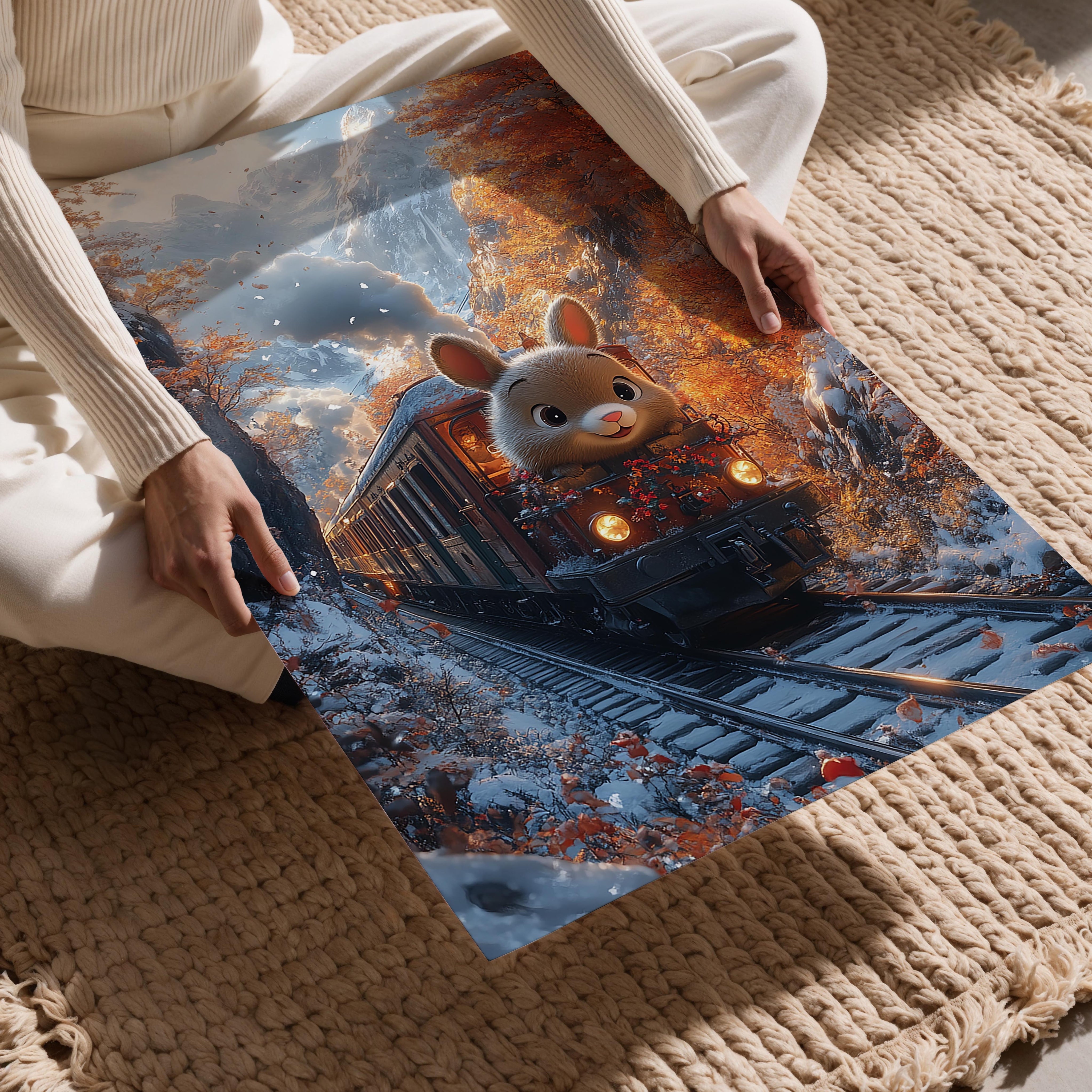 This whimsical illustration captures the adventurous spirit of a bunny riding on the front of a vintage train as it weaves through an enchanting autumn landscape. The vibrant hues of orange and red leaves contrast beautifully with the snowy mountain peaks in the background. The soft plume of smoke rising from the train adds a sense of motion and nostalgia. This piece inspires wanderlust and playfulness, making it a perfect addition to children's rooms or creative spaces. It brings together elements of nature, adventure, and imagination in a scene that sparks joy and curiosity.
