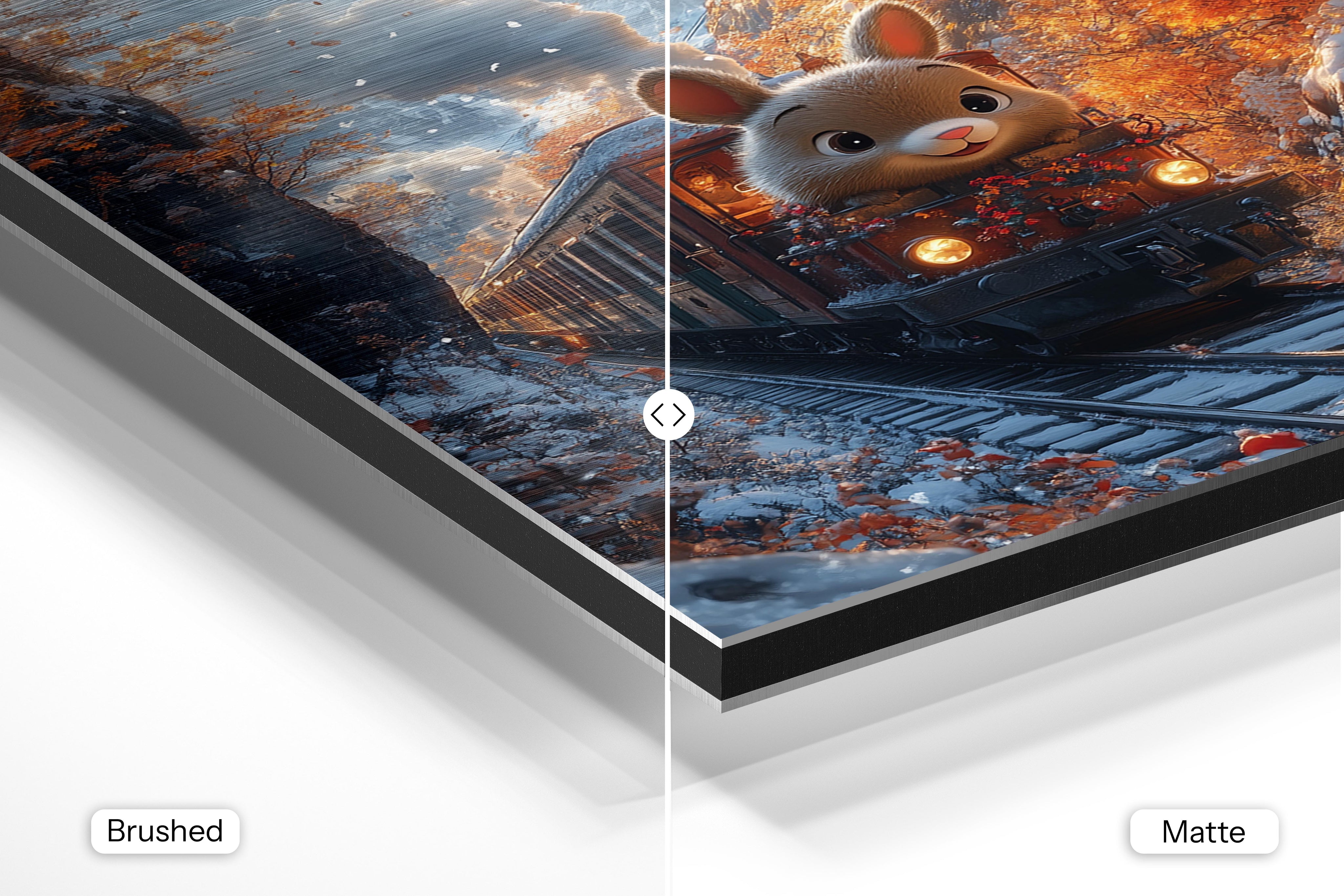 - Brushed Aluminum, on the other hand, features a raw metallic texture with visible brush strokes. Whites and highlights in your image let the silver surface show through, adding a dramatic, shimmering effect. Ideal for black-and-white images, minimalist designs, or abstract art, it creates a bold, industrial vibe with a modern edge.