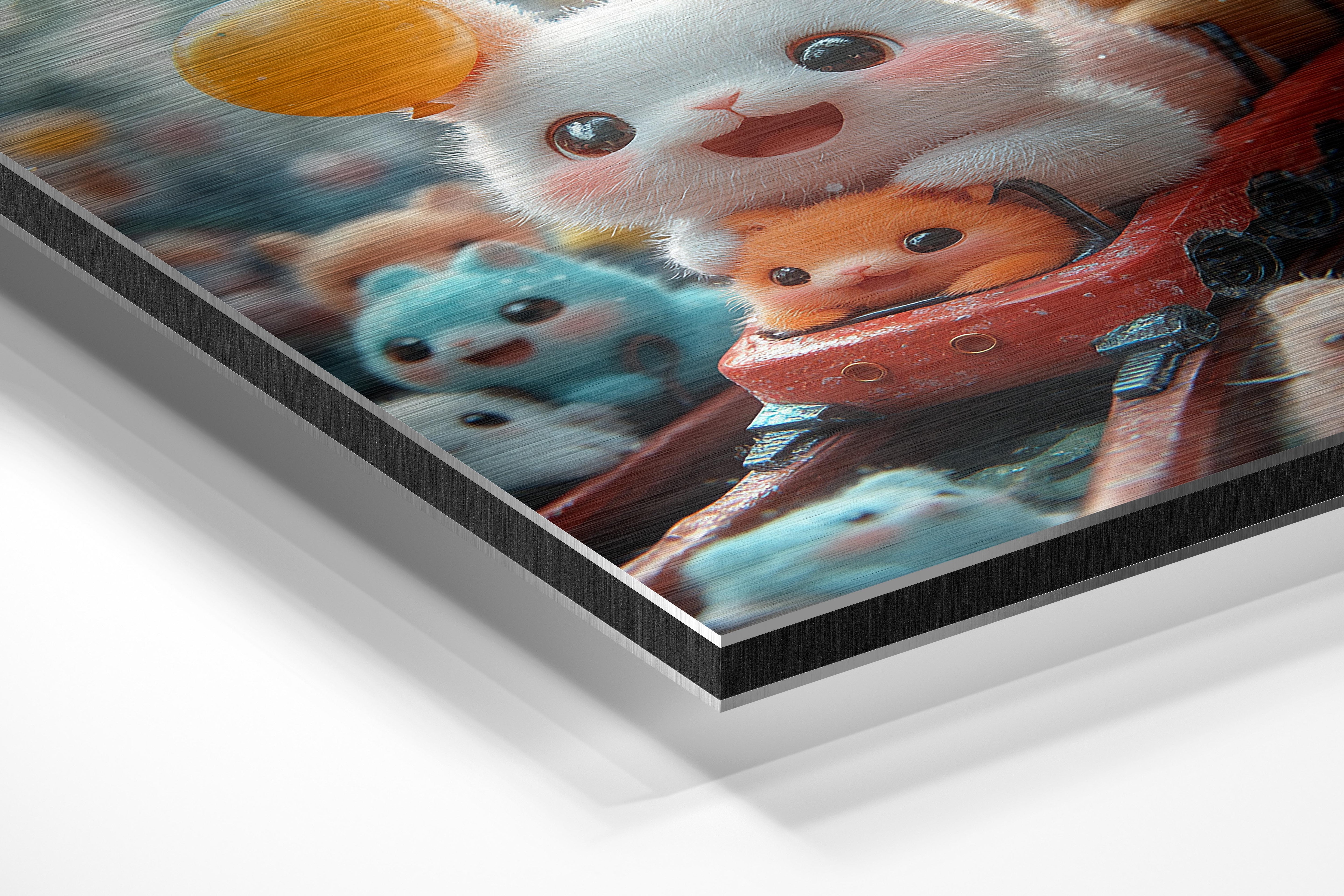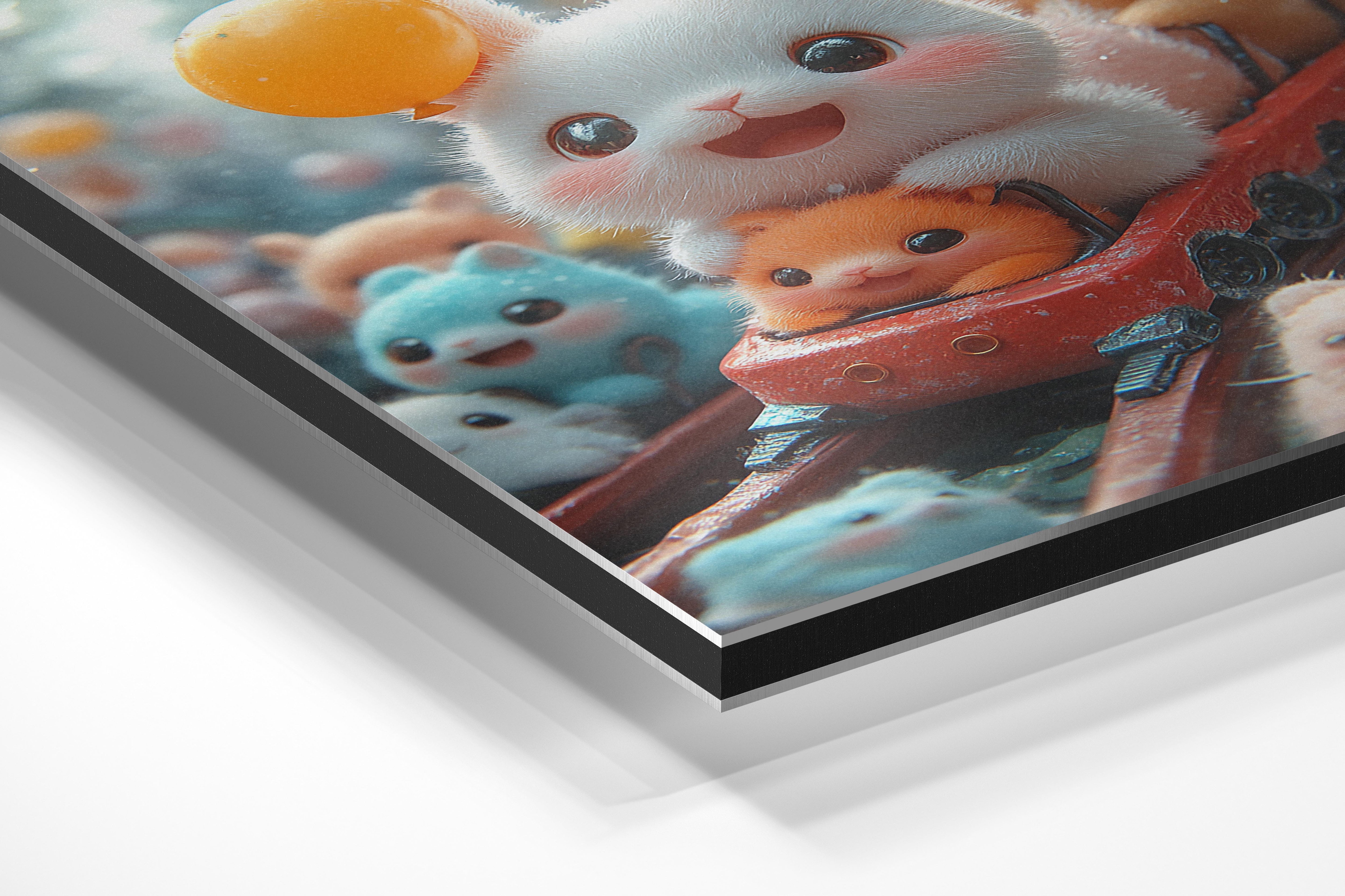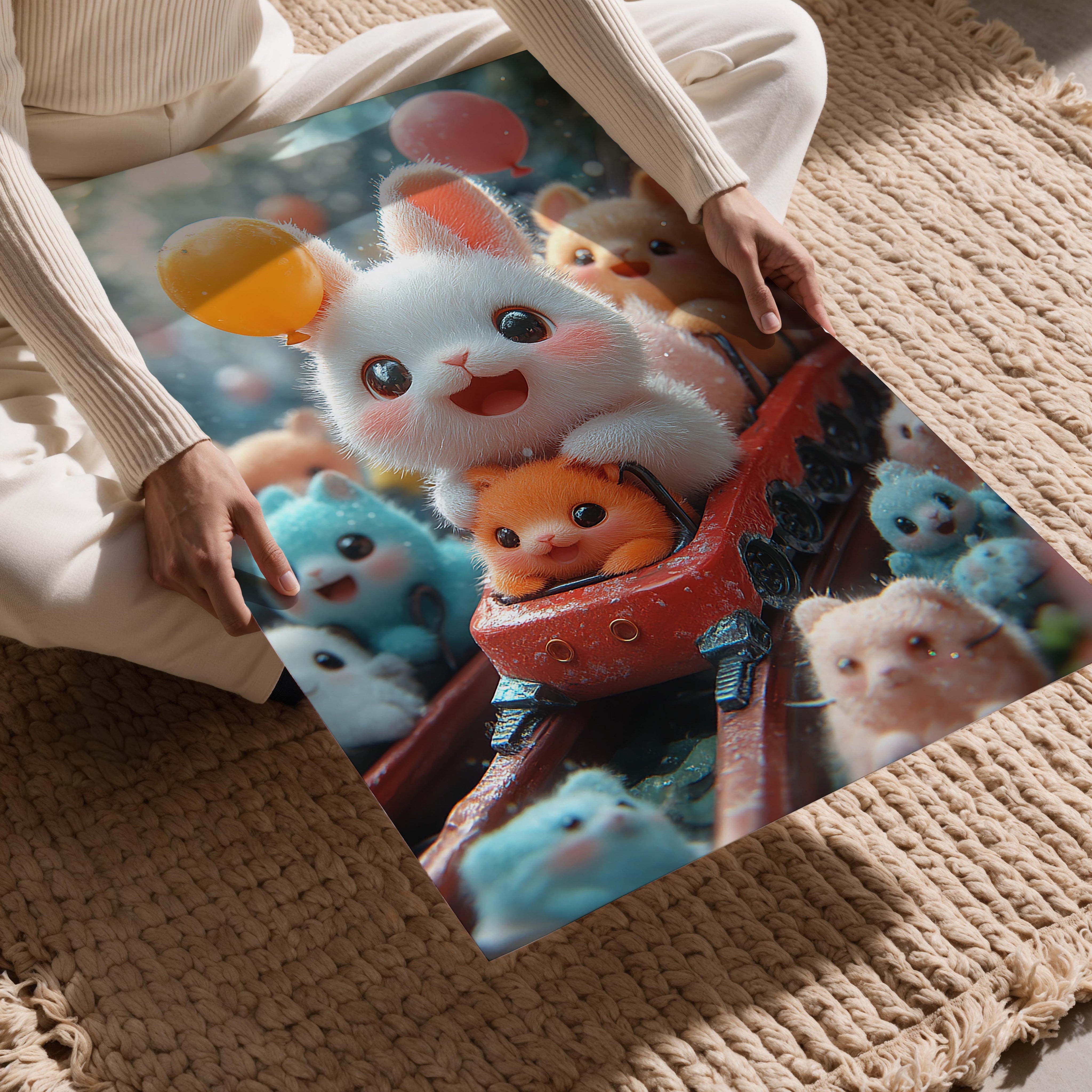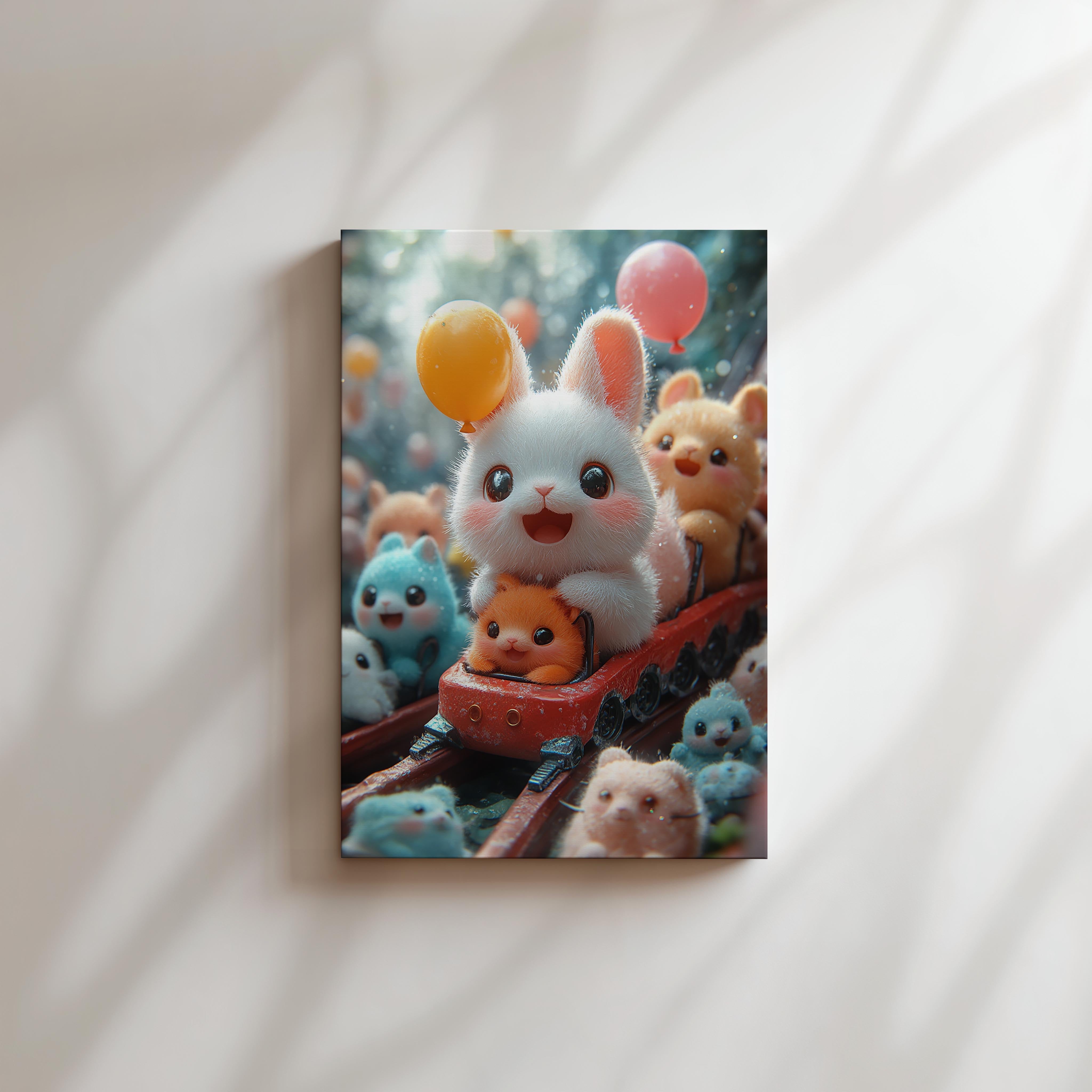 This charming illustration captures an adorable white bunny on a rollercoaster ride surrounded by colorful companions. The bunny's wide smile and the vibrant balloons create a joyous and energetic atmosphere. The fine details, like the shimmering fur and whimsical expressions of the animals, make this piece particularly captivating. It exudes a sense of wonder and fun, perfect for spaces that aim to inspire laughter and delight. Whether in a child’s playroom or a cheerful home office, this artwork adds a playful and uplifting vibe, making it a beloved addition to any setting.