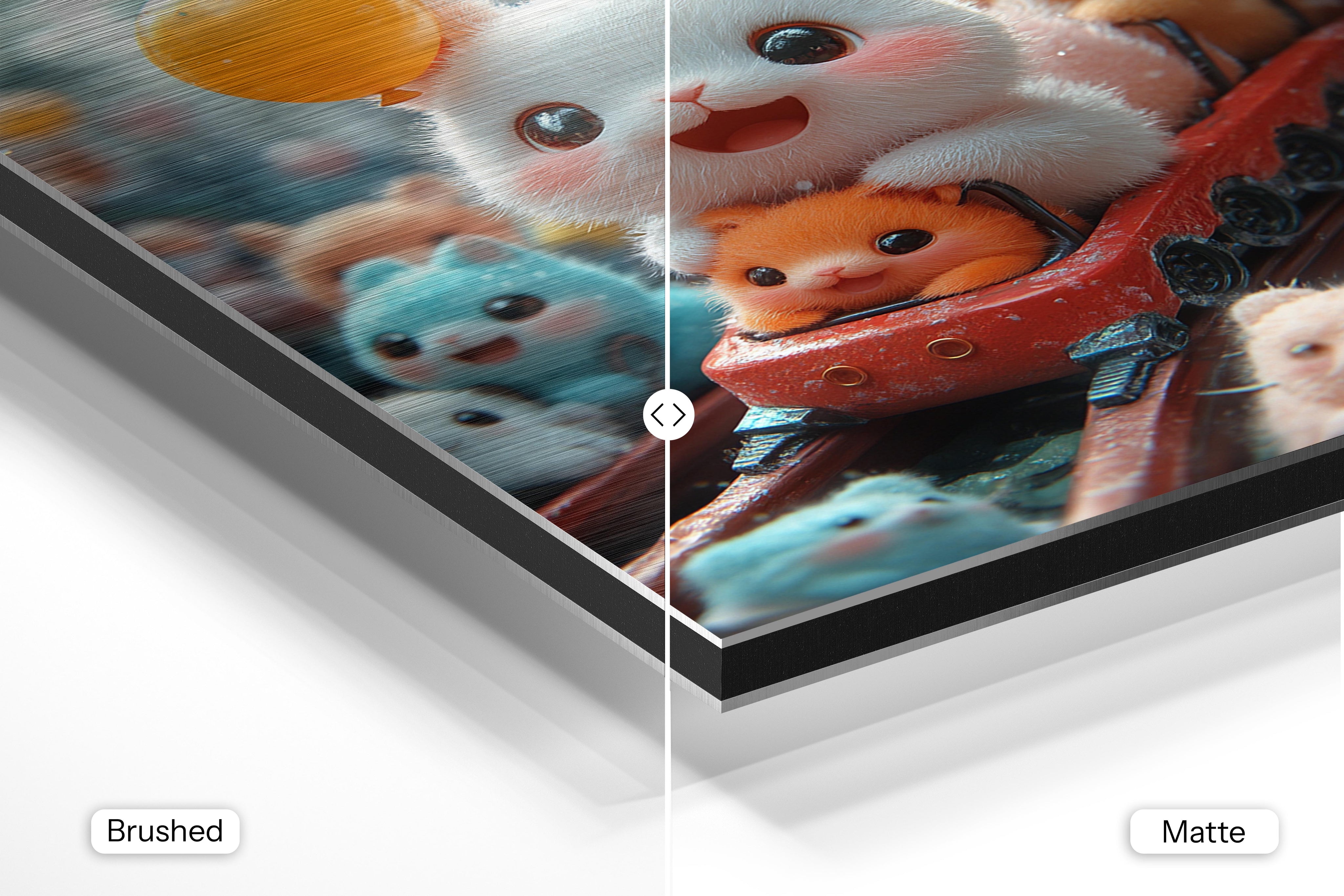 - Brushed Aluminum, on the other hand, features a raw metallic texture with visible brush strokes. Whites and highlights in your image let the silver surface show through, adding a dramatic, shimmering effect. Ideal for black-and-white images, minimalist designs, or abstract art, it creates a bold, industrial vibe with a modern edge.