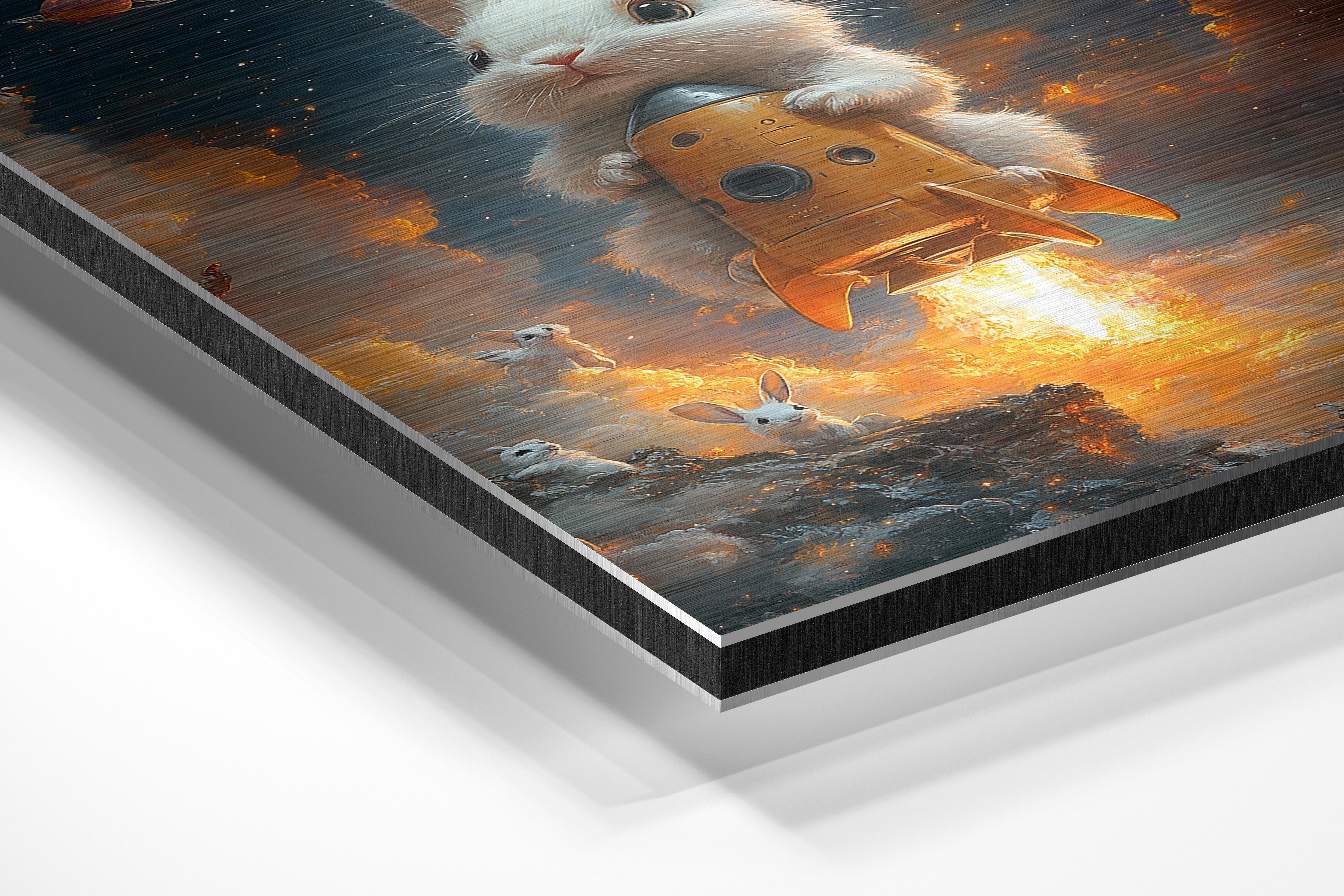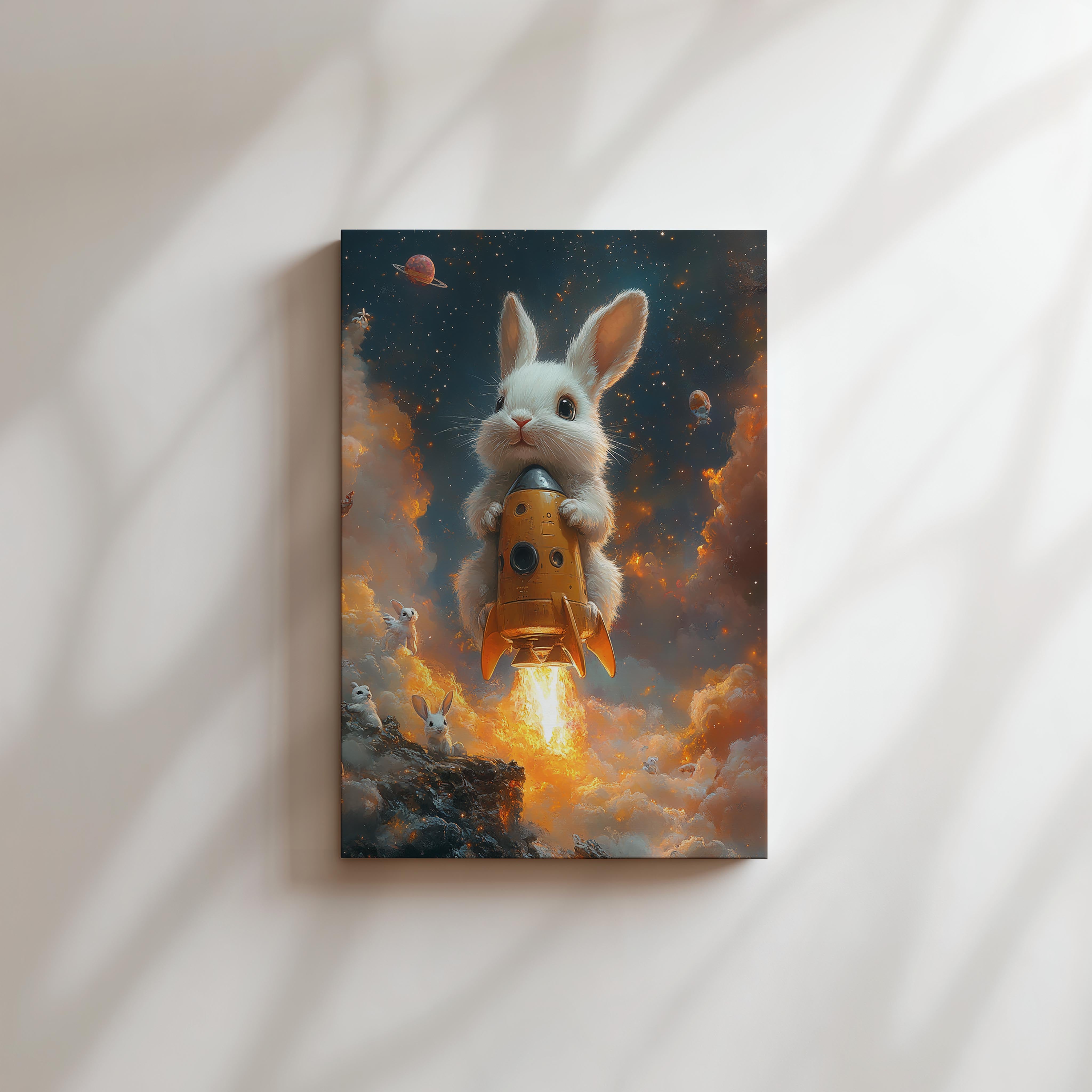 This whimsical artwork depicts an adorable white bunny riding a rocket as it ascends through a sky filled with stars and planets. The warm orange glow of the rocket contrasts beautifully with the cool blues of space, creating a dynamic and captivating composition. The scene exudes a sense of wonder and exploration, making it perfect for inspiring creativity in a child’s room or adding a touch of charm to a whimsical-themed space. With its soft yet vibrant tones and imaginative concept, this piece will delight both children and adults who appreciate fantasy art.