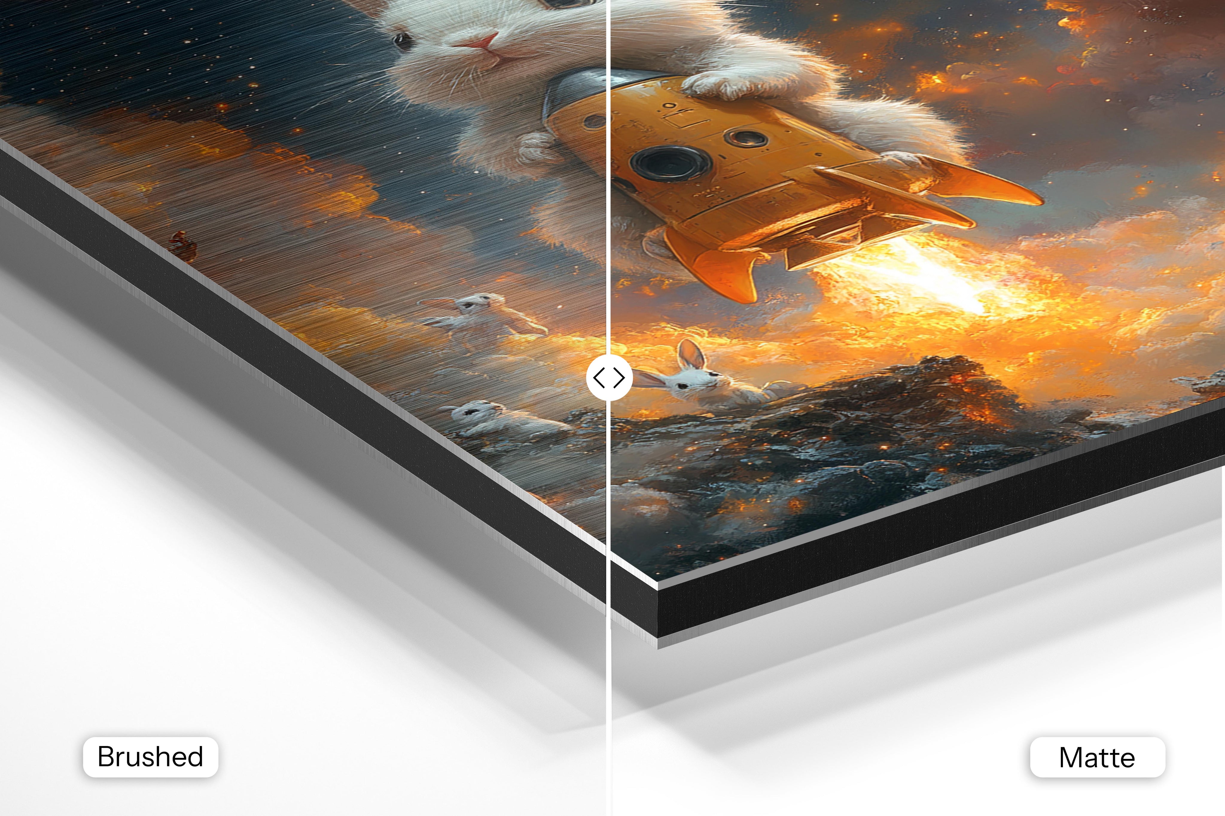 - Brushed Aluminum, on the other hand, features a raw metallic texture with visible brush strokes. Whites and highlights in your image let the silver surface show through, adding a dramatic, shimmering effect. Ideal for black-and-white images, minimalist designs, or abstract art, it creates a bold, industrial vibe with a modern edge.