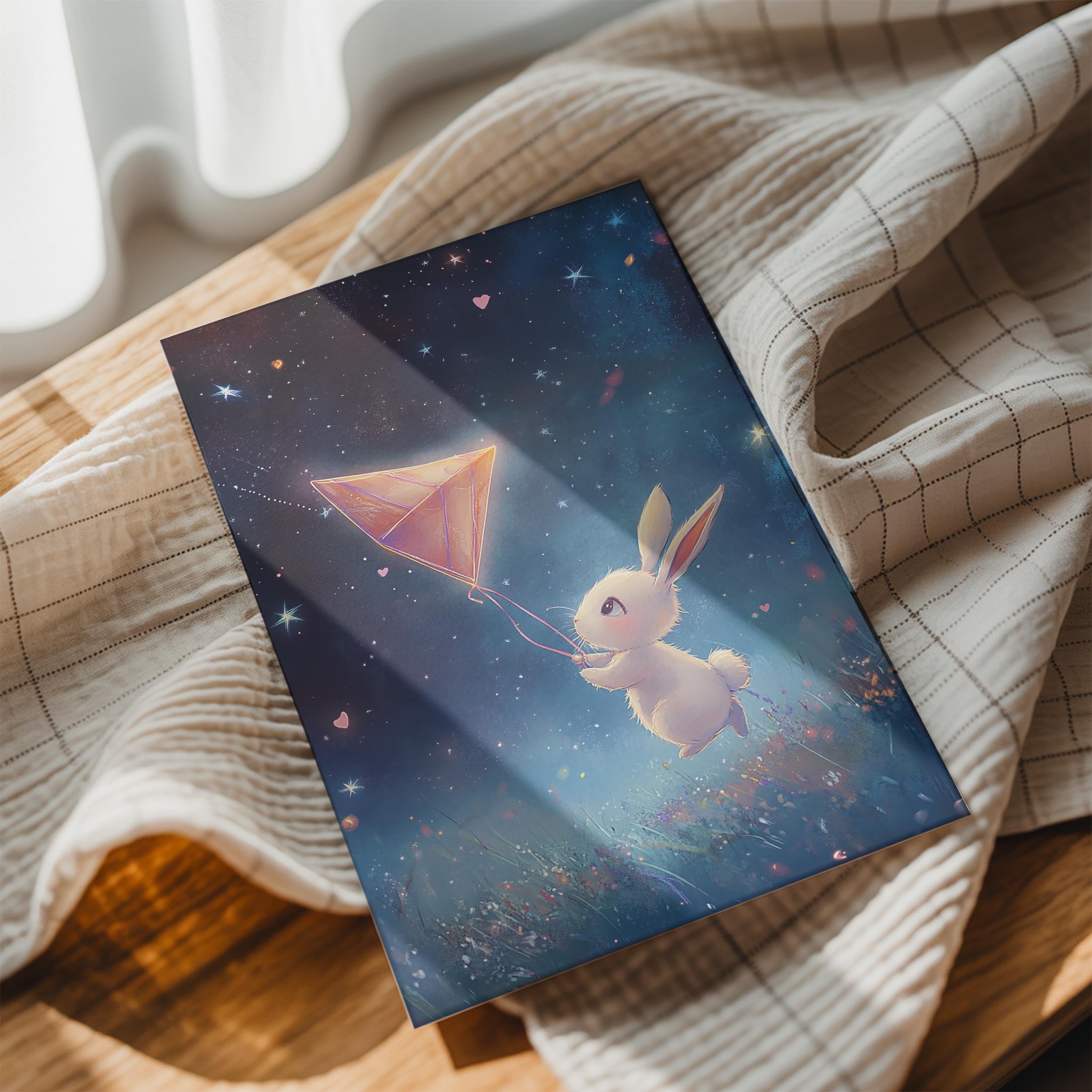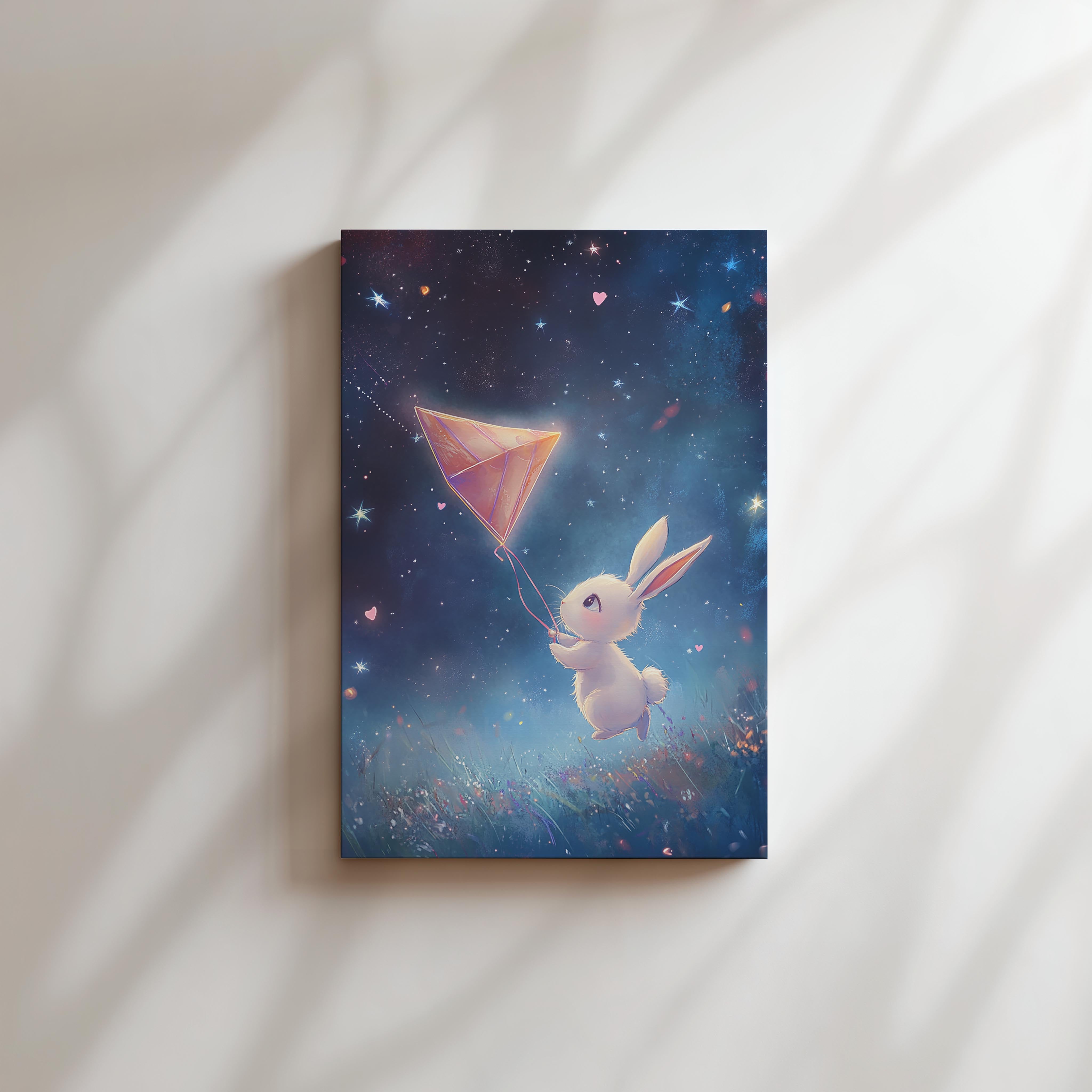 Set against a backdrop of a starlit sky, this enchanting illustration features a bunny holding a glowing kite. The twinkling stars and delicate hearts create a magical and romantic atmosphere. The bunny’s curious gaze and the ethereal glow of the kite make this piece a wonderful choice for bedrooms or spaces that inspire wonder and imagination. It’s a celebration of dreams and possibilities.