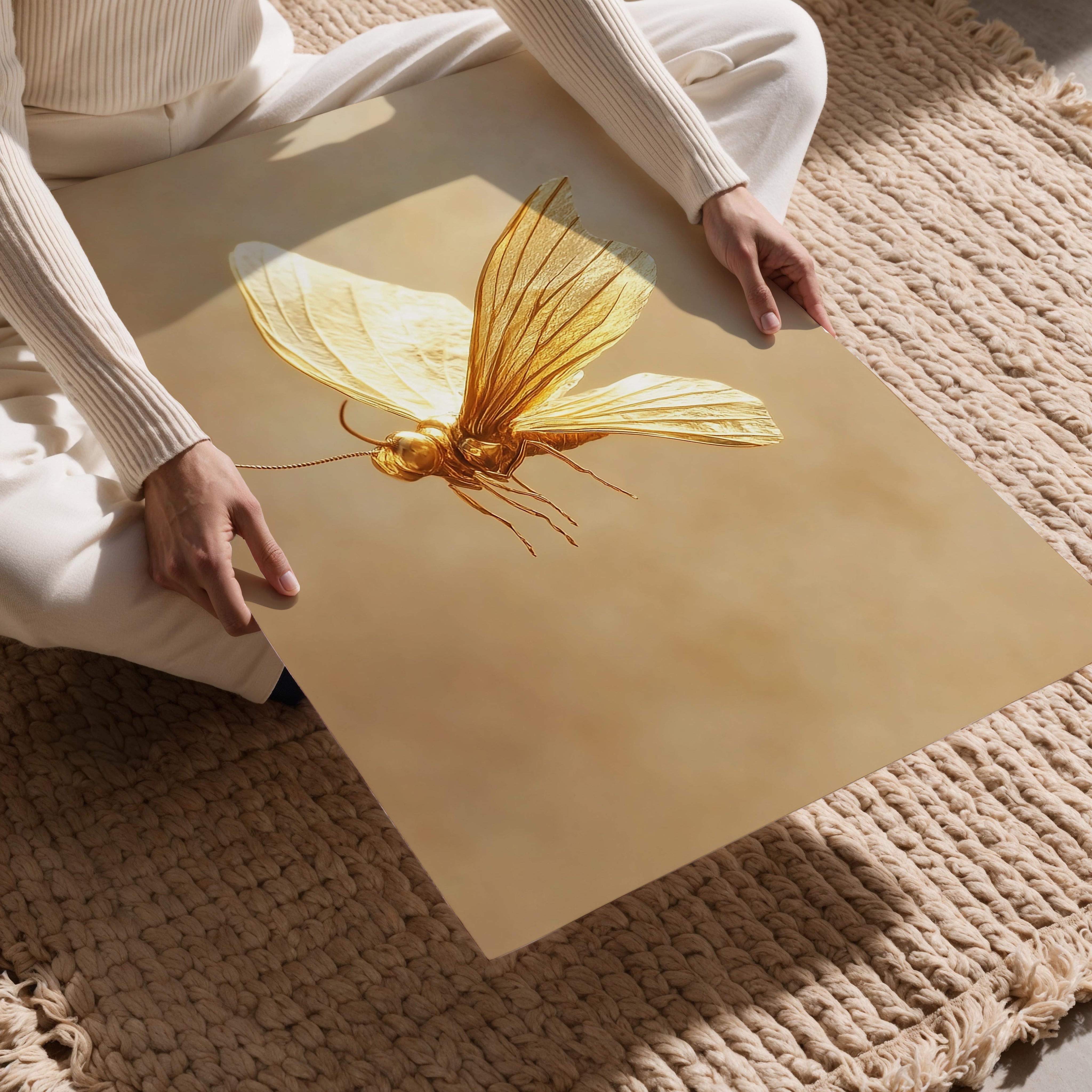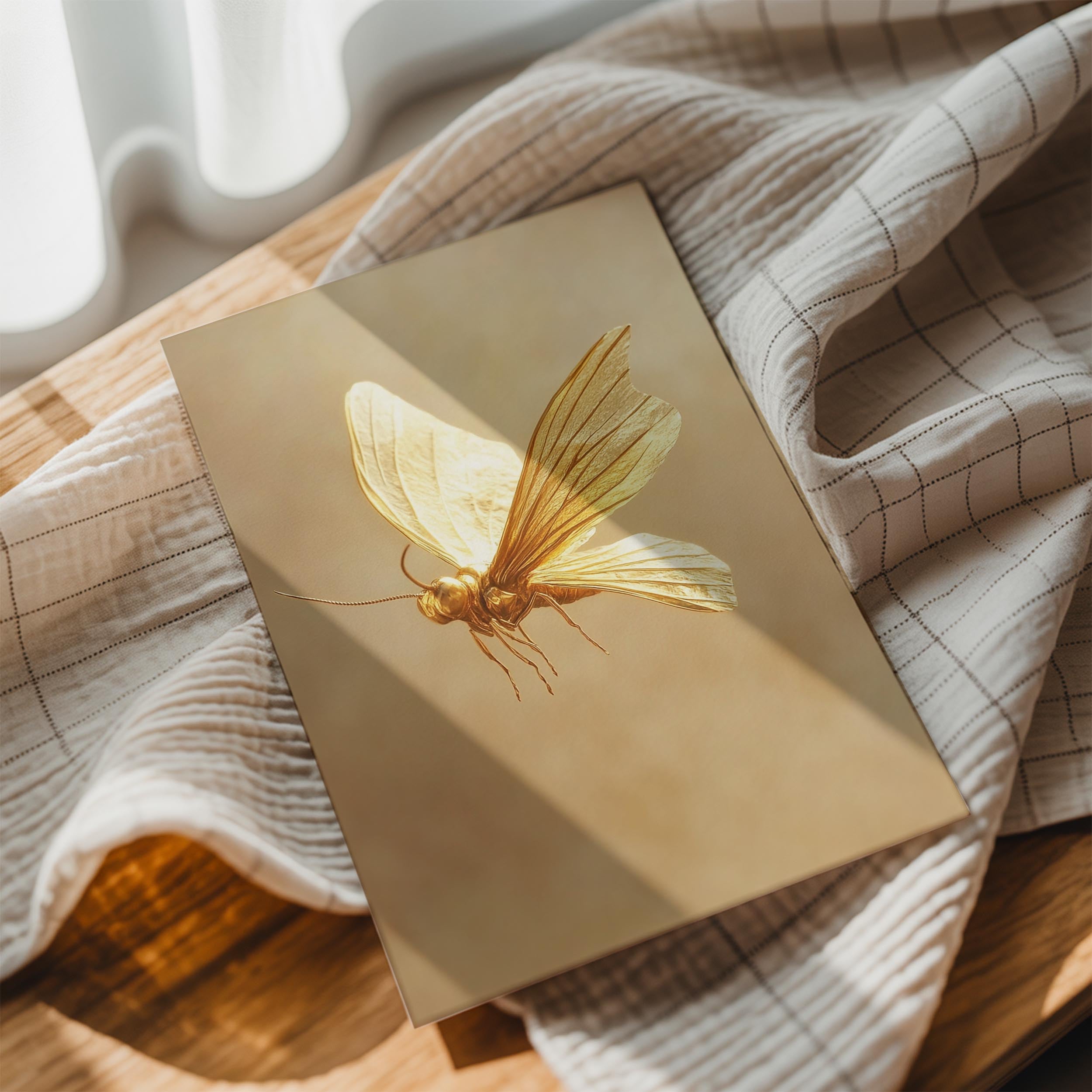 An intricate golden butterfly glowing against a soft, neutral background. Its fine wing details and radiant light create an ethereal and magical presence. This image symbolizes transformation and beauty, making it perfect for personal spaces, artistic interiors, or wellness environments. The butterfly’s luminous quality exudes positivity and charm, creating a calming and uplifting atmosphere.