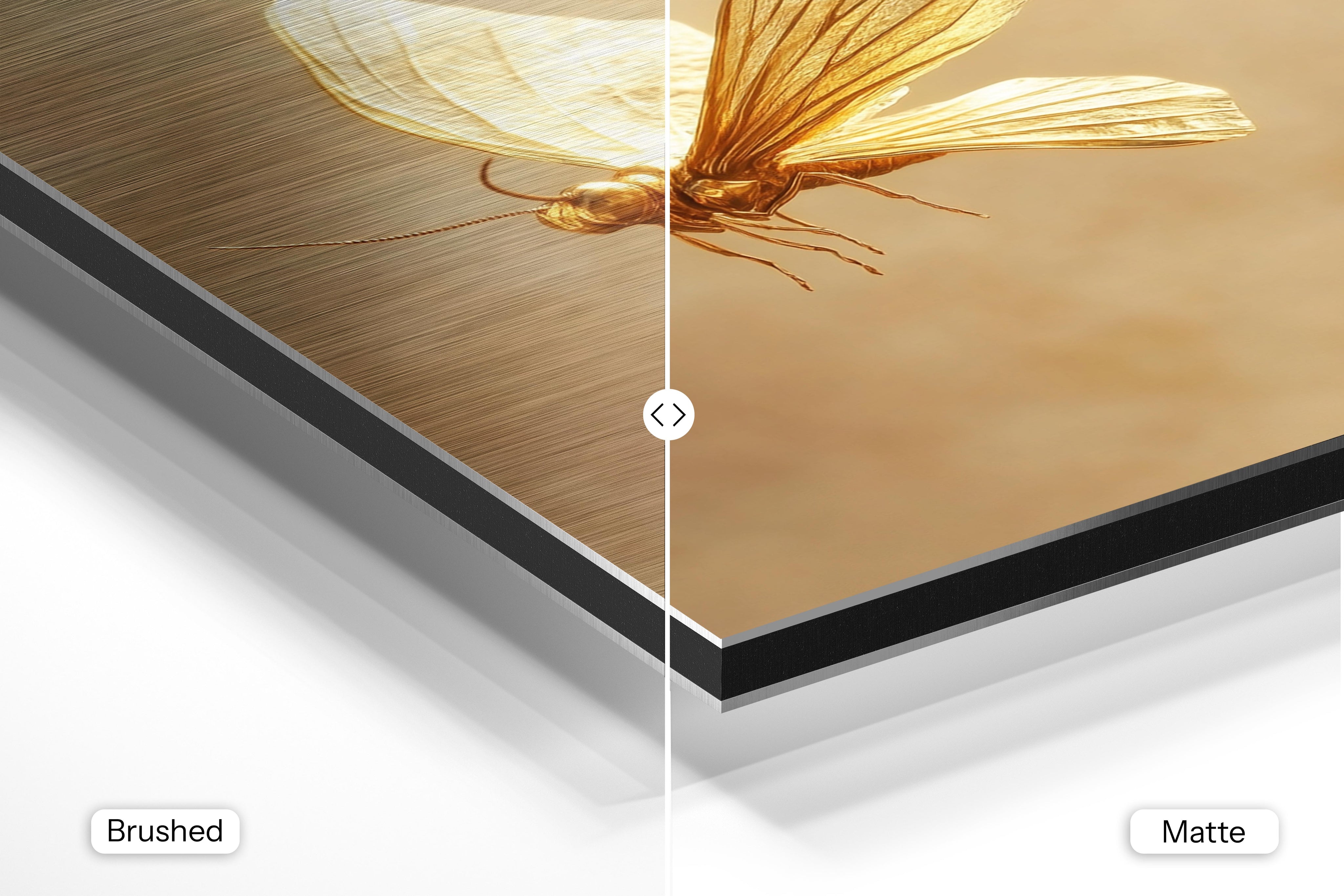 - Brushed Aluminum, on the other hand, features a raw metallic texture with visible brush strokes. Whites and highlights in your image let the silver surface show through, adding a dramatic, shimmering effect. Ideal for black-and-white images, minimalist designs, or abstract art, it creates a bold, industrial vibe with a modern edge.