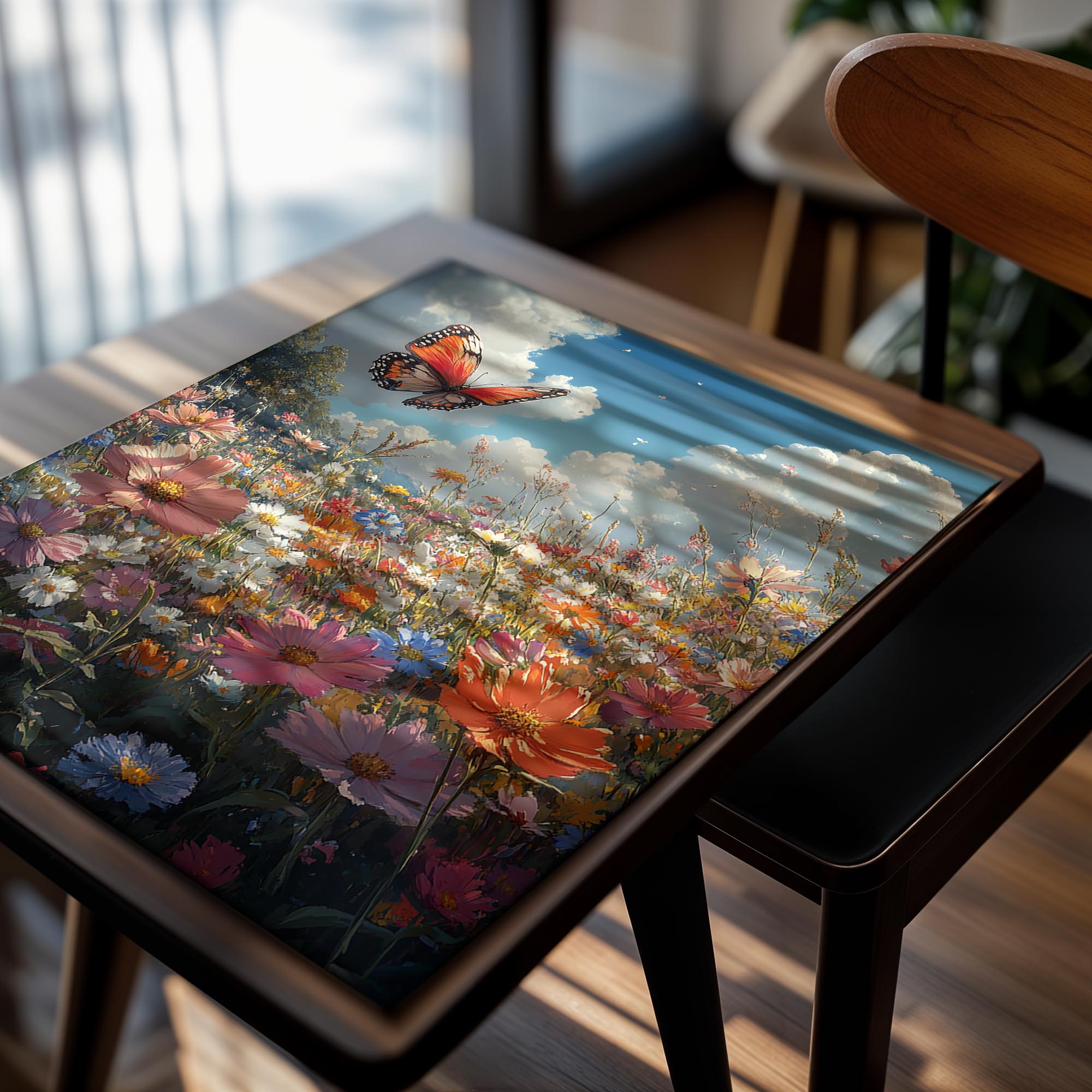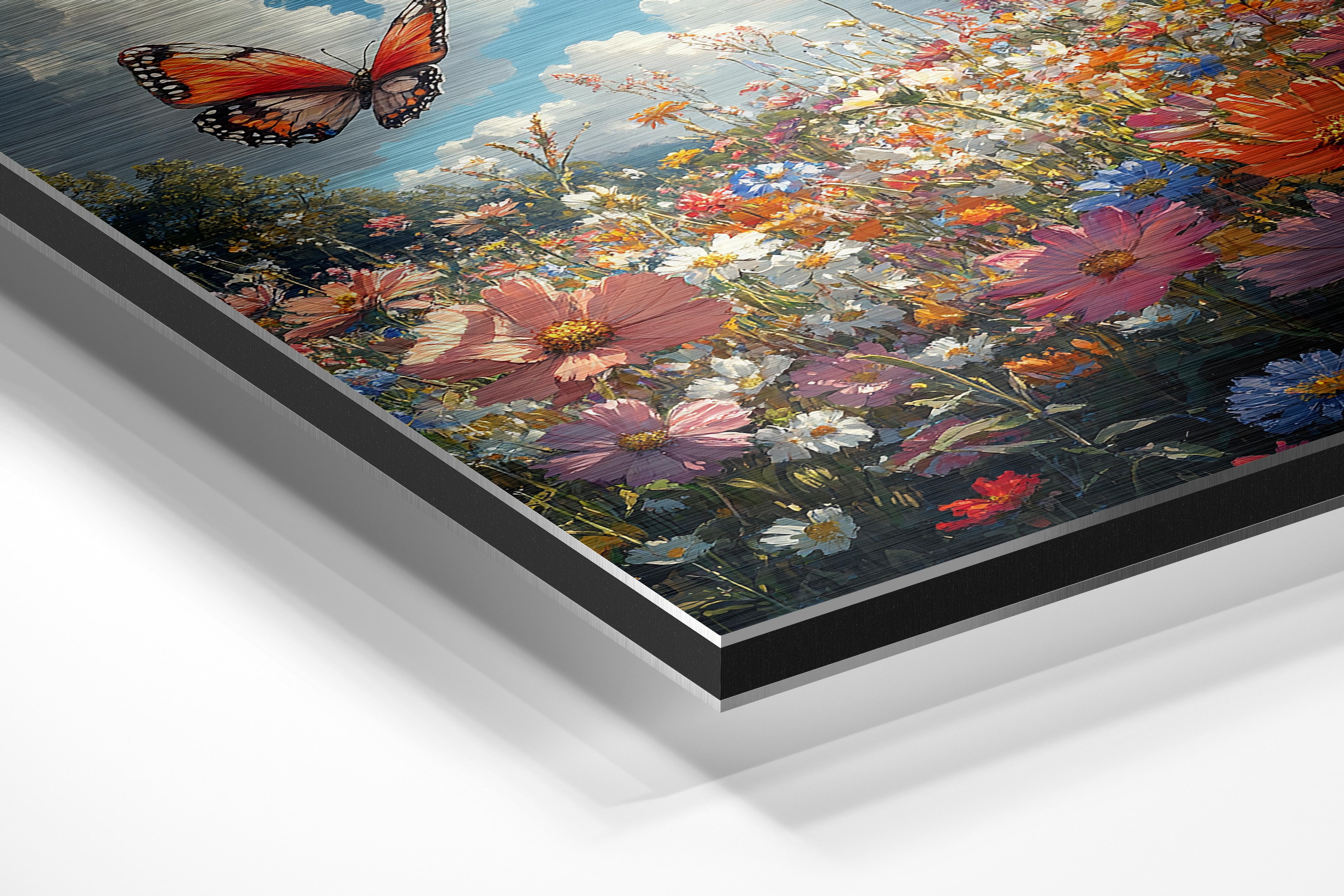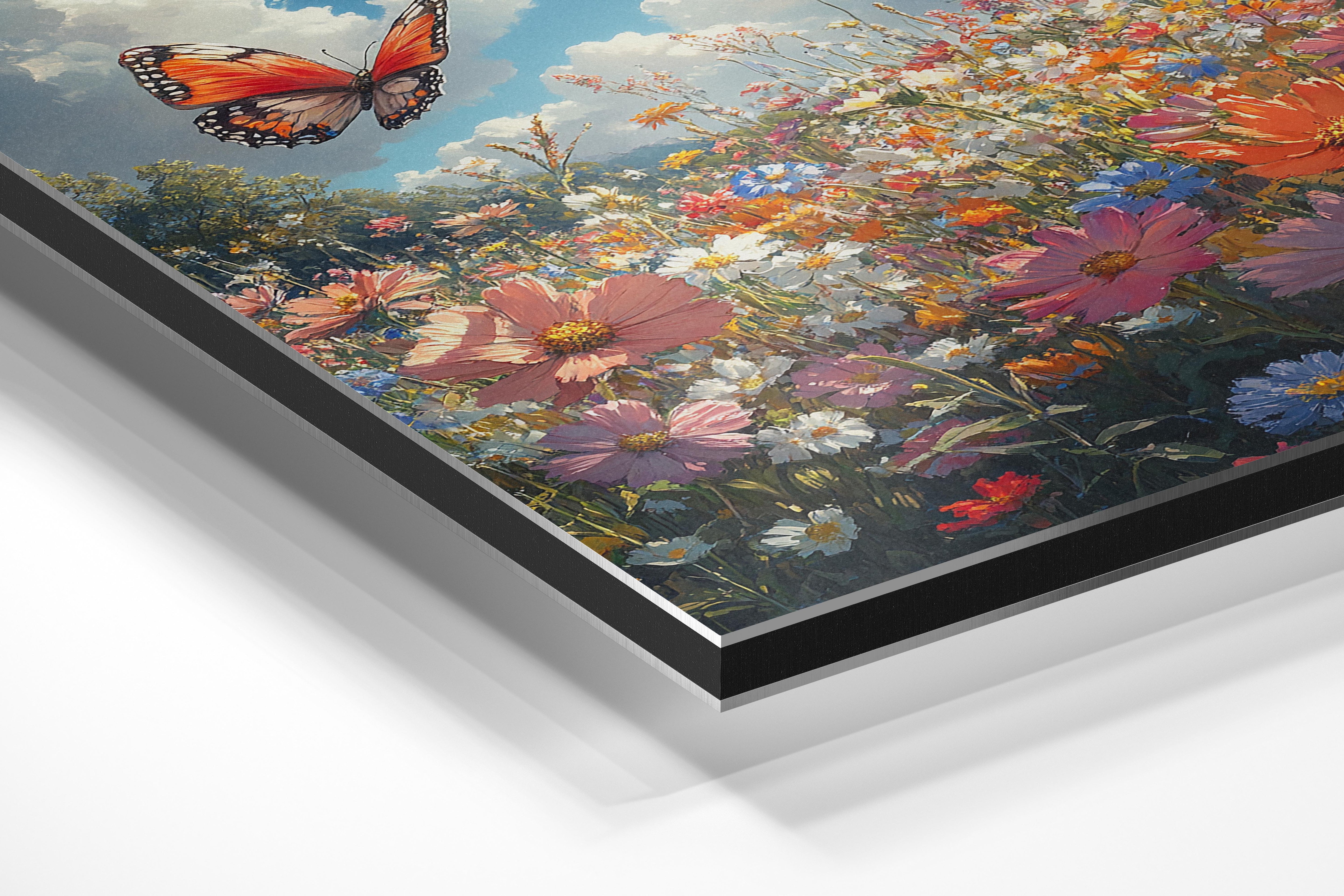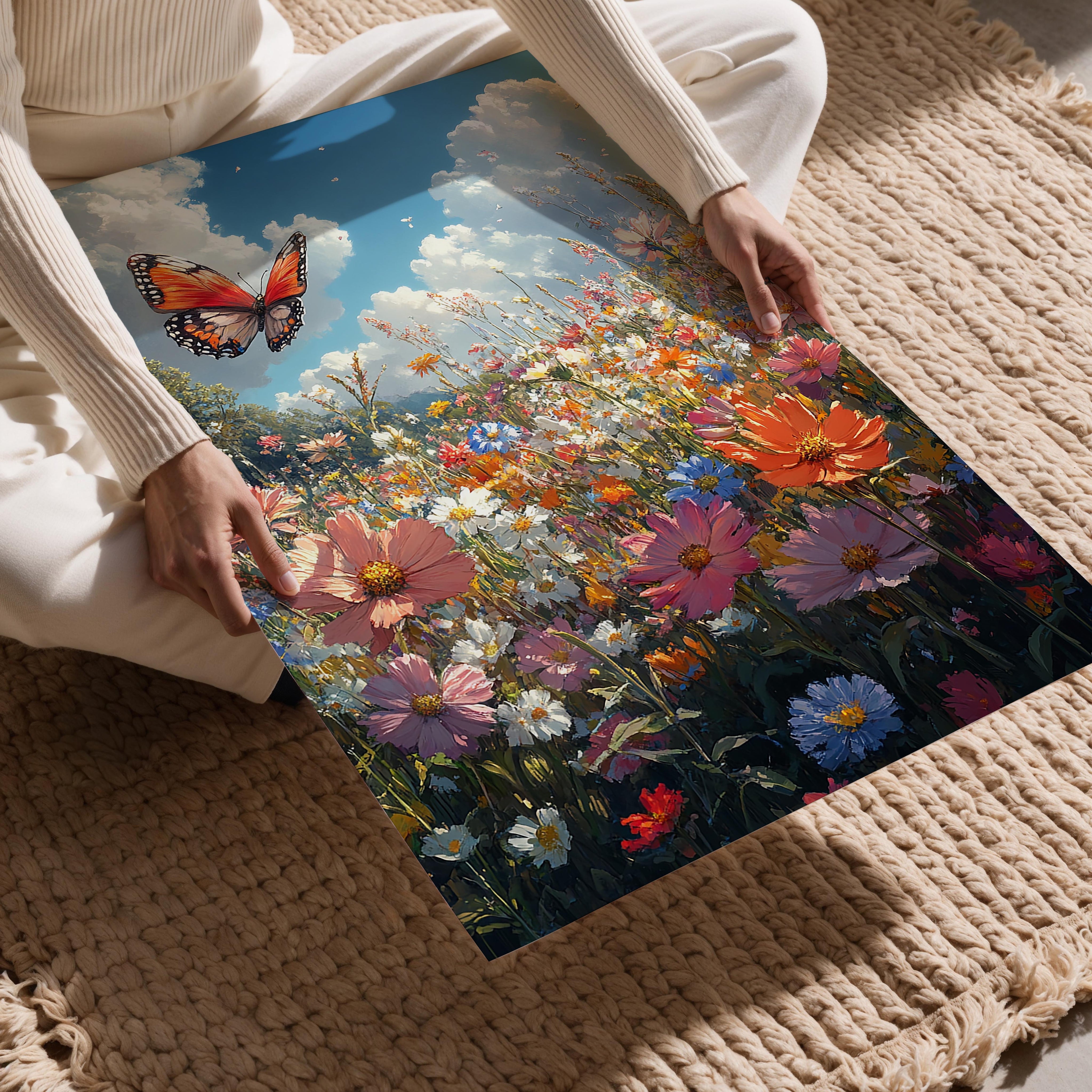 A lively meadow bursting with blossoms and butterflies under a bright blue sky. This enchanting scene evokes the charm and vitality of spring, celebrating the renewal of life and the intricate beauty of wildflowers and pollinators.