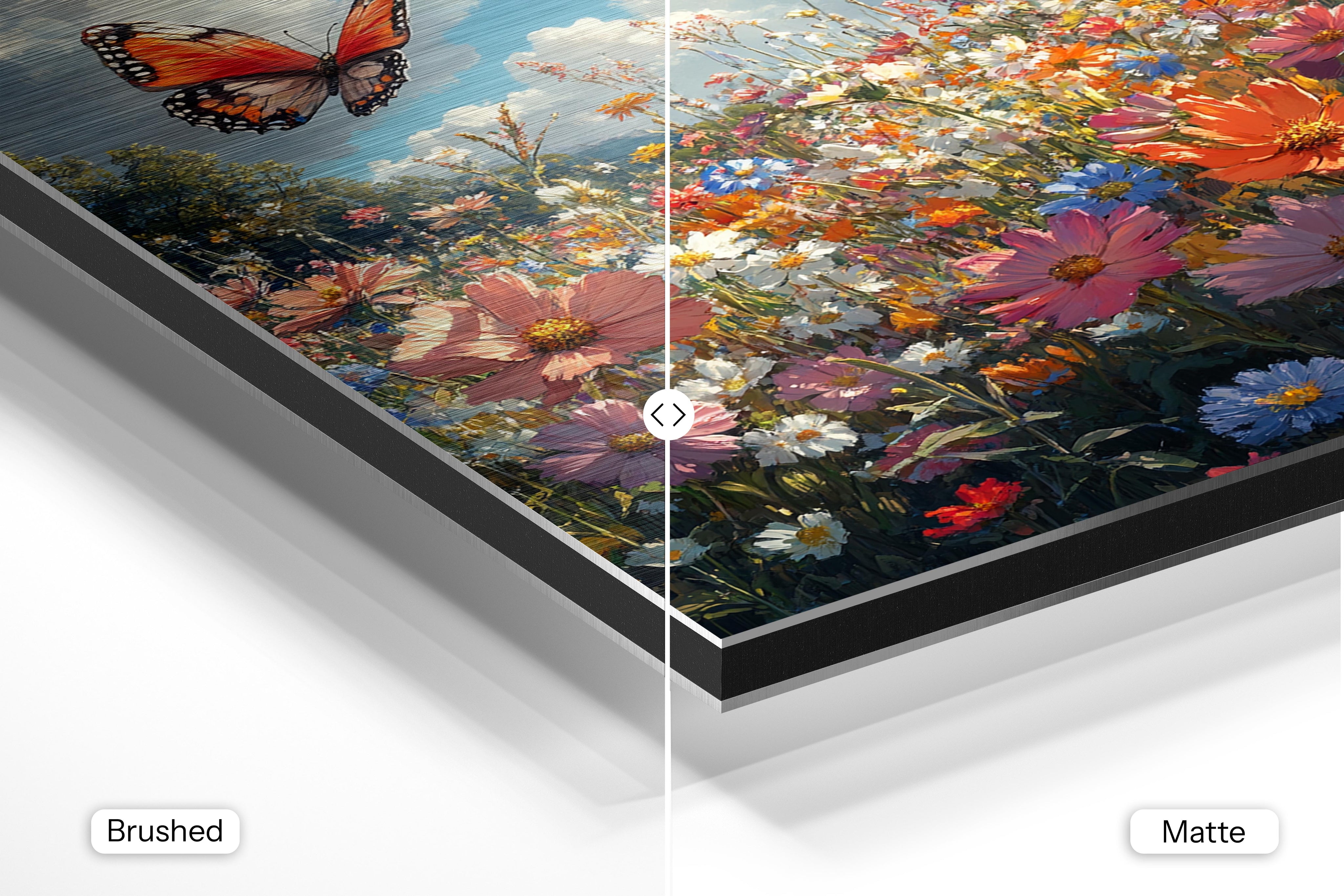 - Matte Aluminum offers a smooth, bright white surface that delivers crisp details and vibrant, true-to-life colors. With its non-reflective finish and subtle silky sheen, it’s perfect for photography, portraits, and colorful artwork—bringing a clean, polished look to any interior.