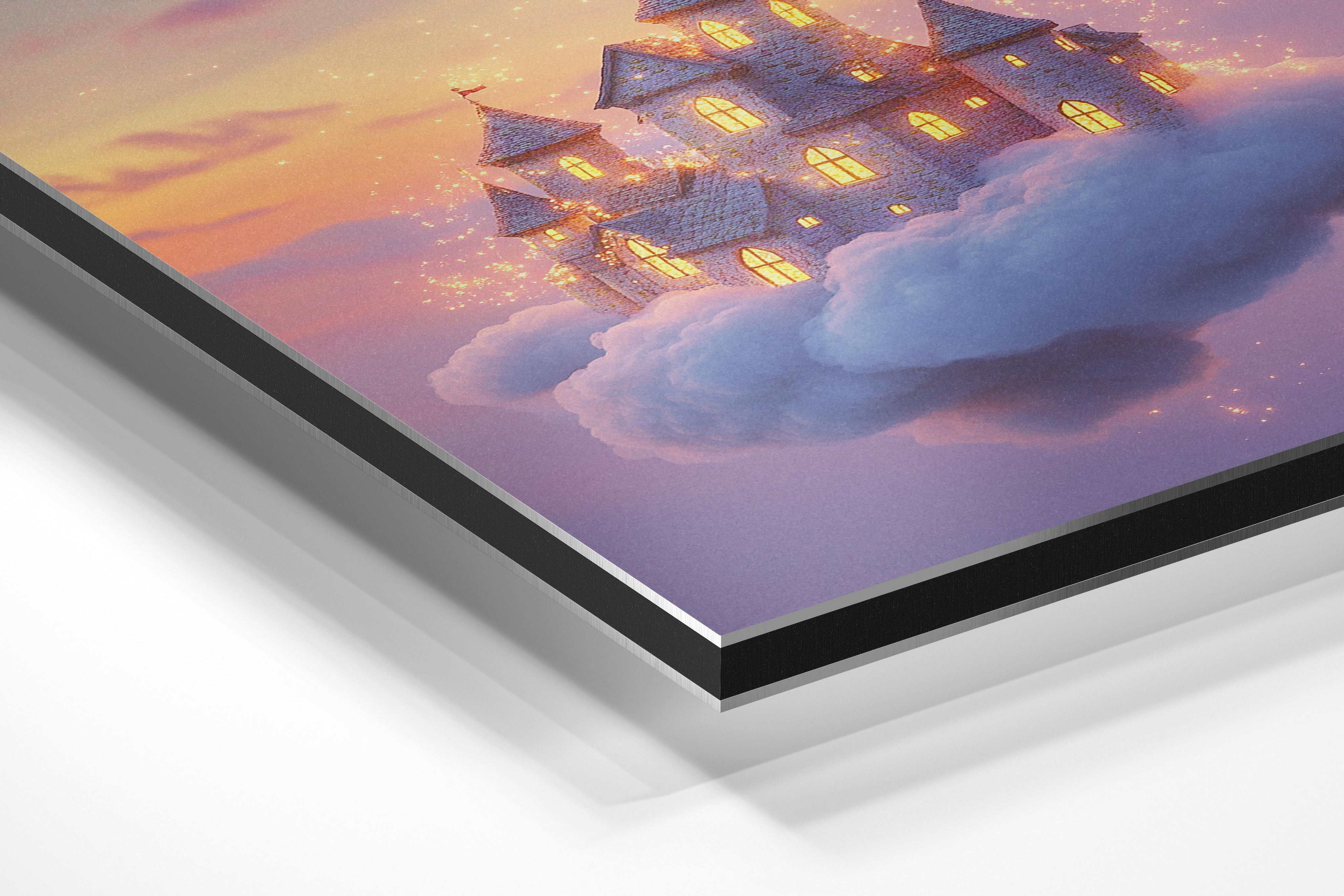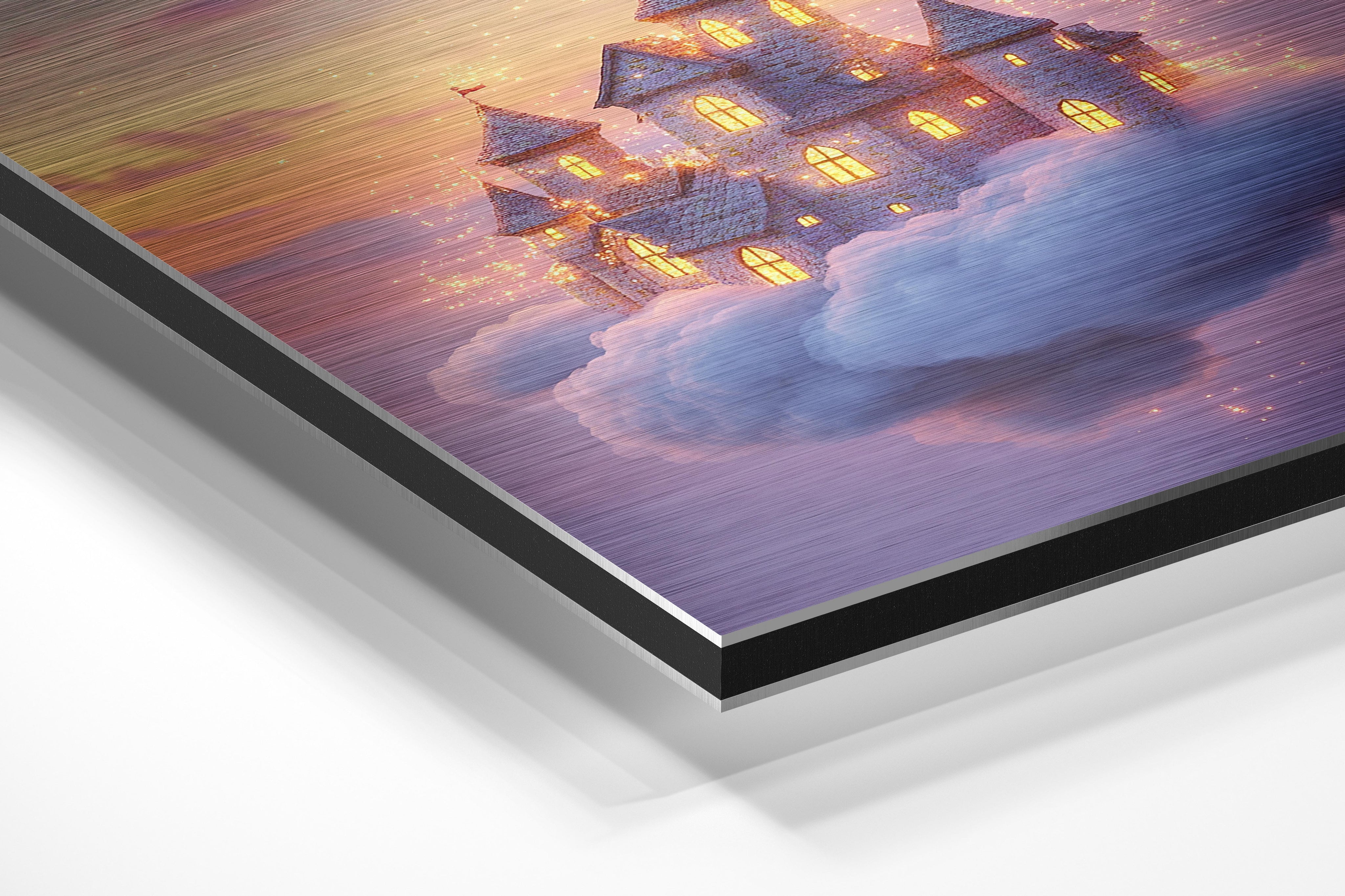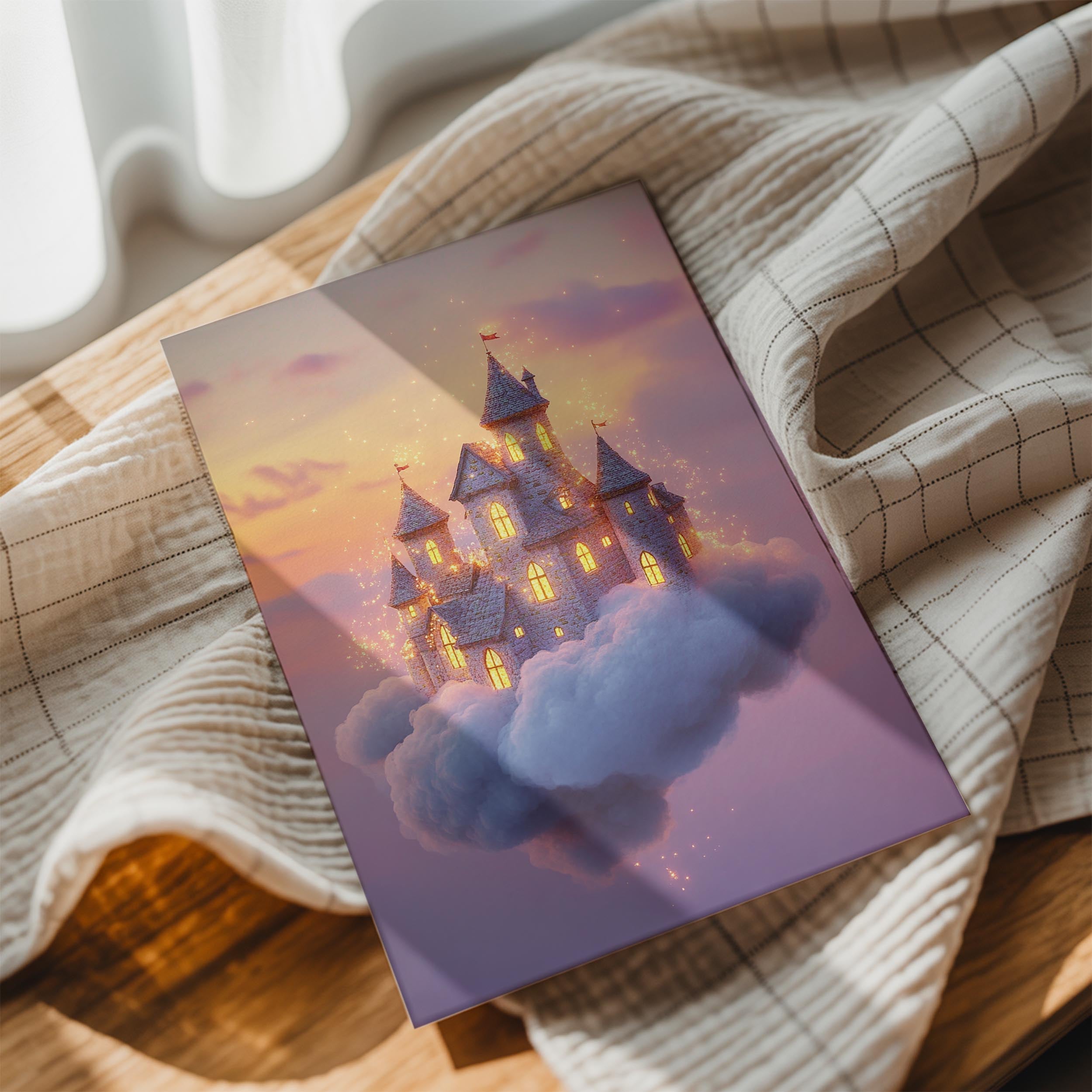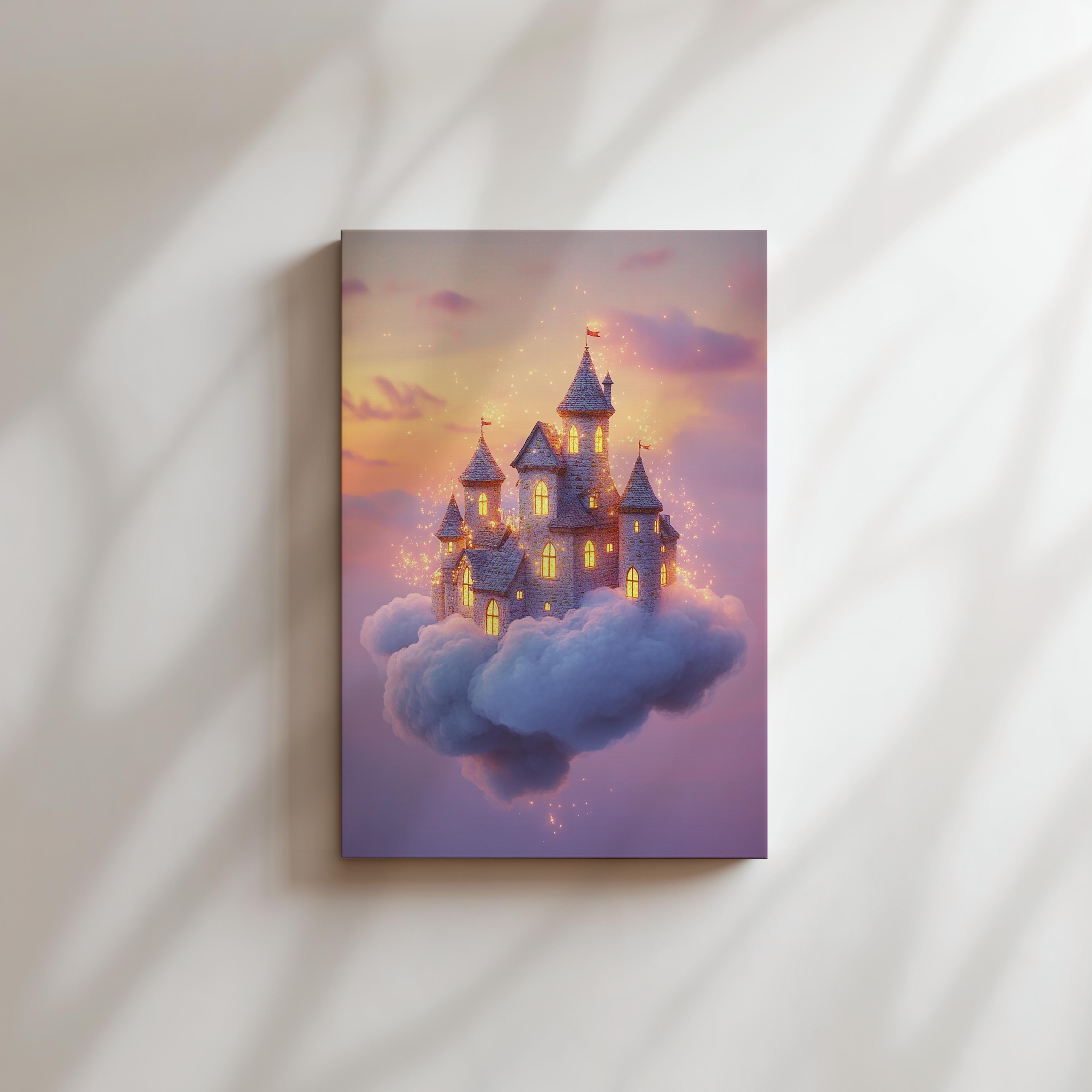 This breathtaking artwork features a glowing castle floating among the clouds, surrounded by a golden-hued sky. Sparkling lights enhance its magical appearance, creating a fairytale-like quality. The serene yet awe-inspiring composition makes it perfect for nurseries, playrooms, or any area looking to evoke a sense of wonder and adventure. Its soft, warm tones ensure a calming presence while inspiring creativity and dreams.