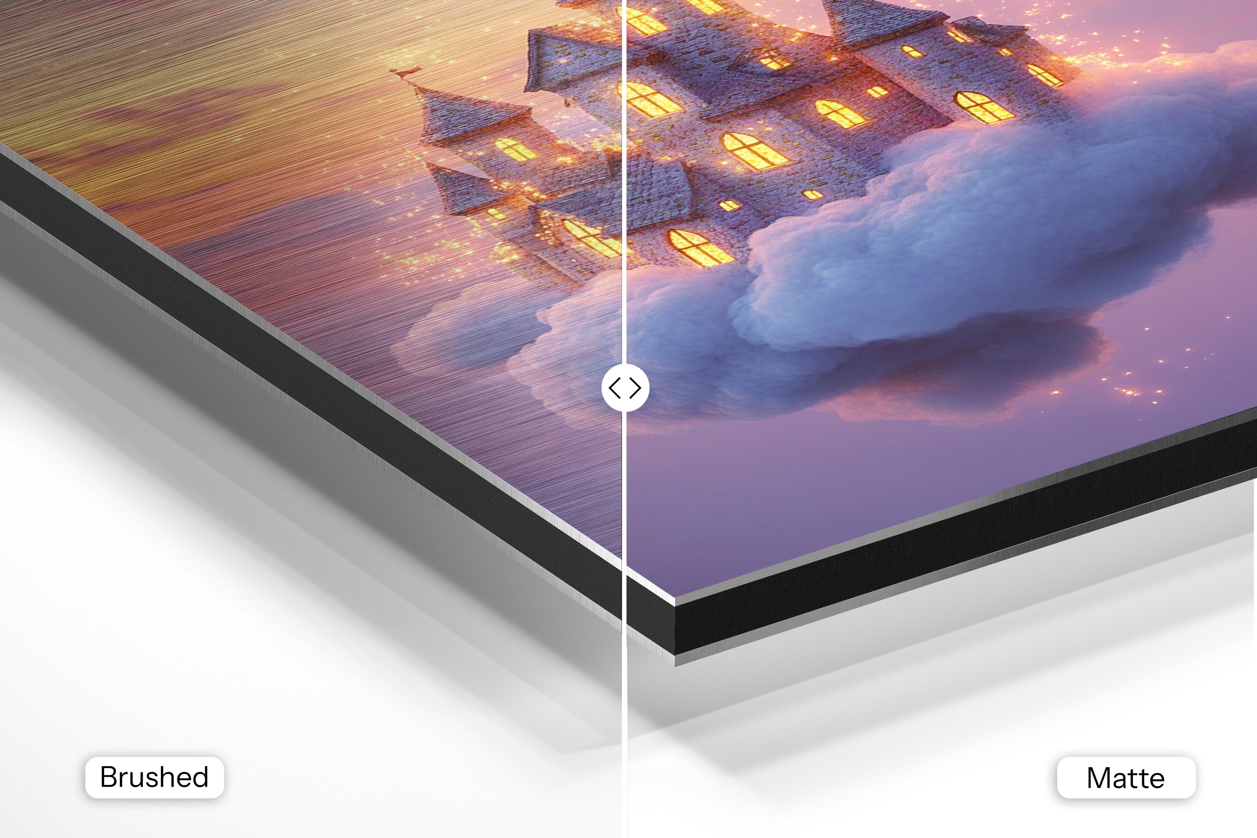 - Brushed Aluminum, on the other hand, features a raw metallic texture with visible brush strokes. Whites and highlights in your image let the silver surface show through, adding a dramatic, shimmering effect. Ideal for black-and-white images, minimalist designs, or abstract art, it creates a bold, industrial vibe with a modern edge.