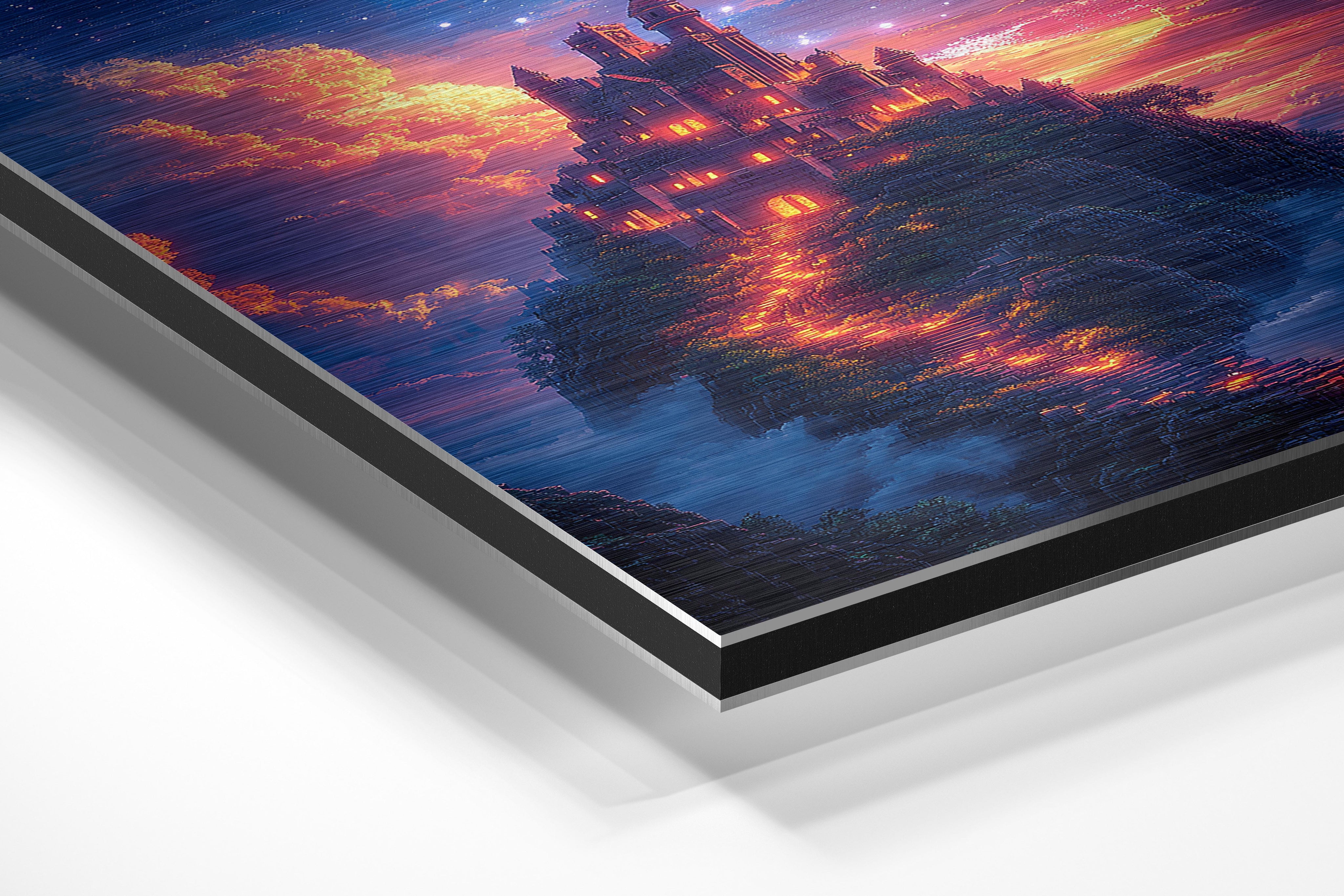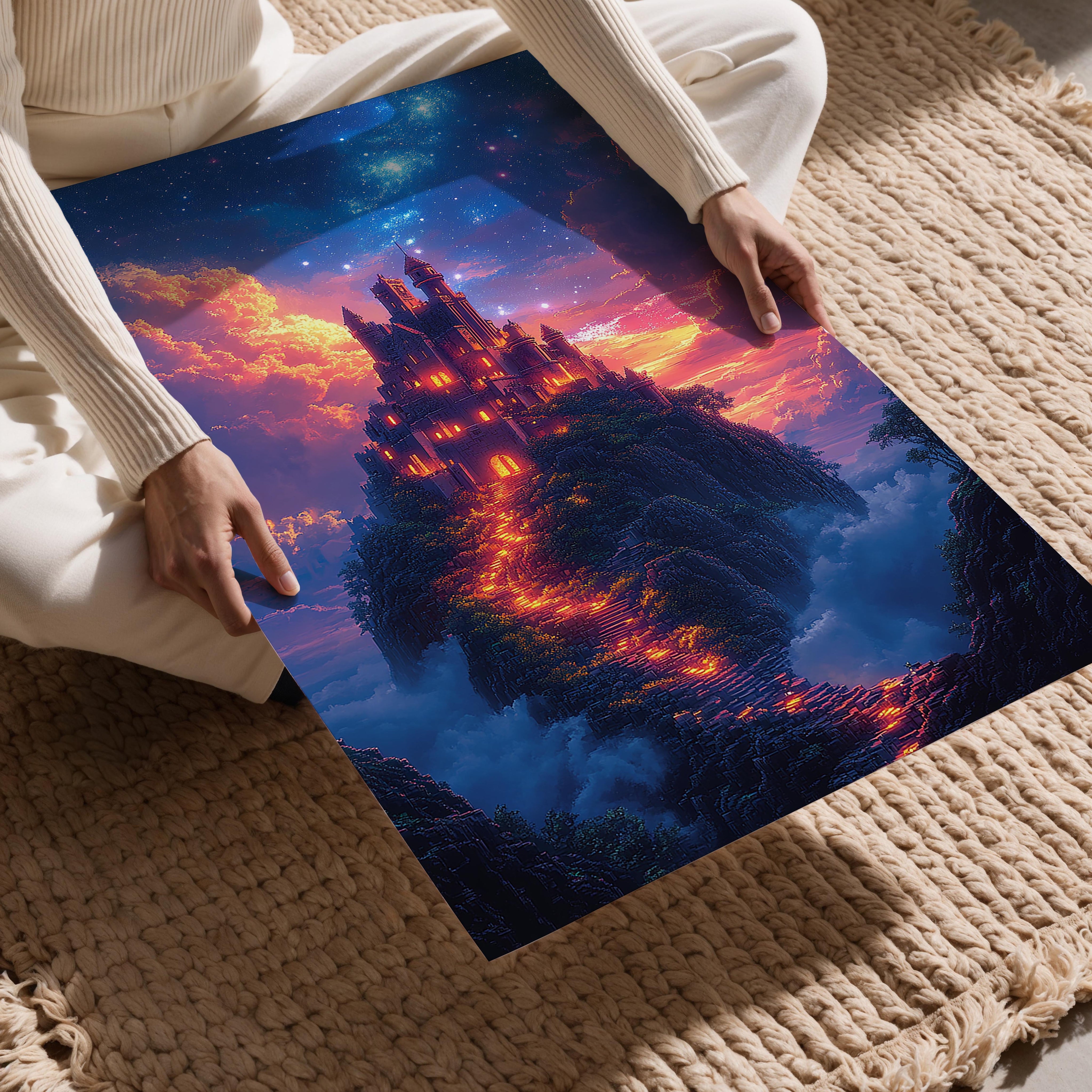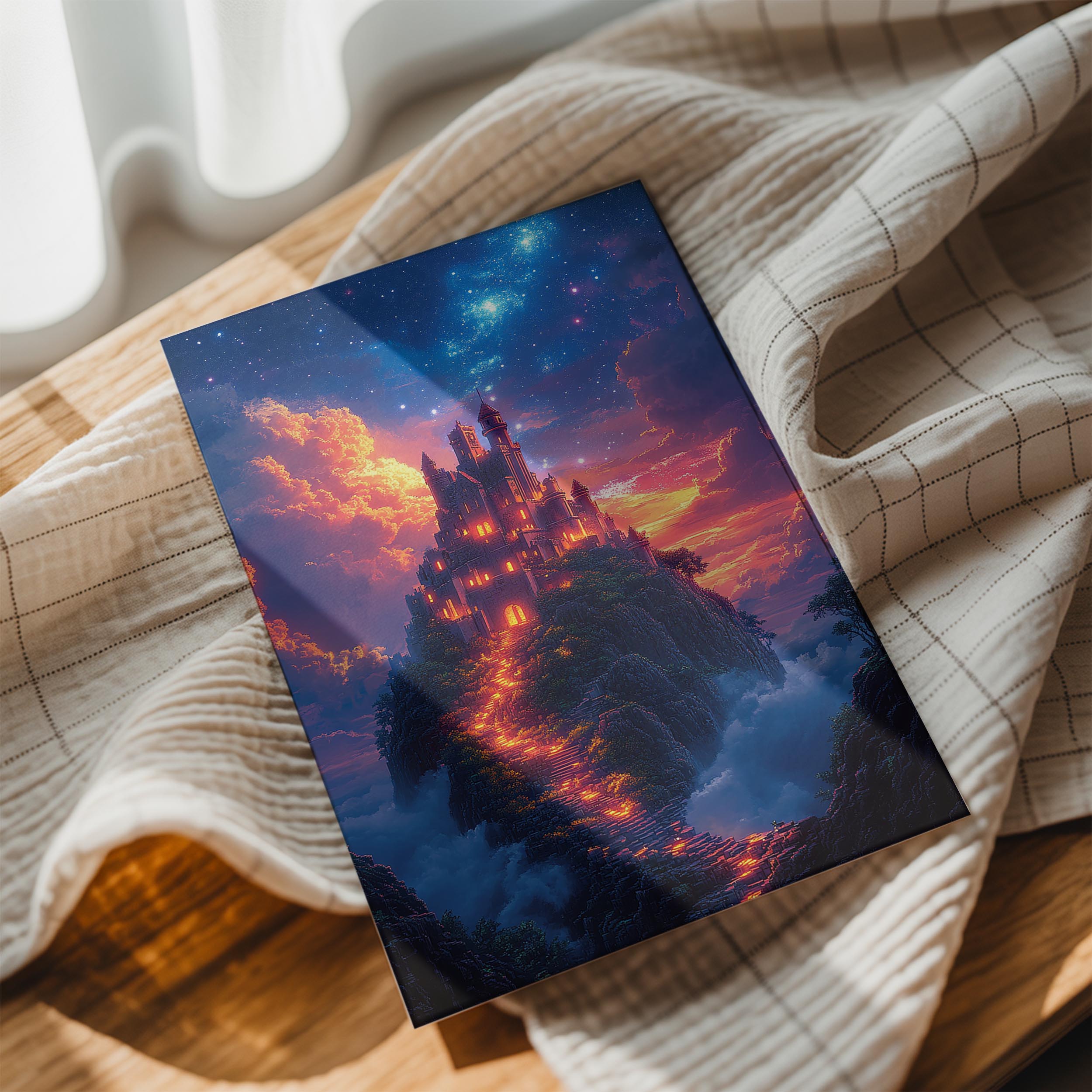 A magical castle sits atop a rocky peak, its glowing windows and stairway leading up to the stars. The vibrant colors of the sunset and the glimmering night sky create a dreamlike composition. Perfect for fantasy lovers, this artwork would make a striking centerpiece in creative spaces or bedrooms, inviting wonder and imagination.
