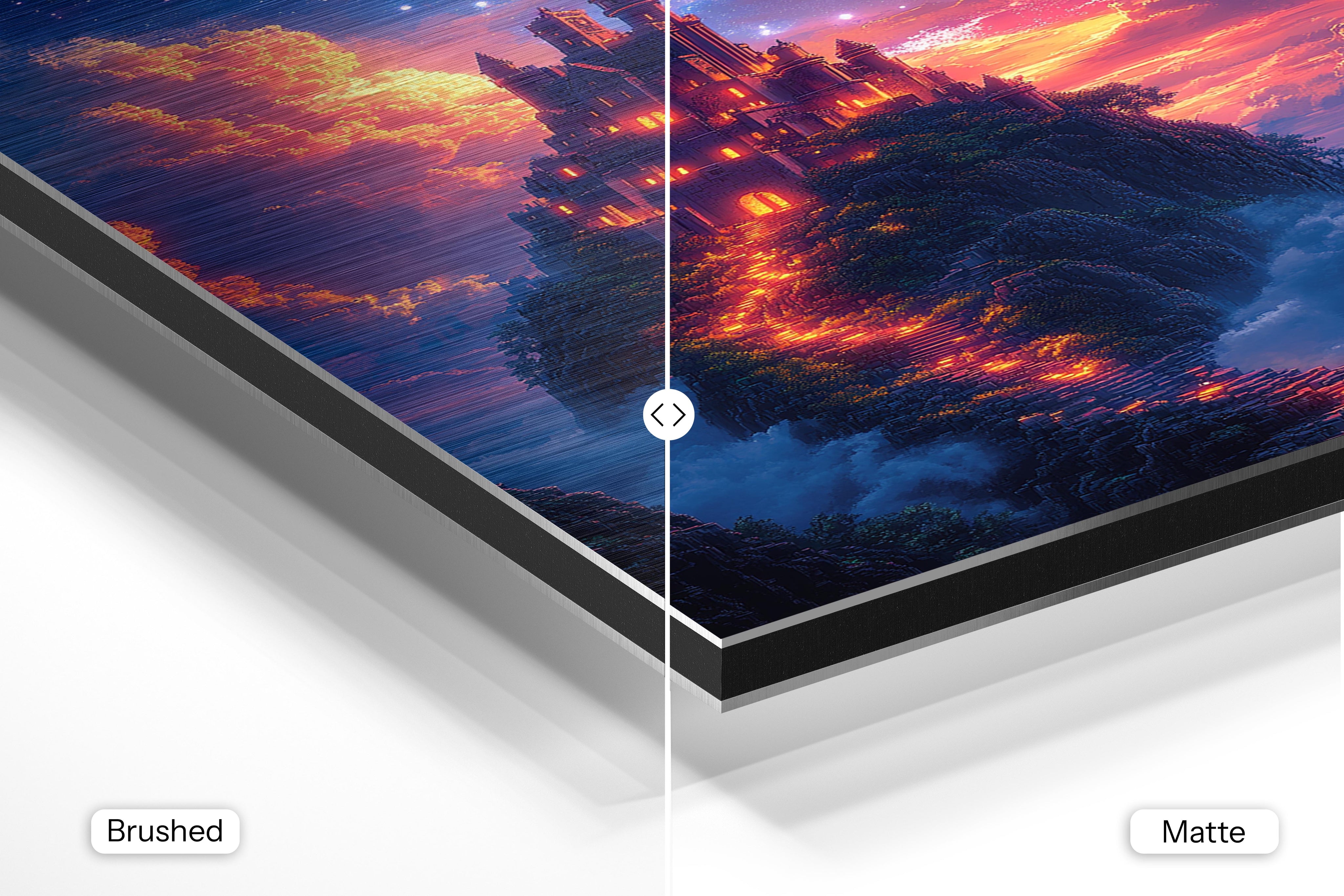- Brushed Aluminum, on the other hand, features a raw metallic texture with visible brush strokes. Whites and highlights in your image let the silver surface show through, adding a dramatic, shimmering effect. Ideal for black-and-white images, minimalist designs, or abstract art, it creates a bold, industrial vibe with a modern edge.