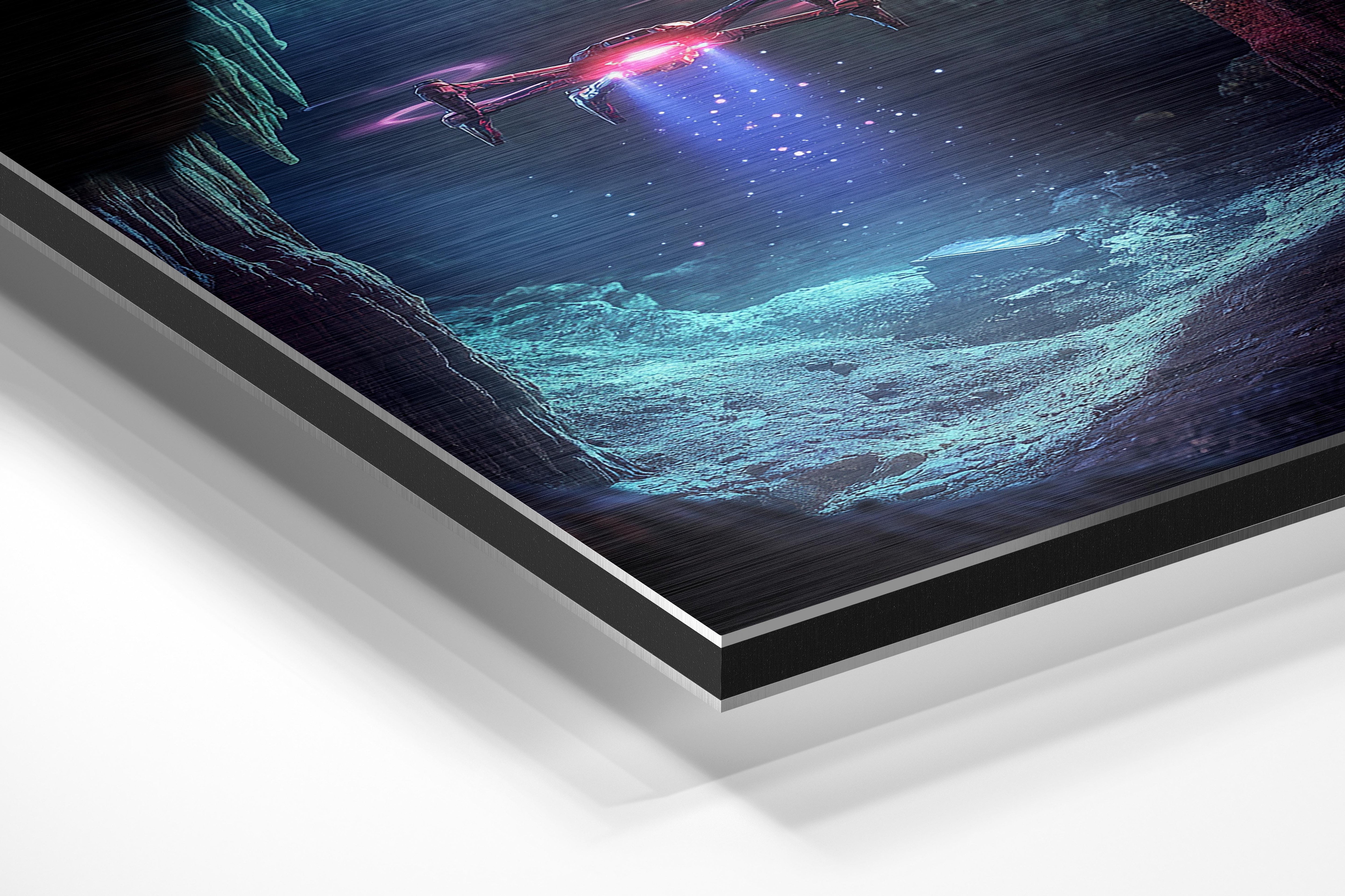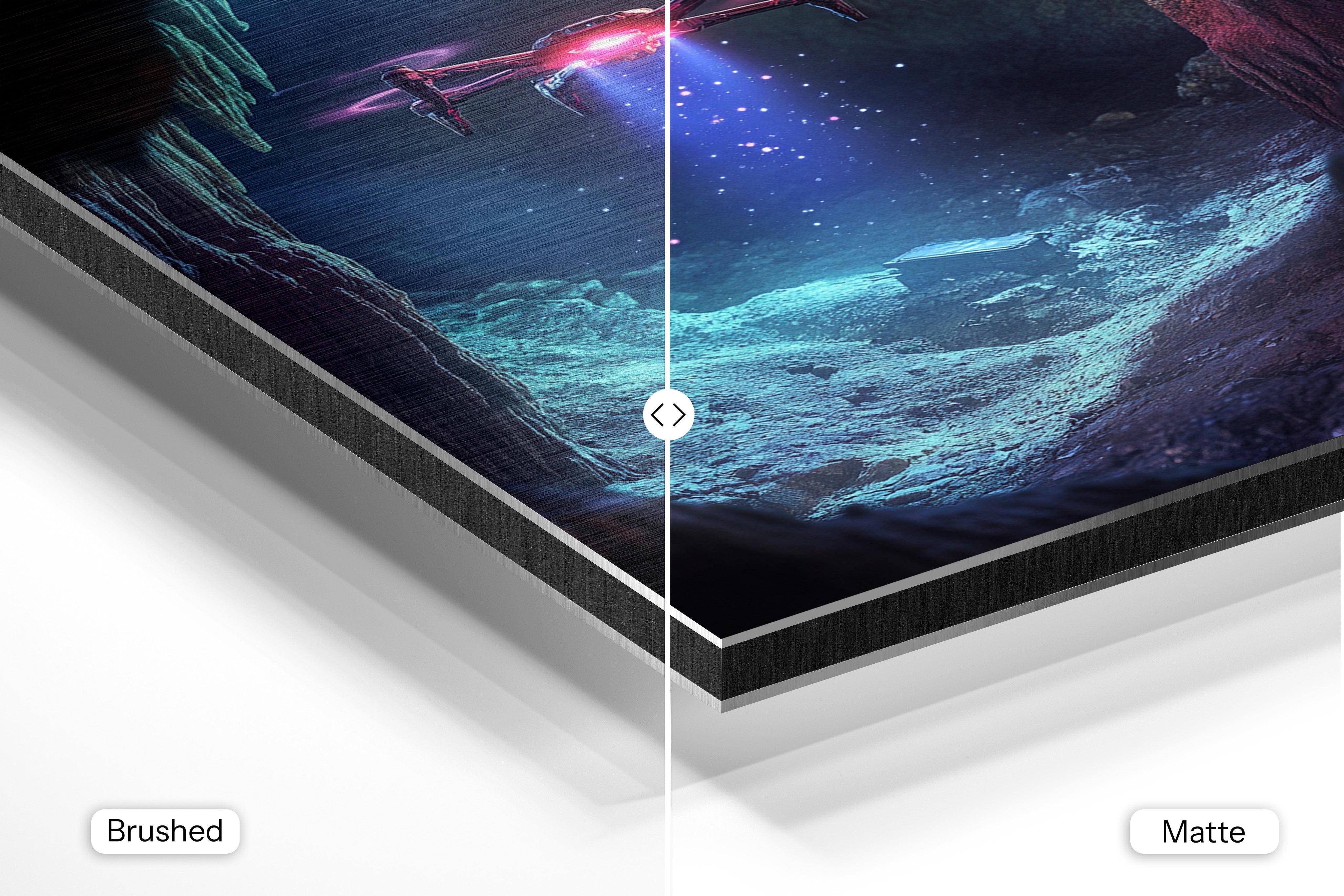 - Brushed Aluminum, on the other hand, features a raw metallic texture with visible brush strokes. Whites and highlights in your image let the silver surface show through, adding a dramatic, shimmering effect. Ideal for black-and-white images, minimalist designs, or abstract art, it creates a bold, industrial vibe with a modern edge.