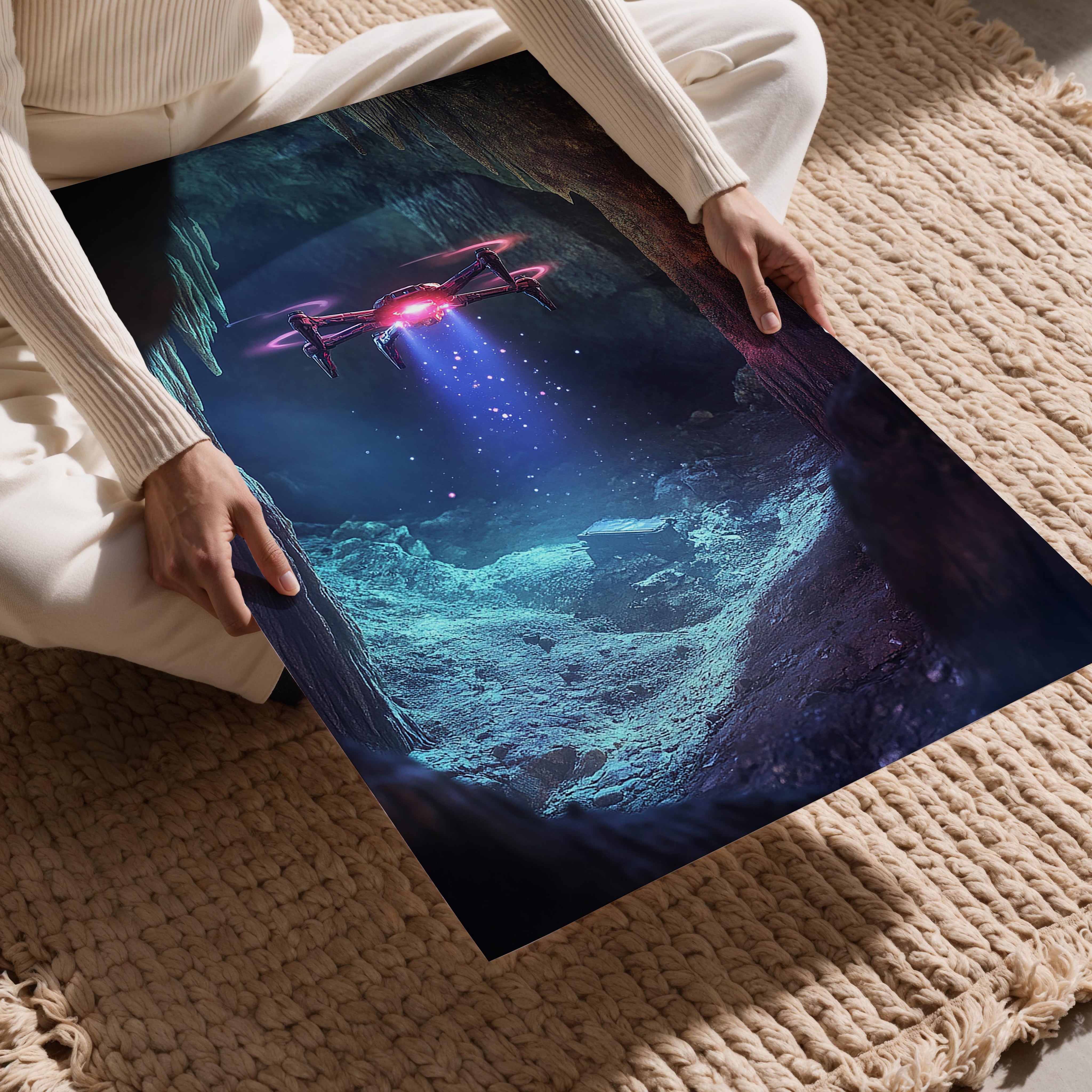 This artwork showcases a sleek drone emitting a vibrant pink and blue glow, navigating a mysterious cave. The interplay of light and shadow creates an ethereal and otherworldly atmosphere. Perfect for sci-fi themes, exploration stories, or futuristic concepts, this image invites viewers into a realm of discovery and innovation. Its vibrant colors and intricate details make it a standout visual for any creative project.