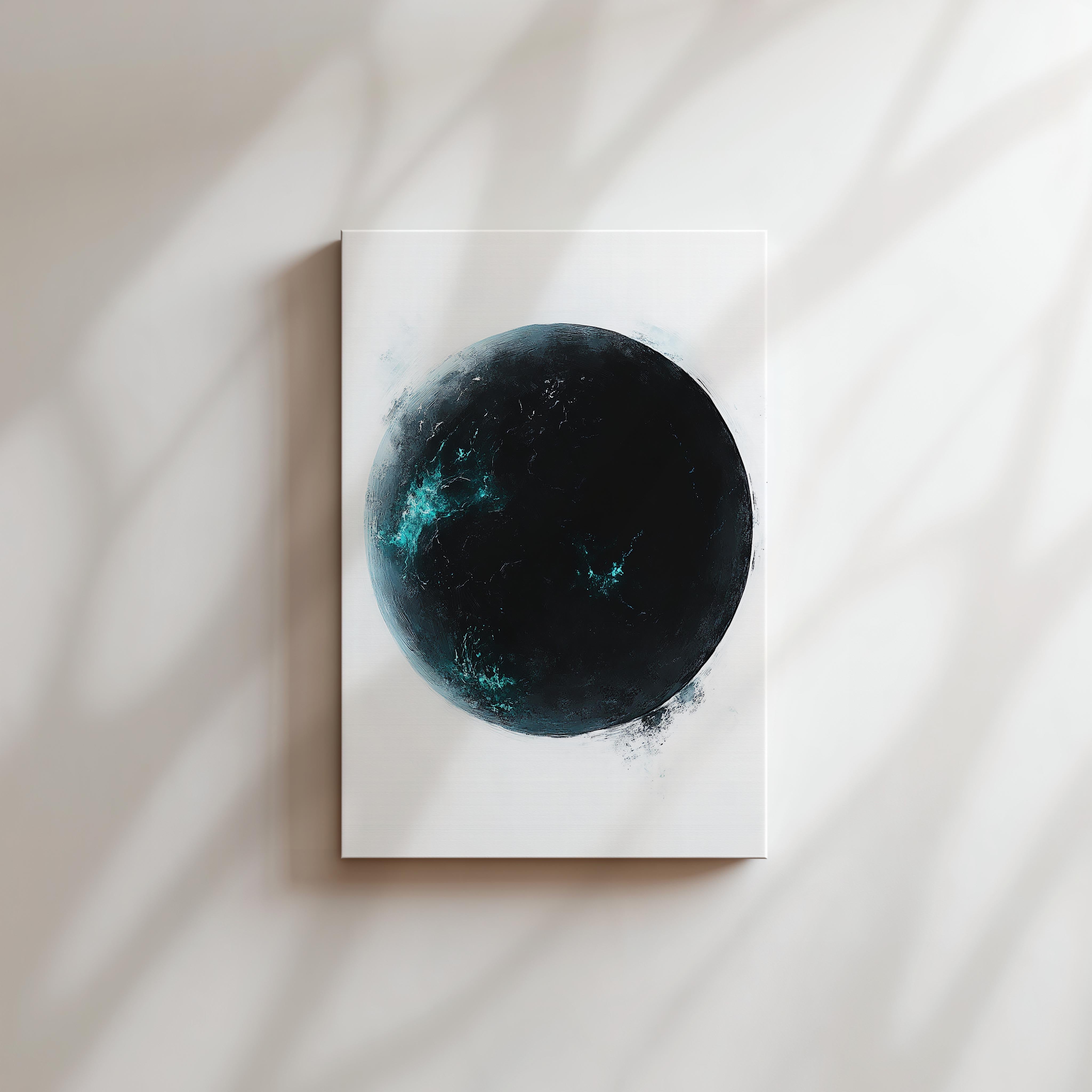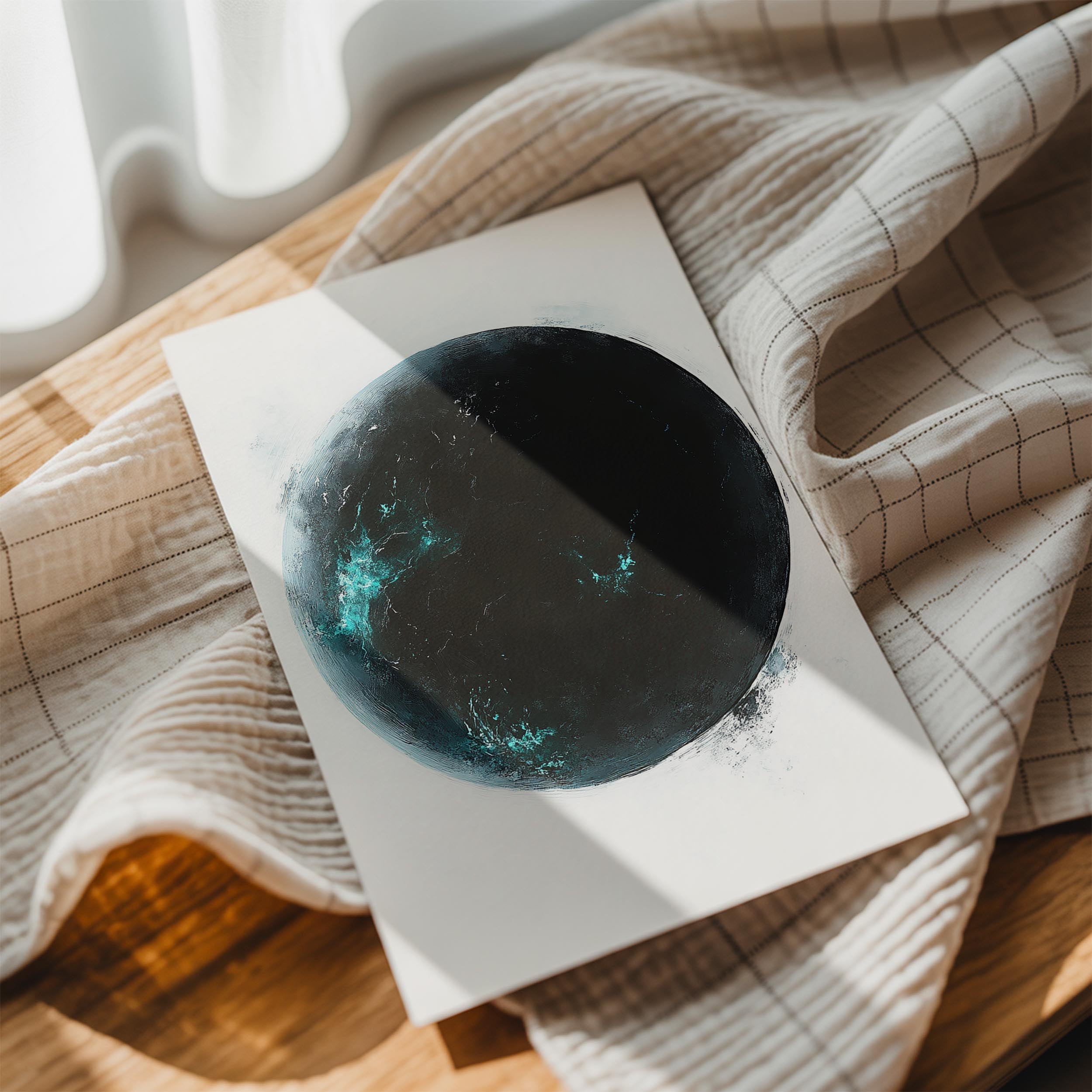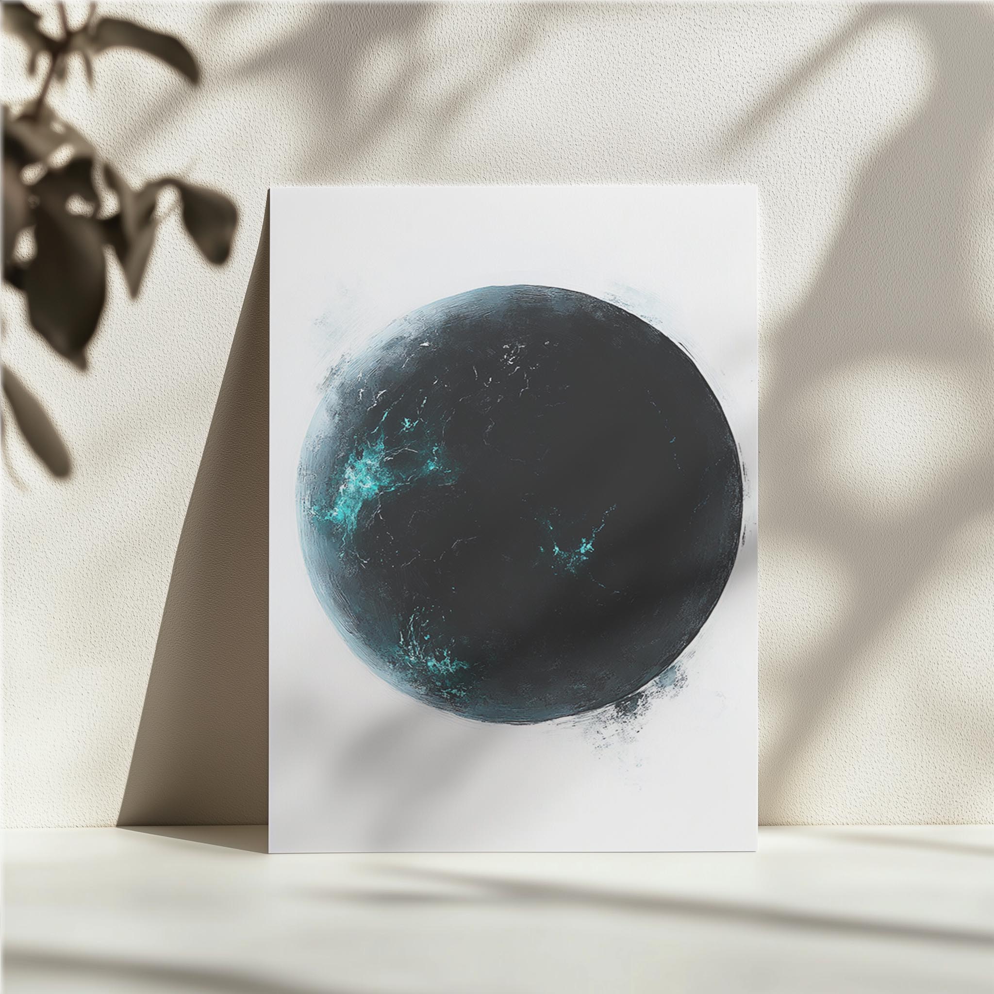 A depiction of a dark celestial void, this artwork presents a mysterious planet with glowing blue highlights that pierce through the darkness. The design hints at the vastness and unknown nature of the universe, captivating viewers with its simplicity and abstract allure. The planet's texture and glow suggest energy and life, making it a profound representation of cosmic mystery. This artwork is perfect for astronomy enthusiasts or anyone with a passion for the wonders of space. It would enhance a study, bedroom, or gallery space with its enigmatic beauty.