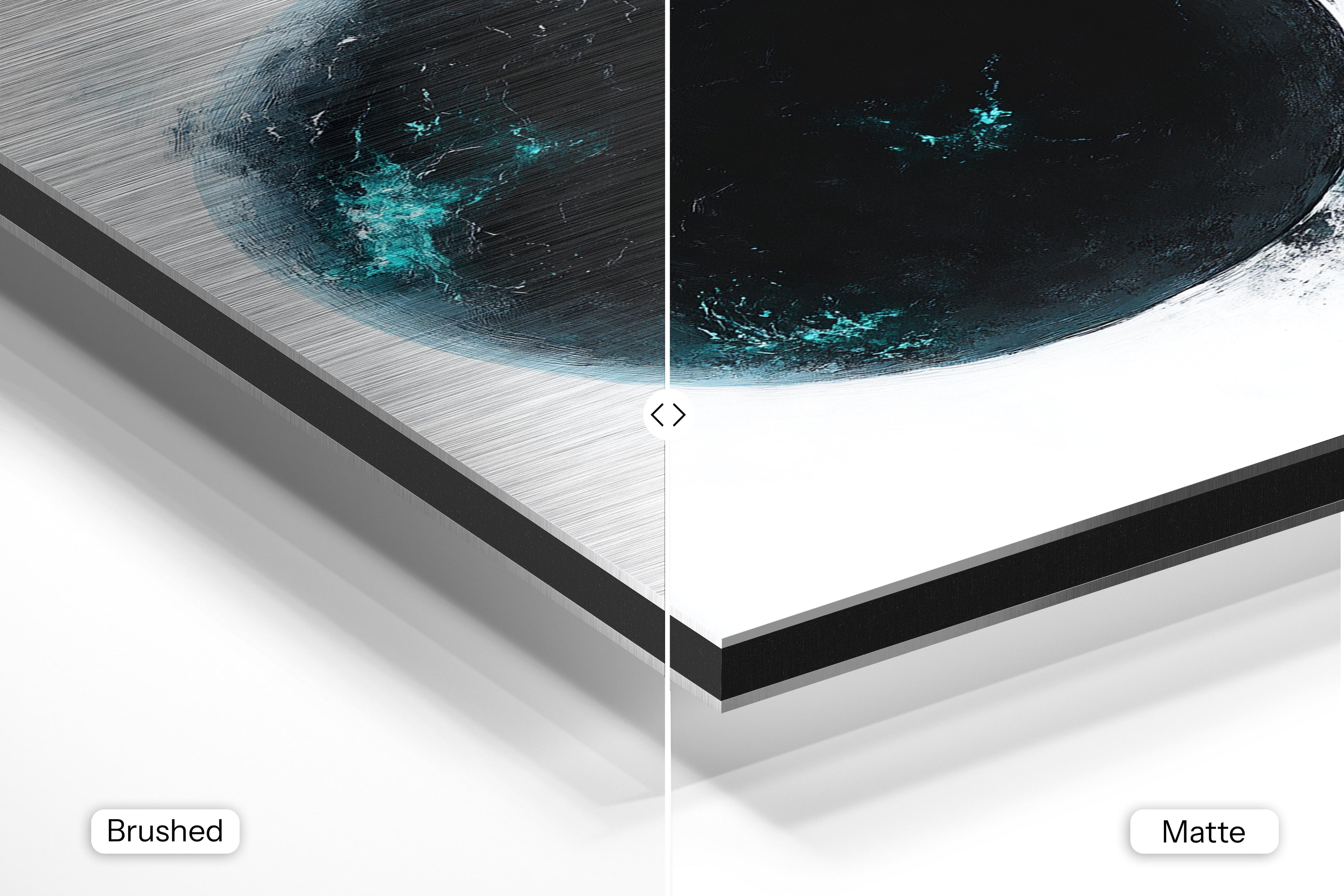 - Brushed Aluminum, on the other hand, features a raw metallic texture with visible brush strokes. Whites and highlights in your image let the silver surface show through, adding a dramatic, shimmering effect. Ideal for black-and-white images, minimalist designs, or abstract art, it creates a bold, industrial vibe with a modern edge.